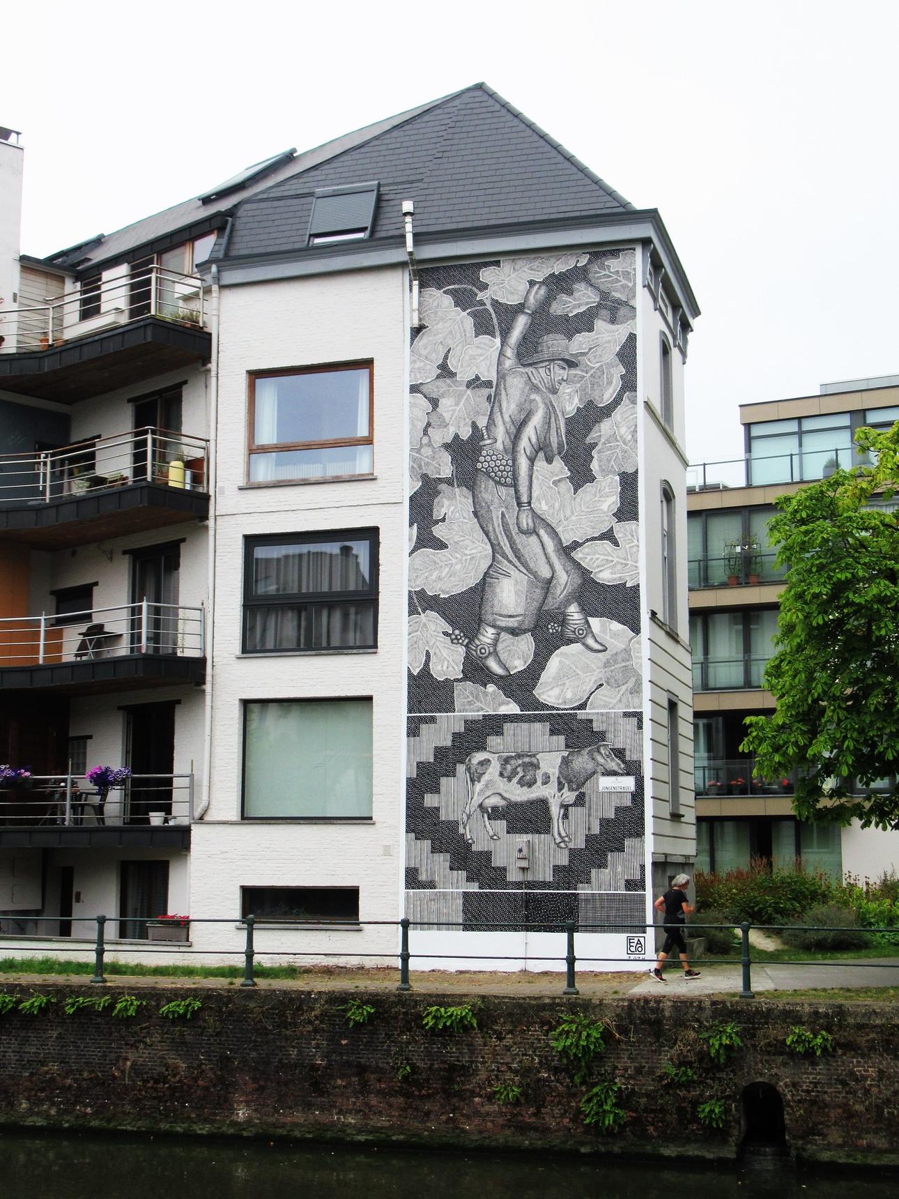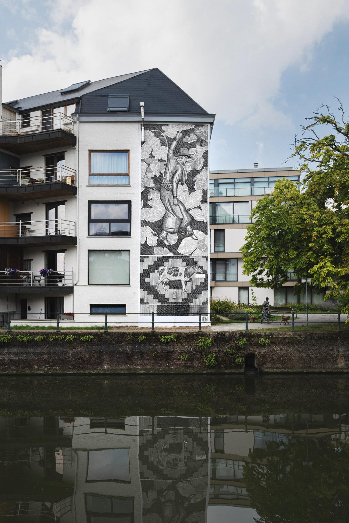 De eerste muurschildering in Gent van deze Argentijnse kunstenaar, die de stad kort bezocht. Je kunt deze muurschildering het beste bekijken vanaf de overkant van het water bij de Achtervisserij. Een paar woorden over dit kunstwerk: