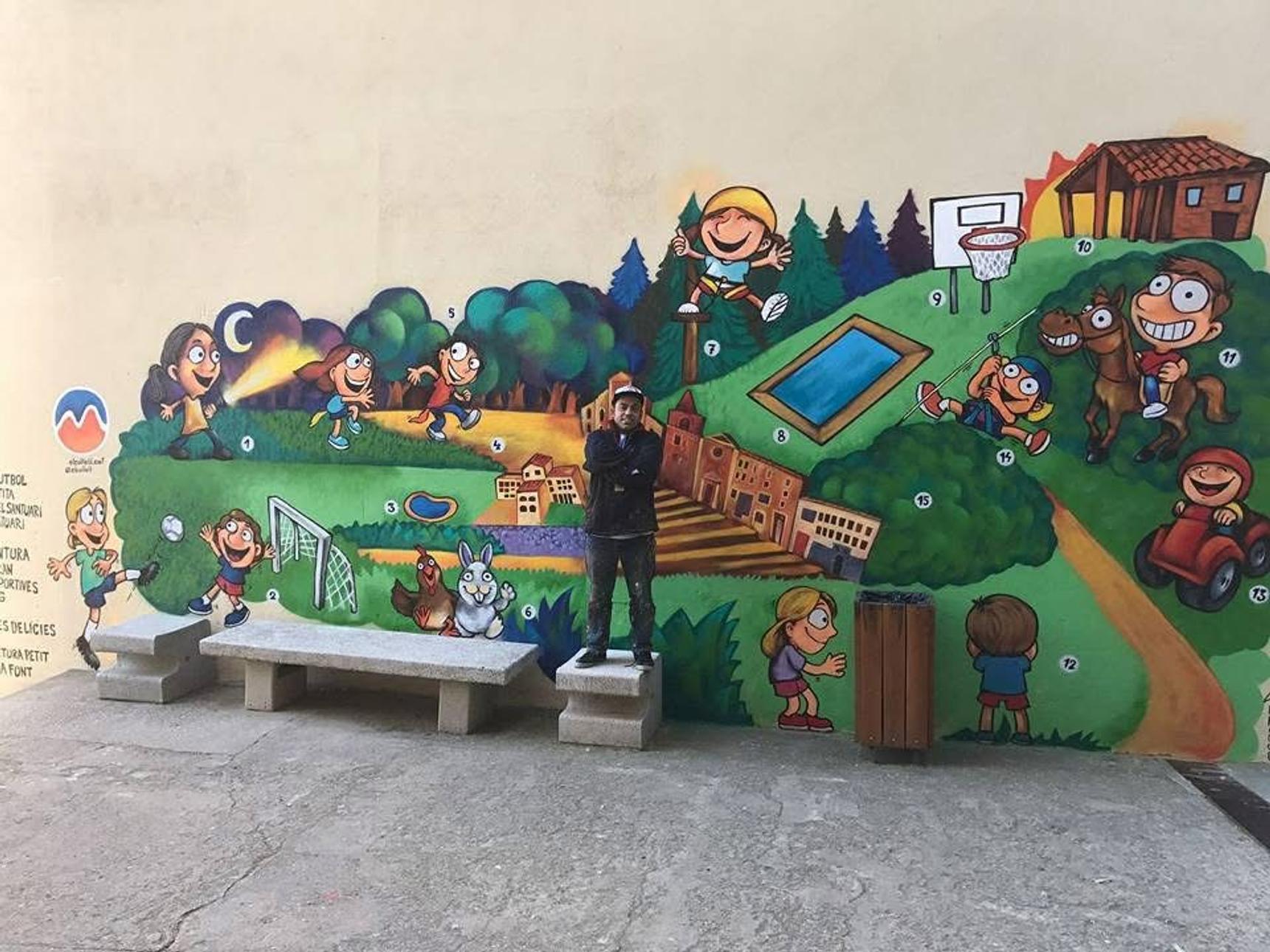 Space for children's recreation areas with many activities: football, swimming pool, suspension bridges, laser tag, quads. The mural serves as a map to show where things are.