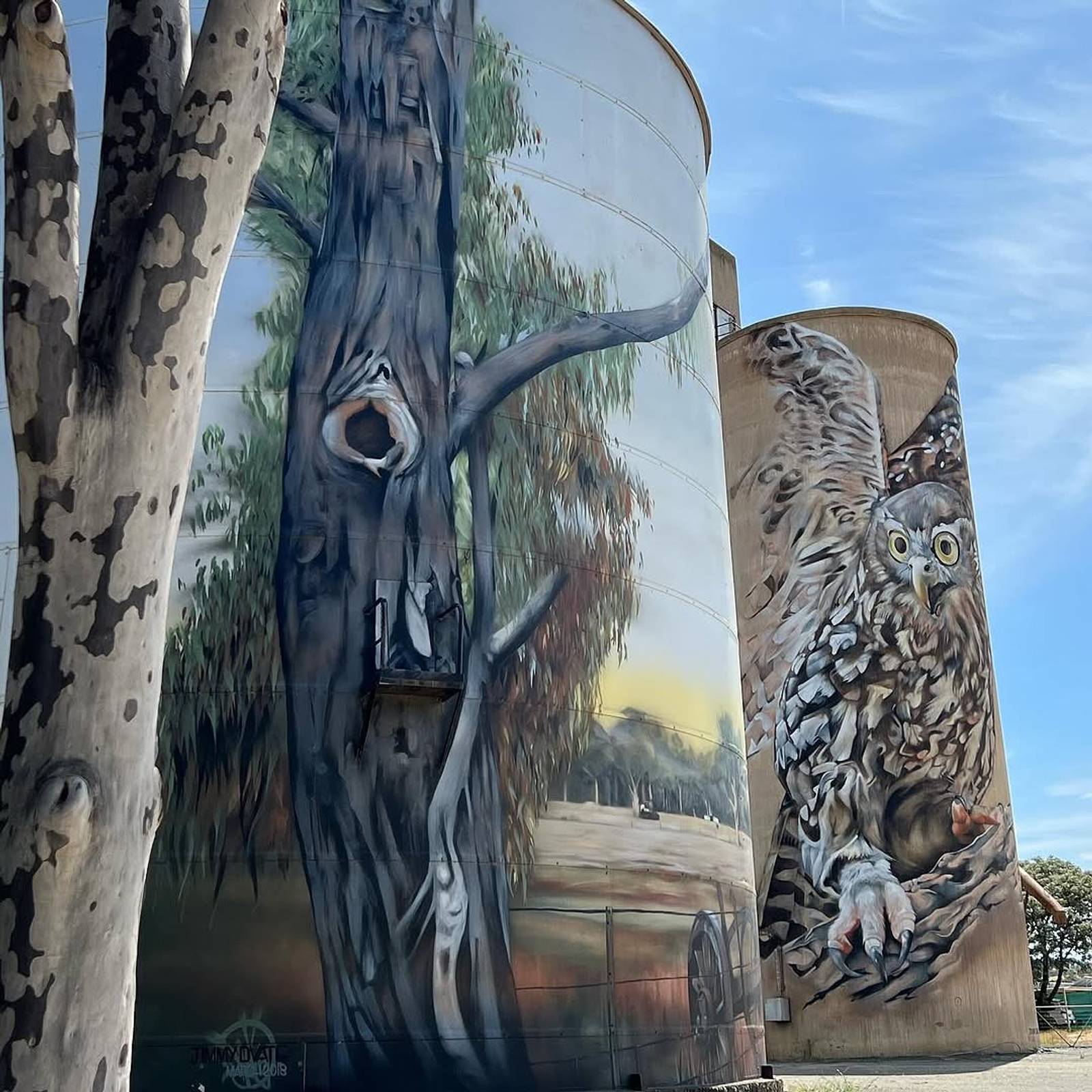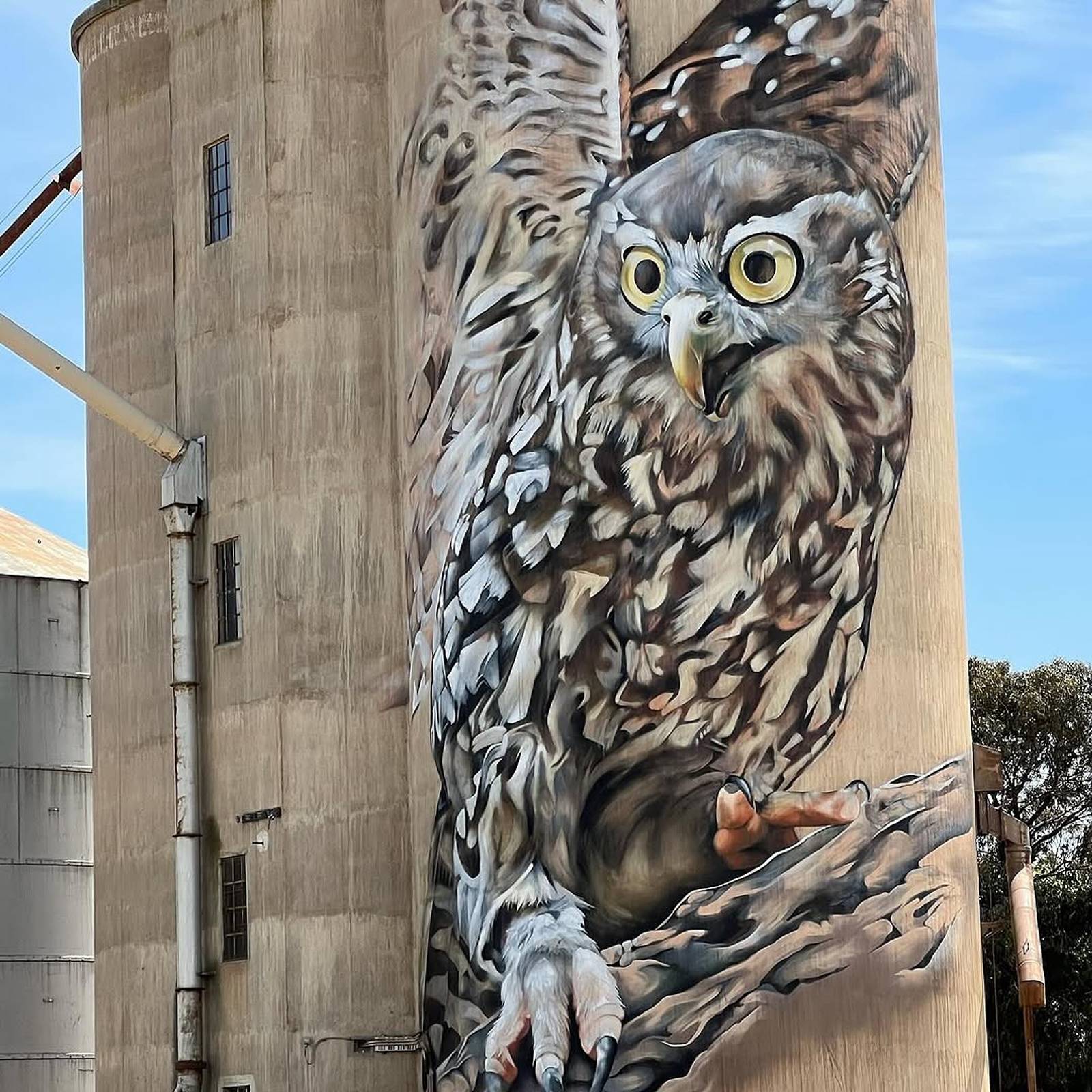 The Goorambat singular tall silo portrays a Barking Owl named Milli, who lives at the Healesville Sanctuary in Badger Creek, Victoria.
