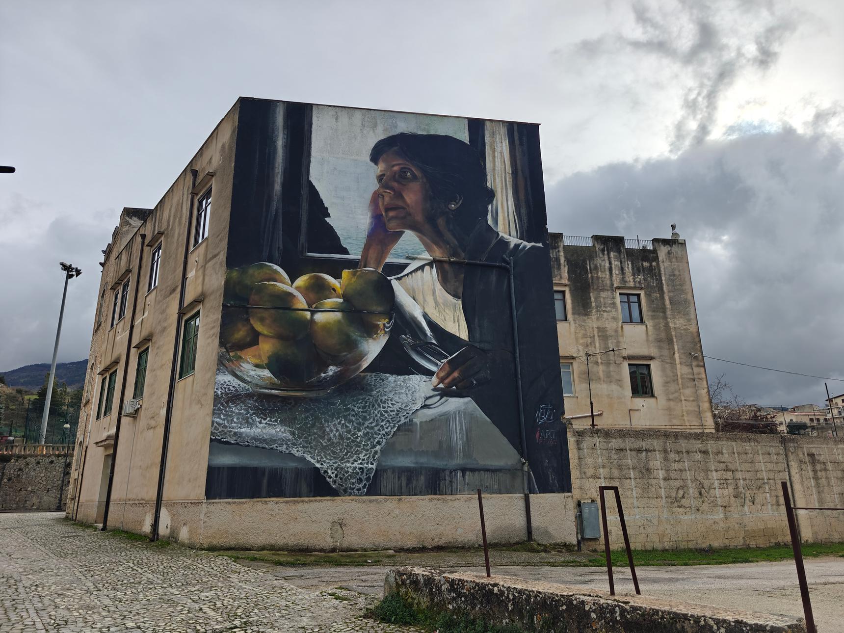 The traditions of Palazzo Adriano, once known for their religious and cultural richness, took on a new dimension of fame in 1998 with the advent of Nuovo Cinema Paradiso. This beautiful town stole the hearts of moviegoers around the globe, and the movies that echo scenes from Tornatoreās masterpiece have transformed the town into a living canvas of memory and longing. Neveās portrayal of Salvatoreās mother, who carries the weight of Alfredoās death and the anticipation of her sonās return, transcends the story to speak to the universal experience of mothers waiting for their faraway children. Mothers who cultivate this emotion daily, who fuel homesickness. Her longing is palpable, her eyes intense with a mix of pain and hope. The lemons, glowing with the warmth of the Sicilian sun, frame her figure, anchoring her in the rich soil of her home land. This artwork is more than a tribute, itās a meditation on the themes of departure and return, the ceaseless rhythm of absence and presence. Invaded by an emotional appeal, we experience the certainty that, despite distance and time, cultural and family roots remain a safe and welcoming refuge.