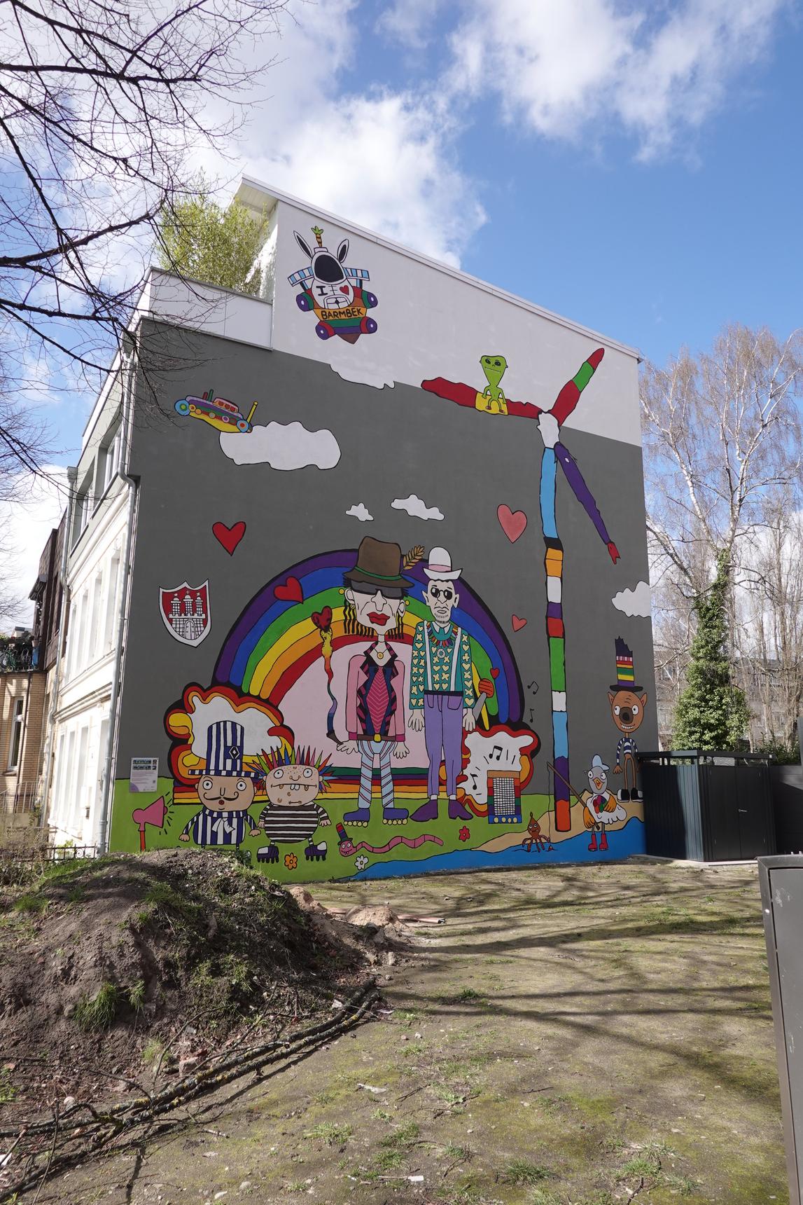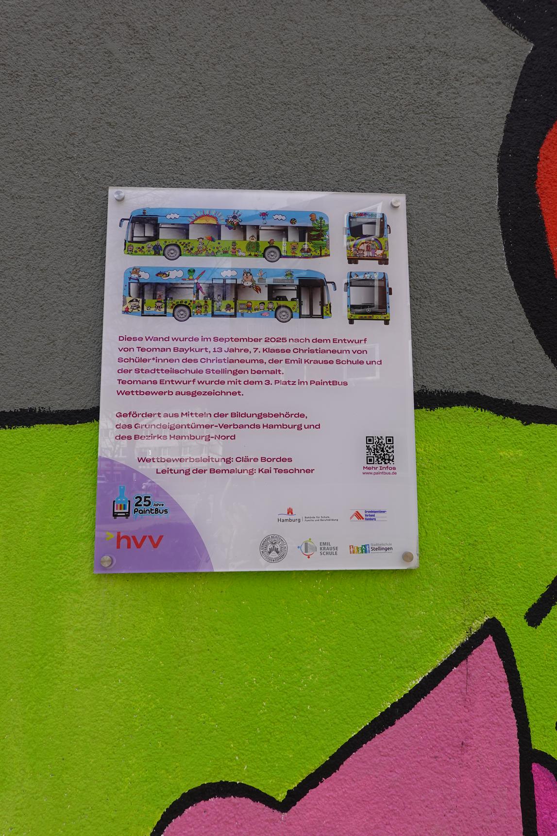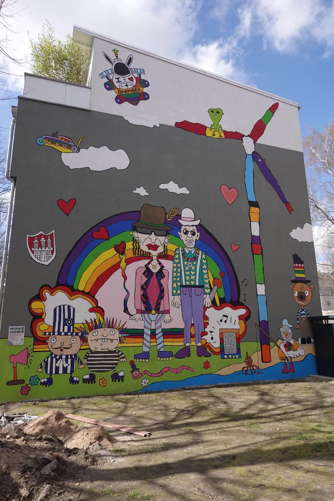 The Department of Education is announcing the “PaintBus” contest and offering schools the opportunity to design Hamburg HVV buses. Sometimes a design is also created on a wall. Here, the student Teoman Baykurt drew the sketch, and the mural was created together with other students under the guidance of Kai Teschner in September 2025. The figures in the center depict Udo Lindenberg (rock legend) and the musician Jan Delay. The little striped figures represent the two Hamburg soccer clubs, HSV and FC Sankt Pauli.