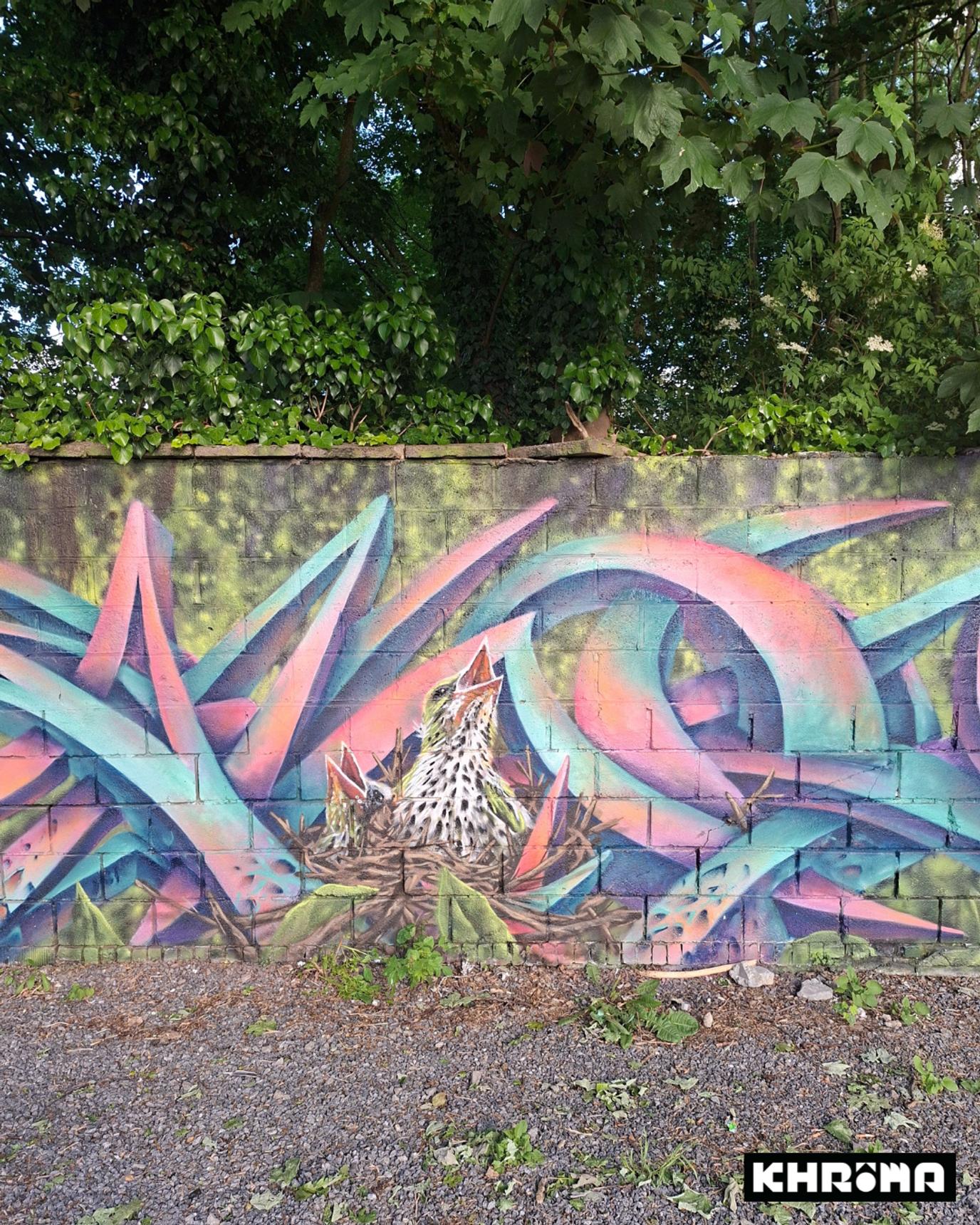 Mural by Salö for the Khrôma exhibition at the former Hannut swimming pool.
