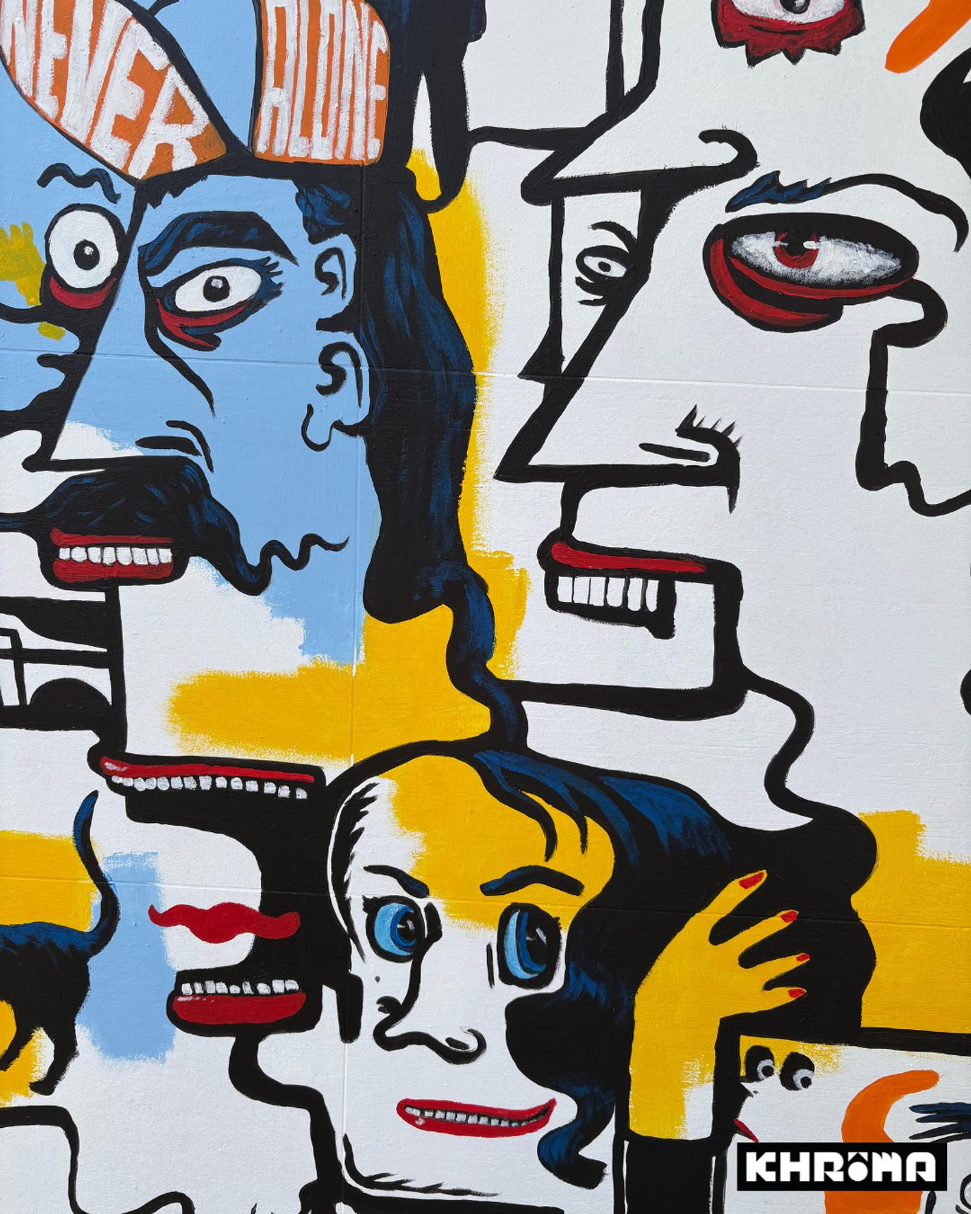 His style is unmistakable, combining dynamic lines, expressive characters and rich details. The artist draws on folk imagery and everyday scenes to create vibrant and opulent compositions, in which every corner of the wall seems to tell its own story.