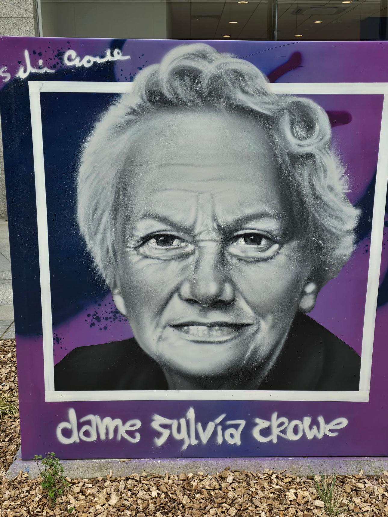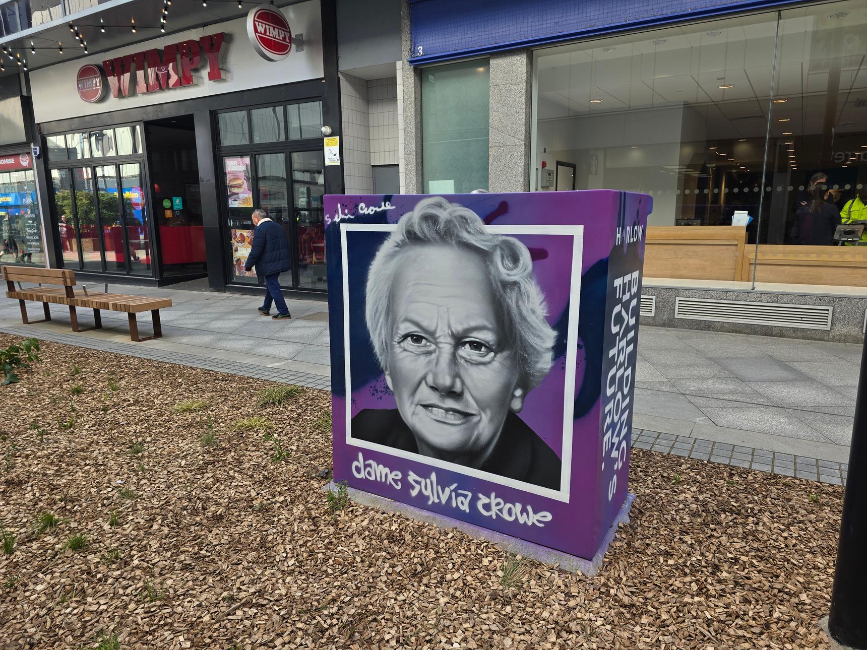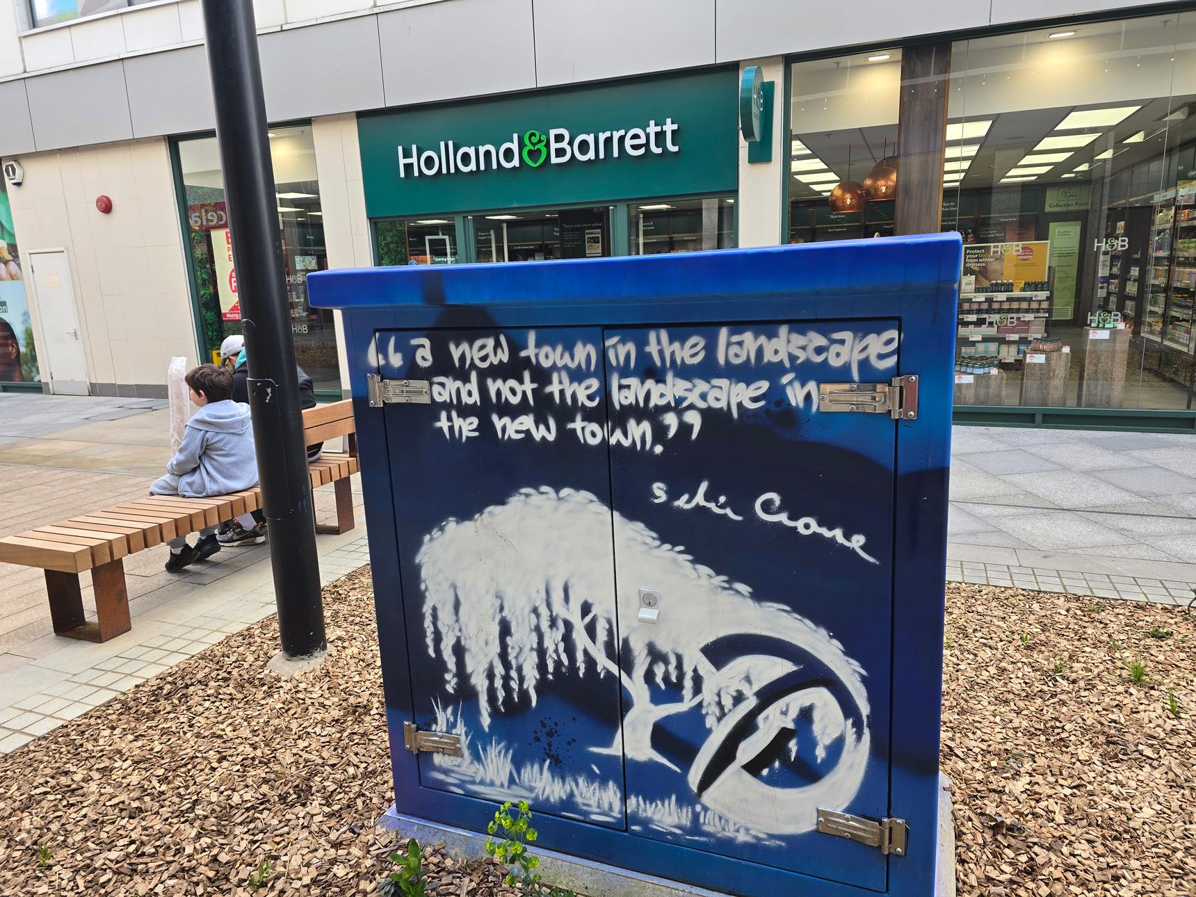 Painted junction box, depicting Dame Sylvia Crowe, the landscape architect who worked on Harlow's Landscape Master Plan between 1948 and 1958