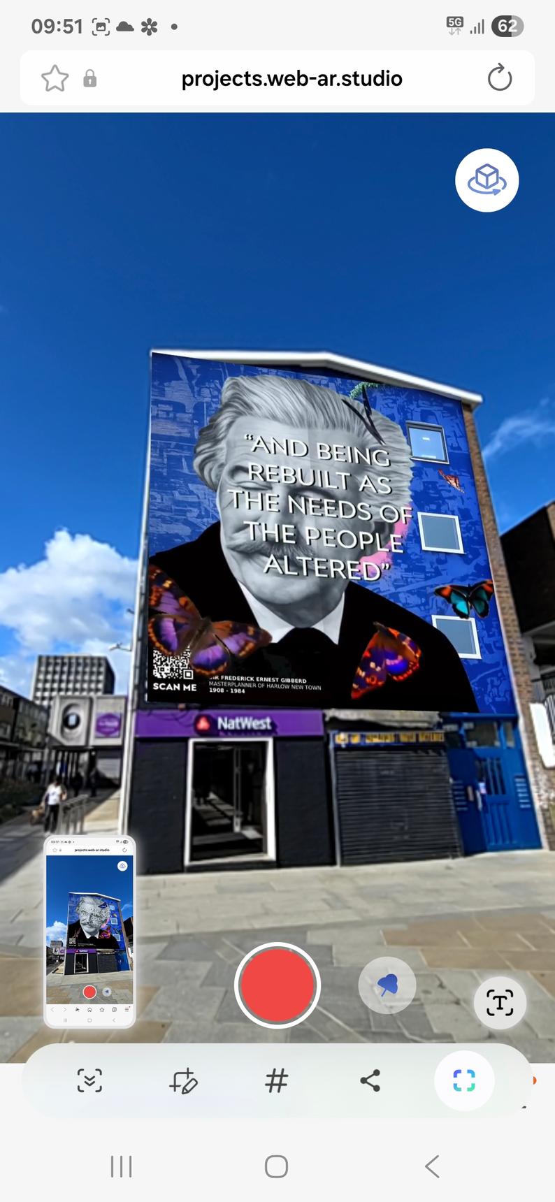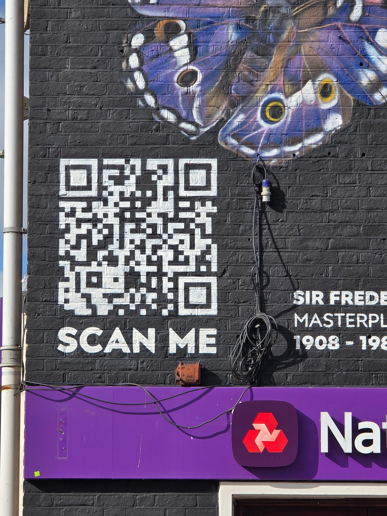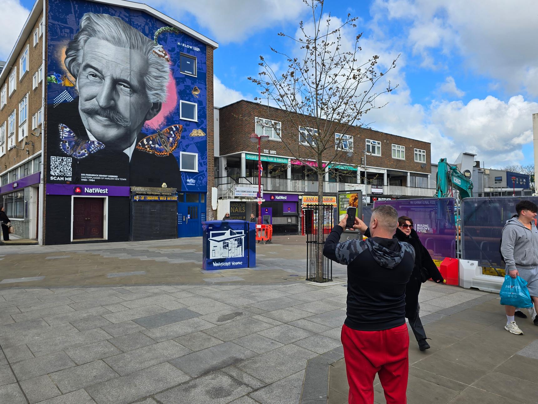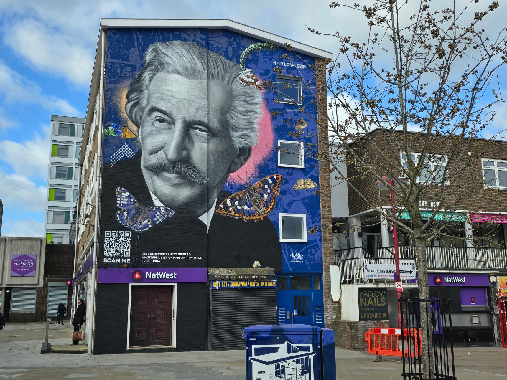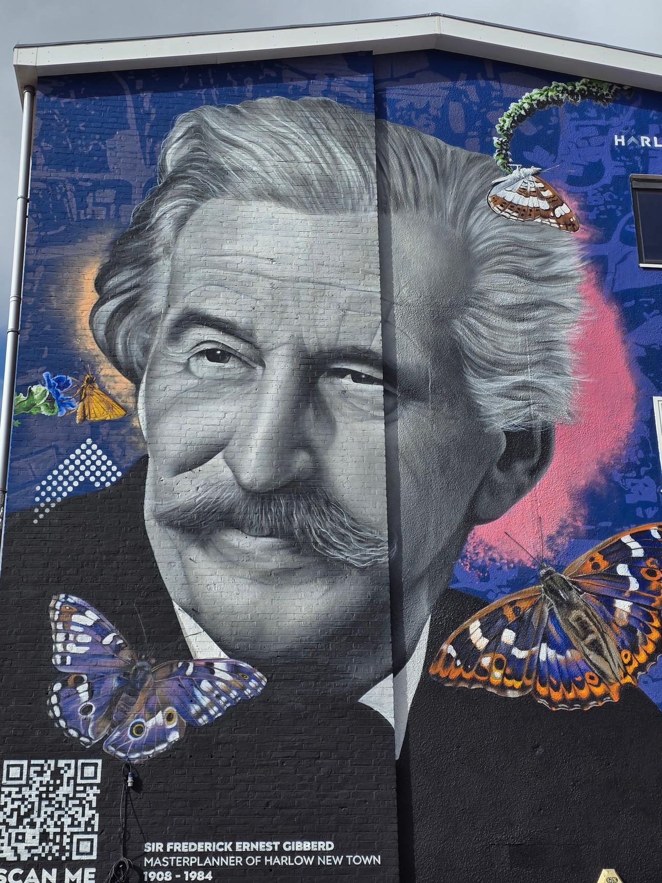 This mural of Sir Frederick Ernest Gibberd was created by MurWalls. It also has an AR experience for you. Scan the QR code, go to the website, and view the mural through that page. The mural will come to life, and you will see a quote from Sir Frederick that explains why Harlow has a strong connection with butterflies.
