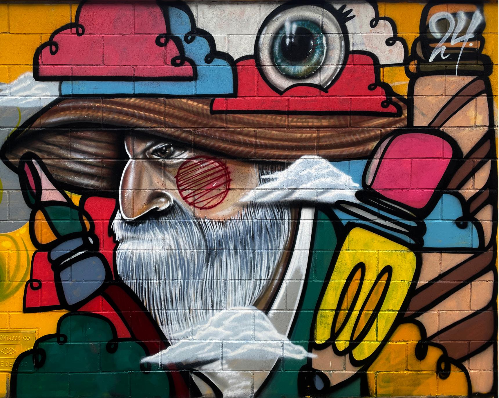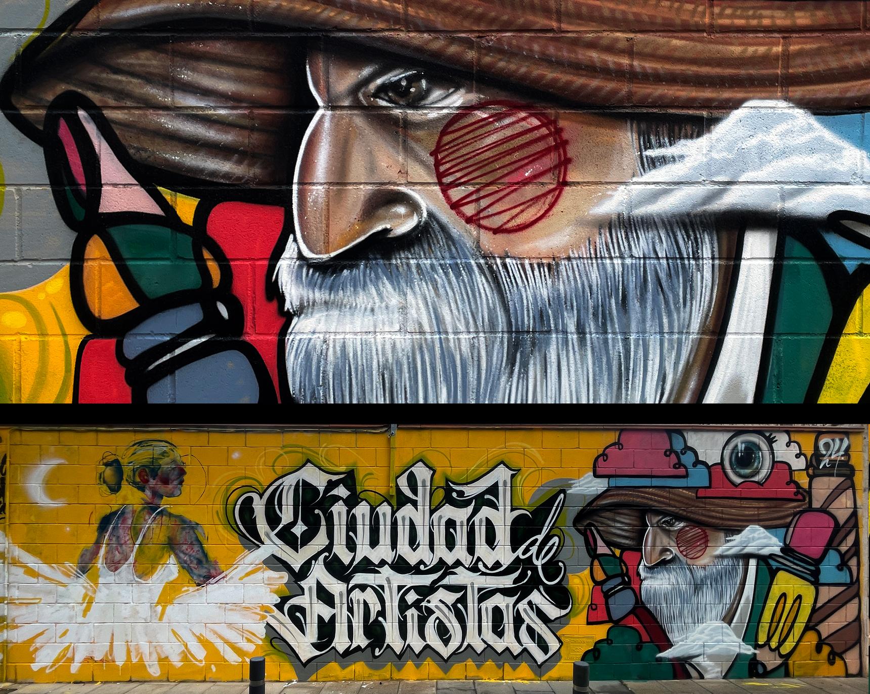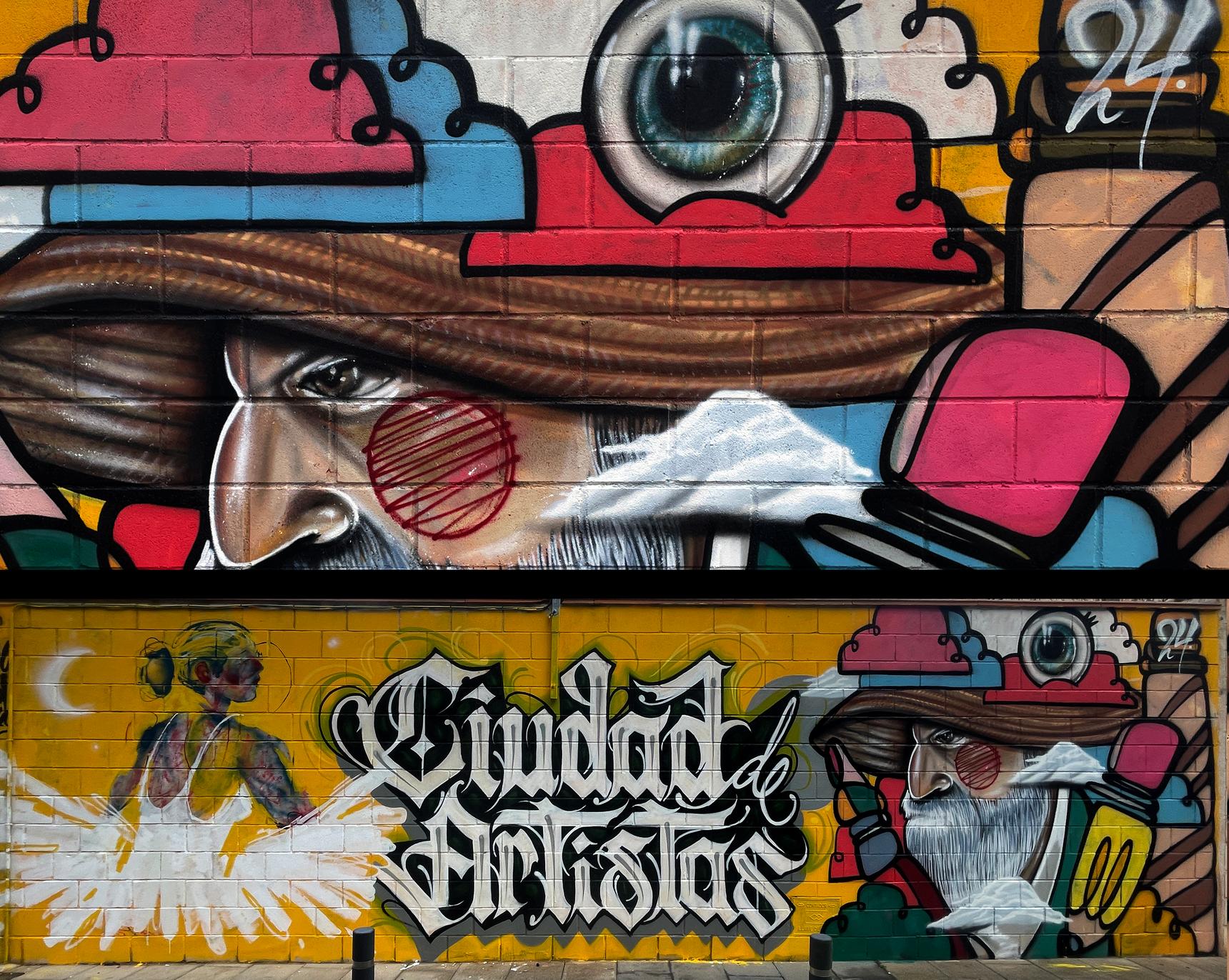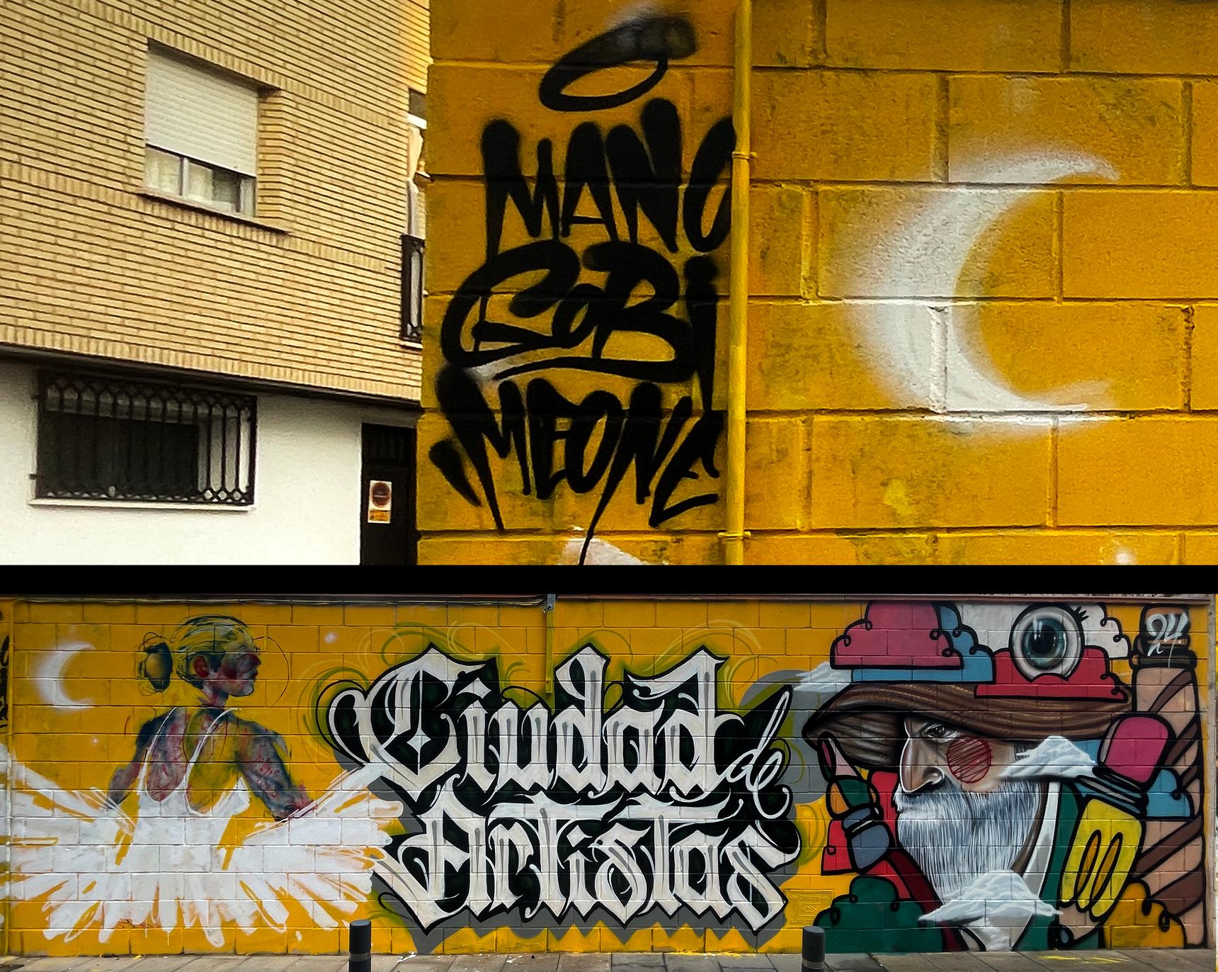 Mural realizado por los artistas MeOne, Gobi y Mano en Tomelloso enfatizando la idea de Tomelloso ciudad de artistas