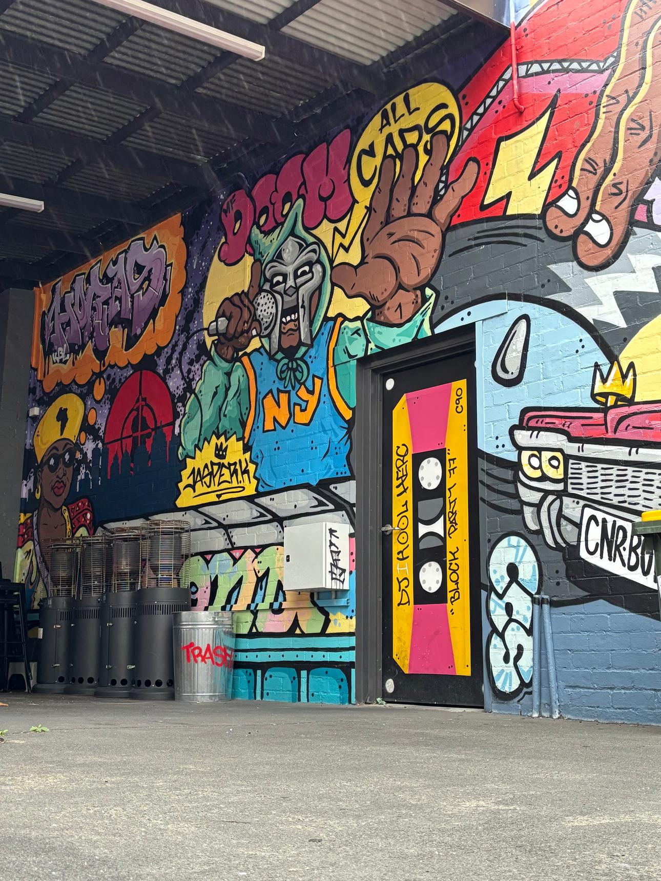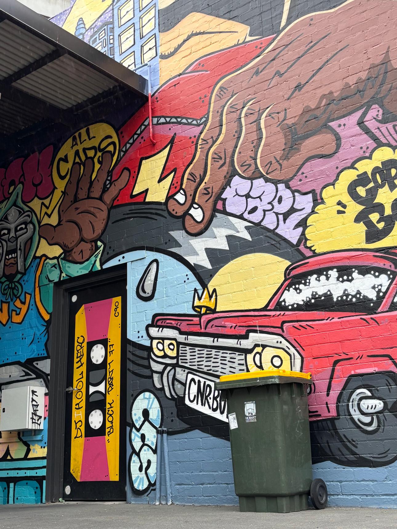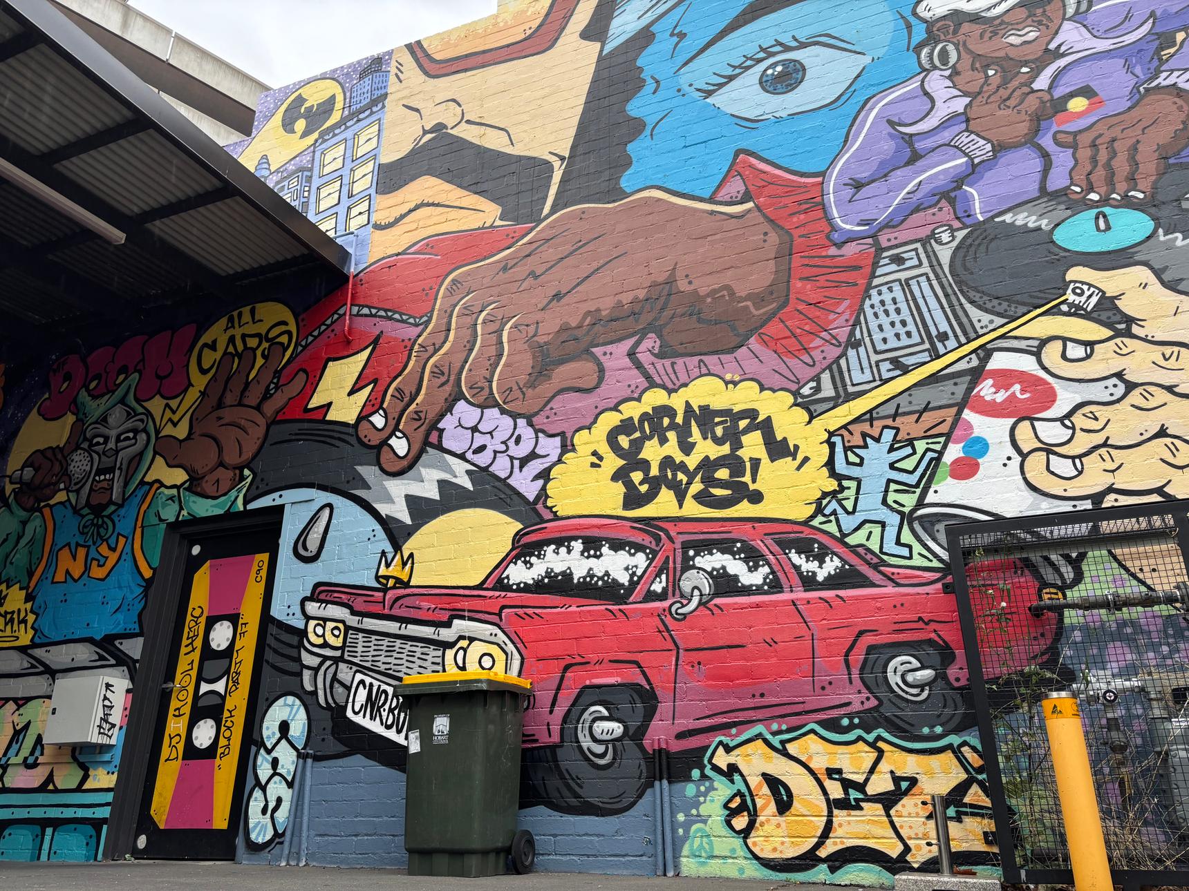 This large-scale mural by Hobart-based street artist Jasper Kelly bursts with colour, rhythm, and hip-hop influence. Oversized hands, a DJ spinning vinyl, classic cars, and city skylines collide in a bold, comic-style composition that celebrates street culture, music, and community. The work transforms the space into an energetic visual narrative rooted in urban life and creative expression.