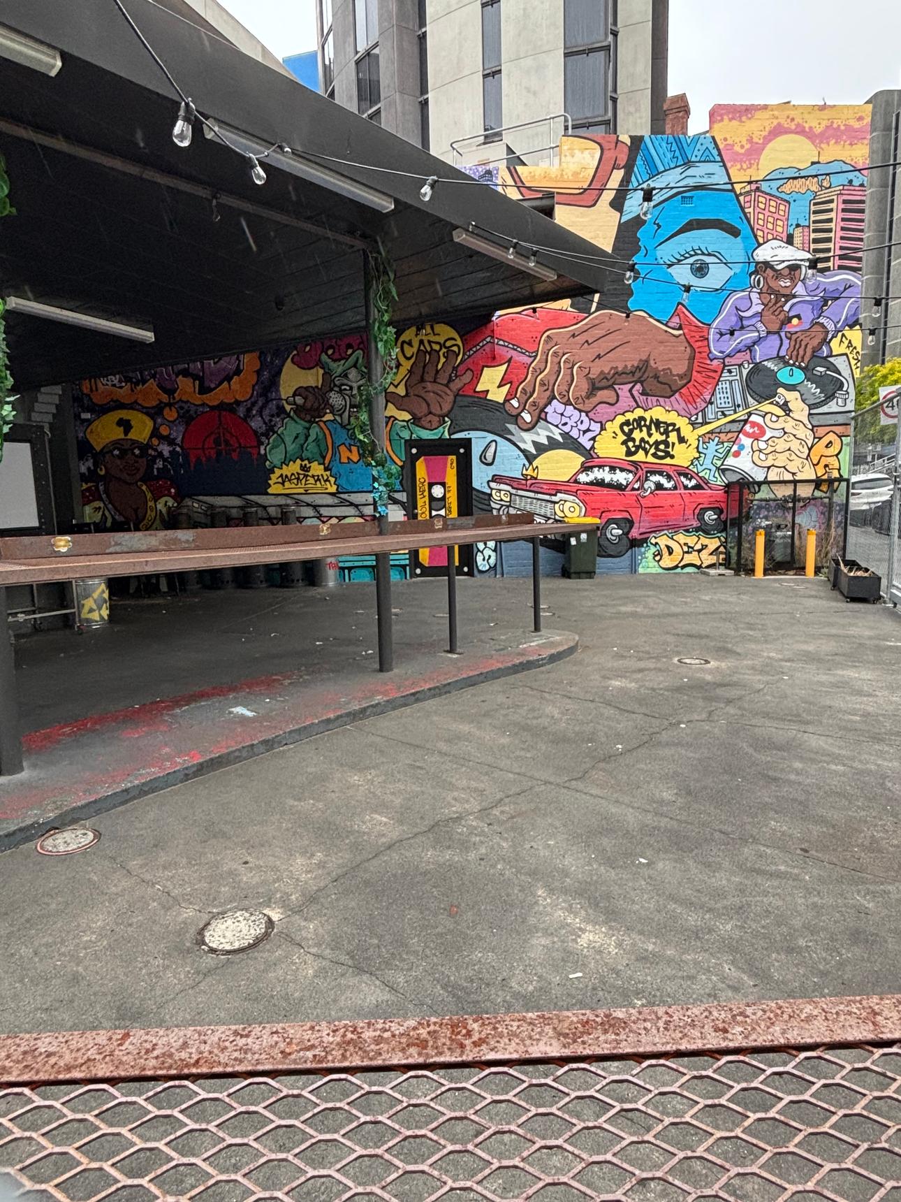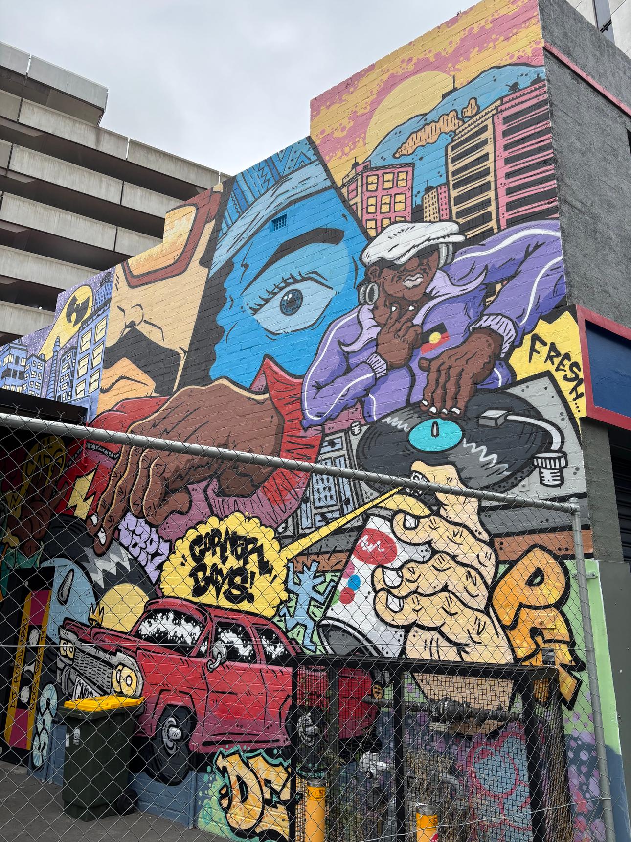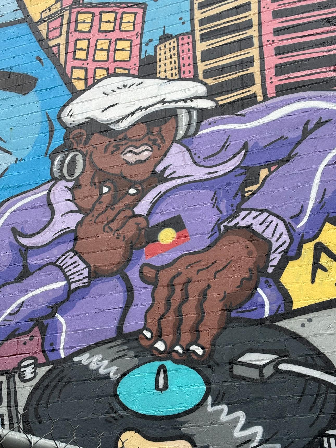 This large-scale mural by Hobart-based street artist Jasper Kelly bursts with colour, rhythm, and hip-hop influence. Oversized hands, a DJ spinning vinyl, classic cars, and city skylines collide in a bold, comic-style composition that celebrates street culture, music, and community. The work transforms the space into an energetic visual narrative rooted in urban life and creative expression.
