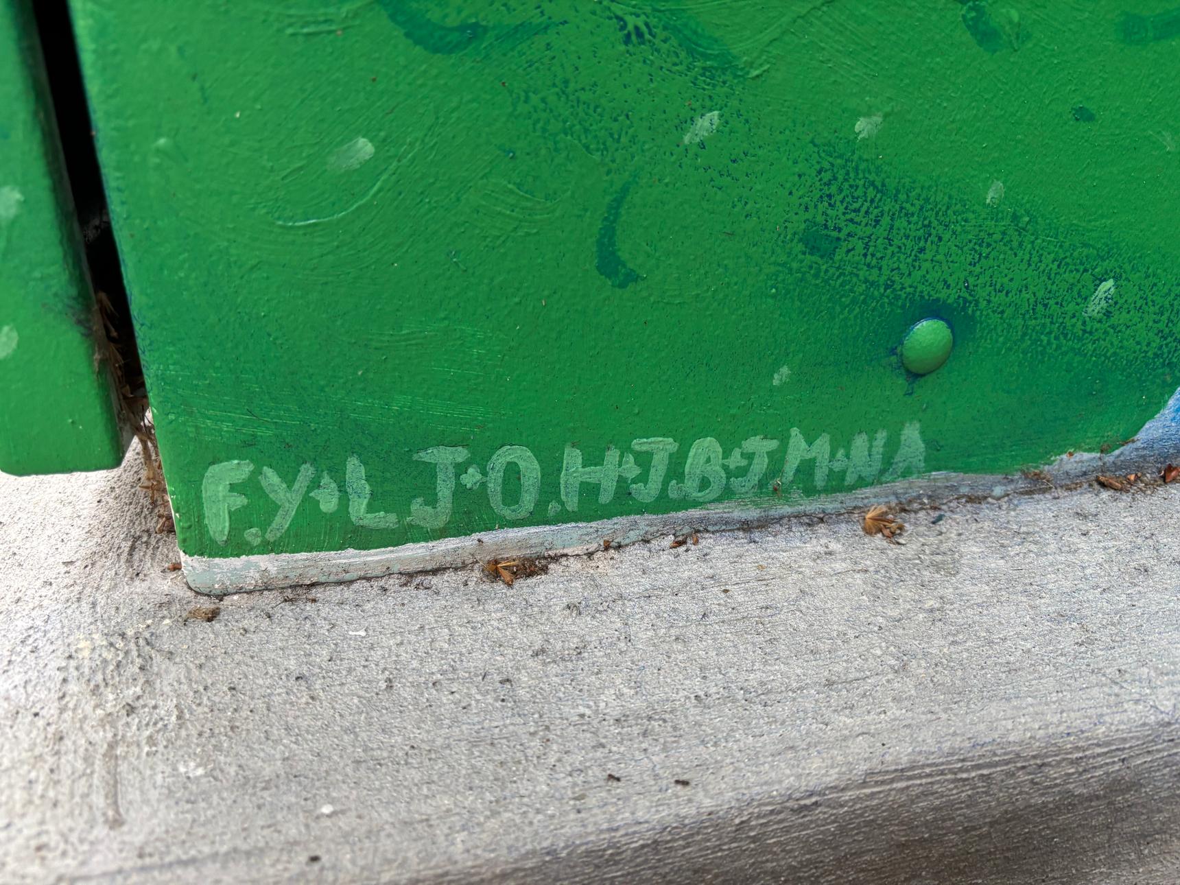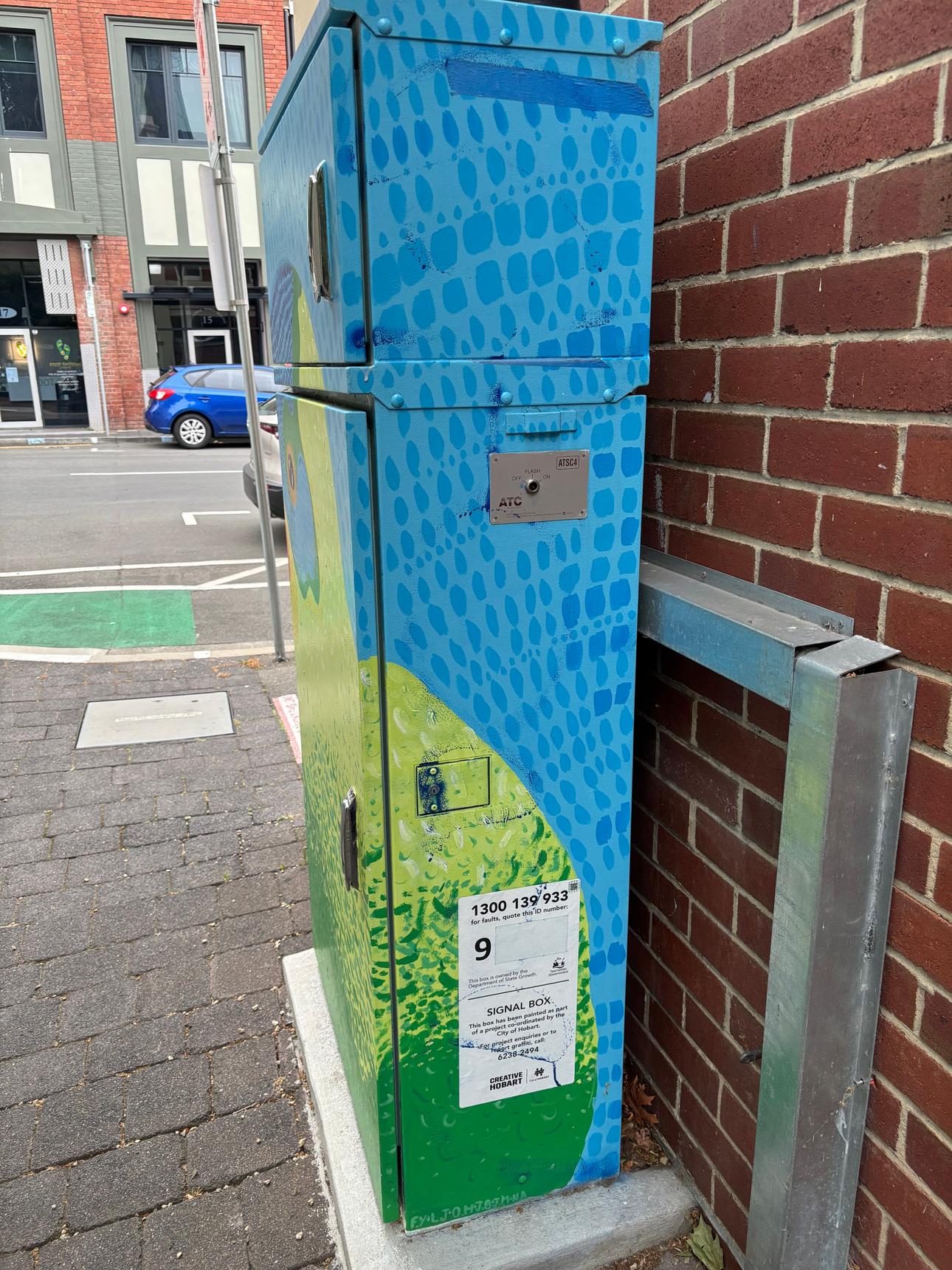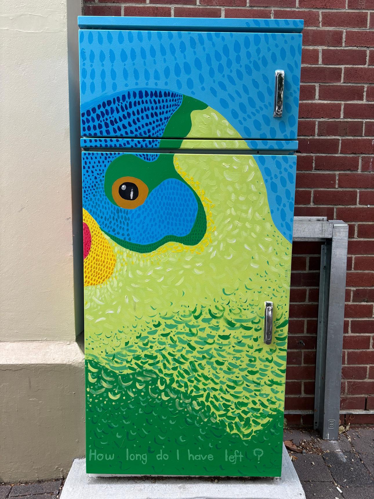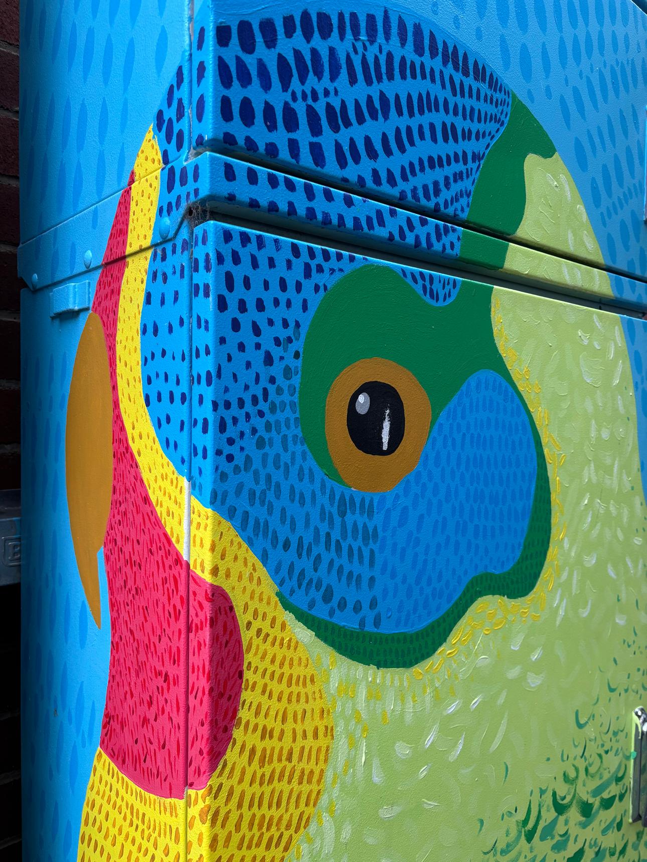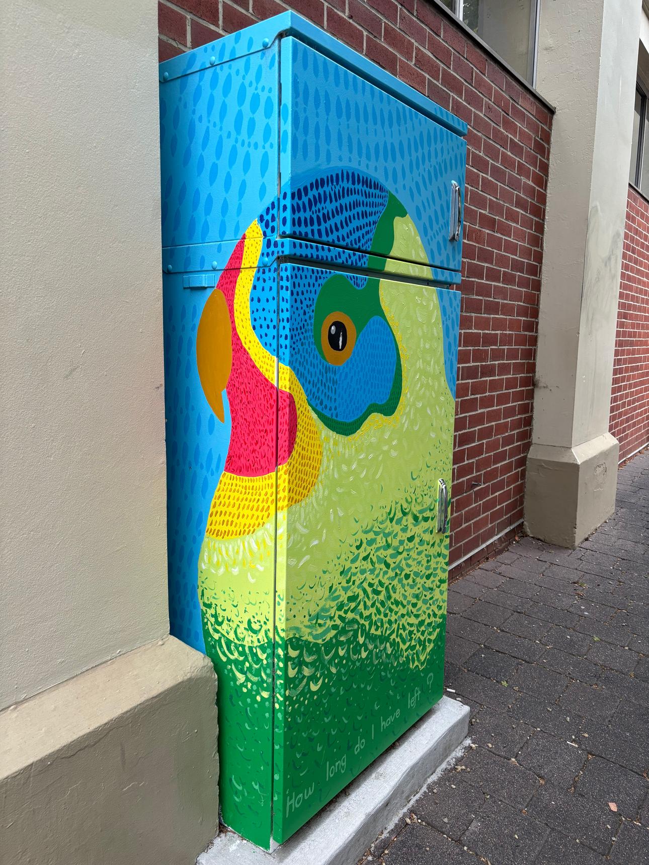 This painted traffic signal box appears to be a collaboration between artists, blending bold pattern work with a vibrant, close-up portrait of a parrot. Layered textures, dotted marks, and bright colour transitions create a playful yet reflective piece, finished with the handwritten question: “How long do I have left?” – inviting pause and contemplation in the everyday streetscape.