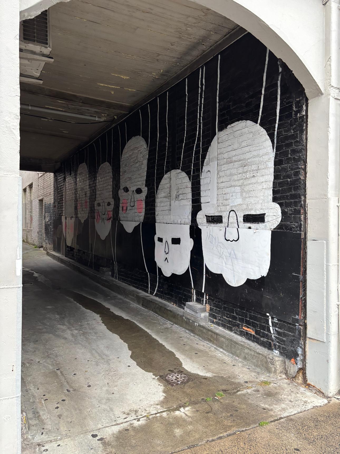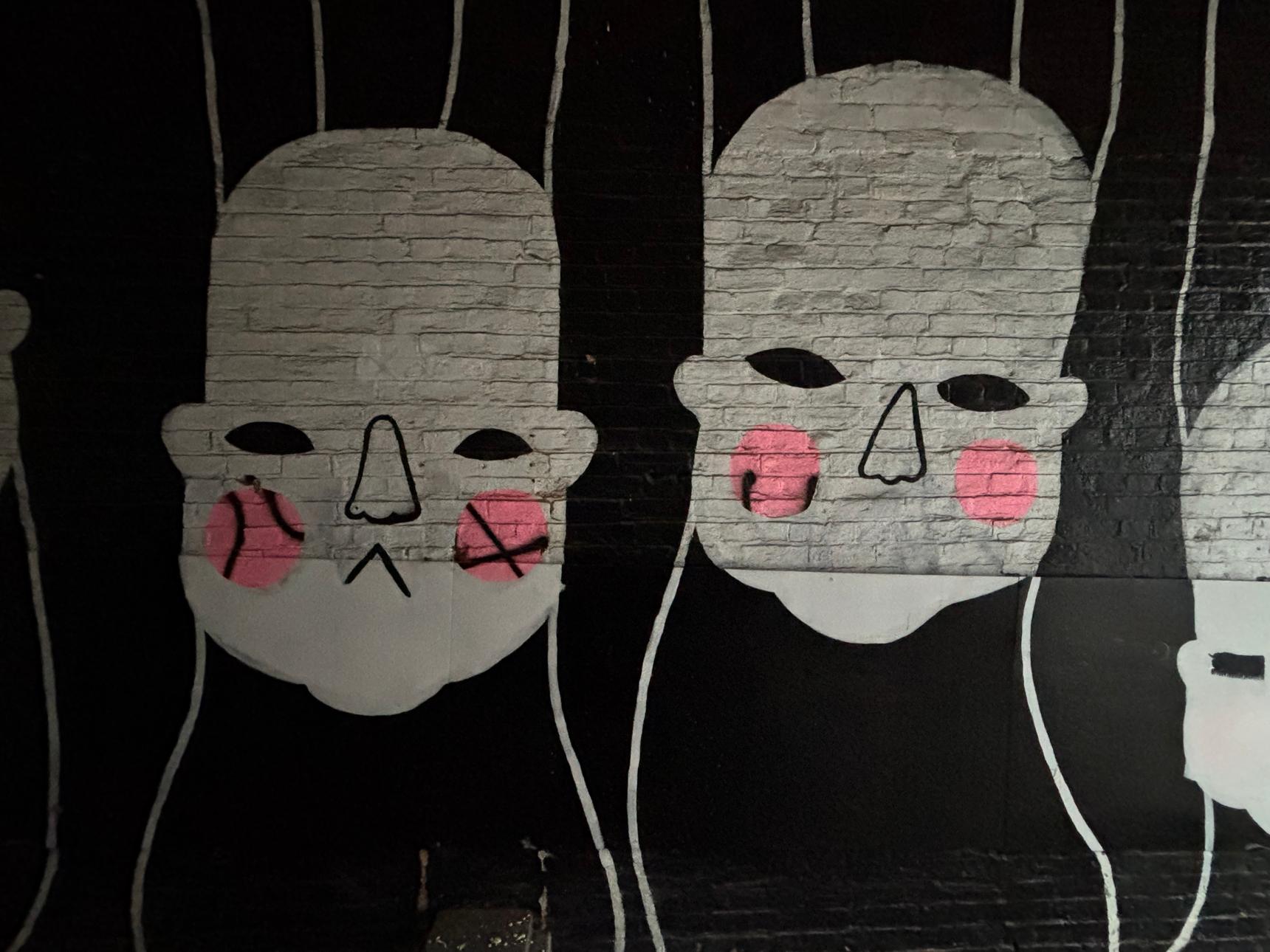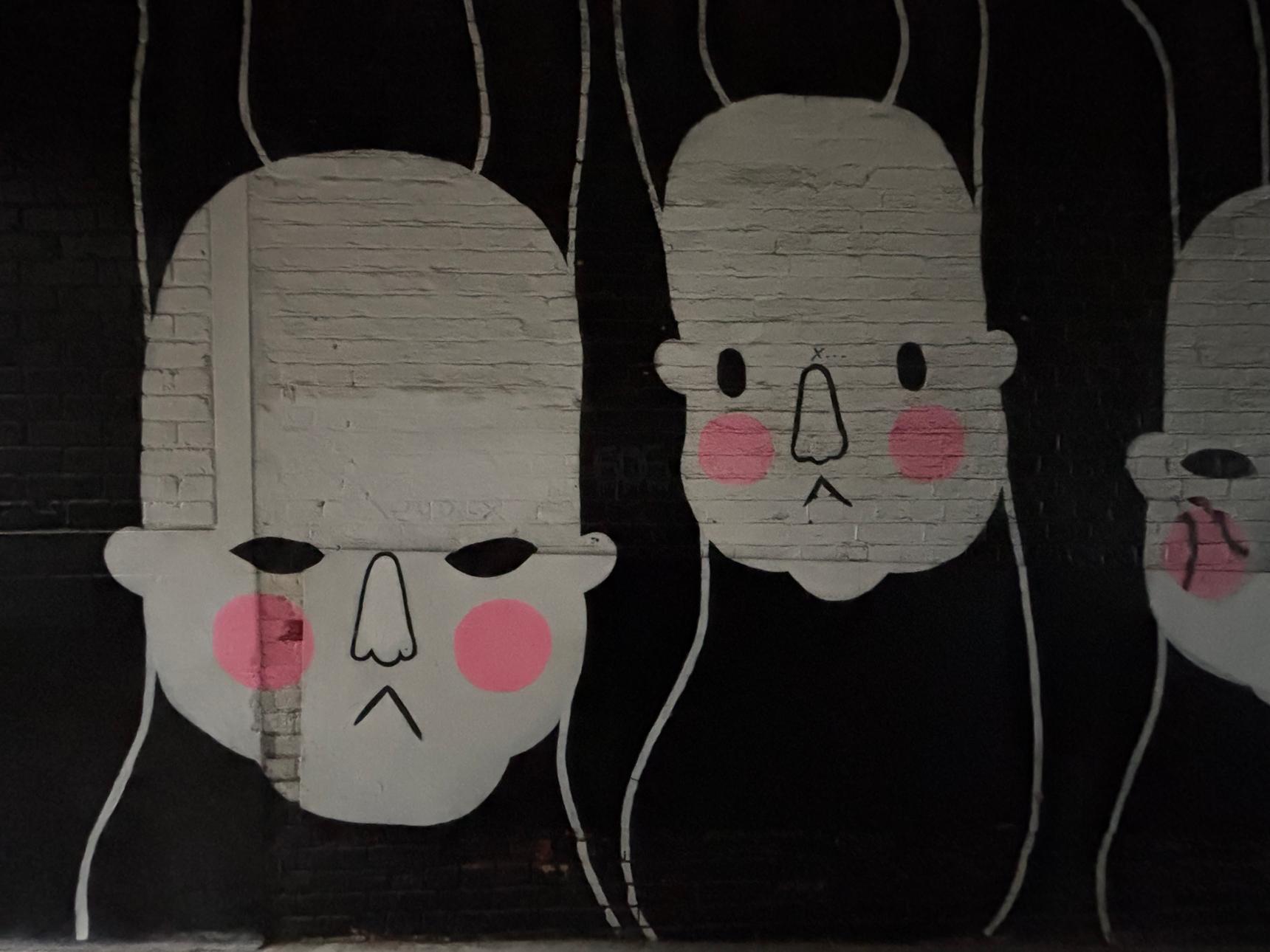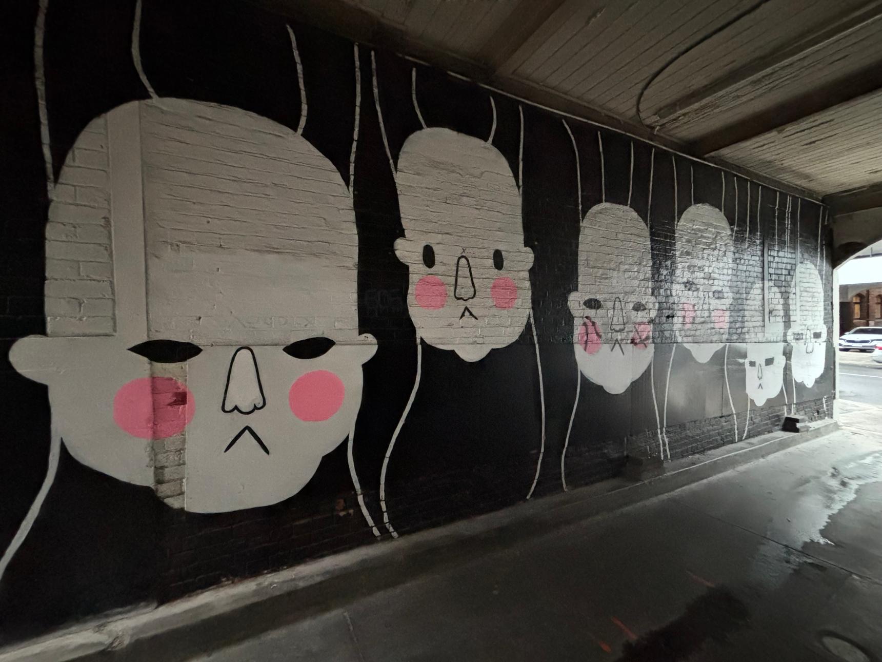 This striking mural lines a narrow underpass with a repeating sequence of pale, mask-like faces set against a deep black background. Each face is rendered simply – heavy-lidded eyes, long noses and soft pink cheeks – creating a quiet, almost solemn rhythm as you move through the space.