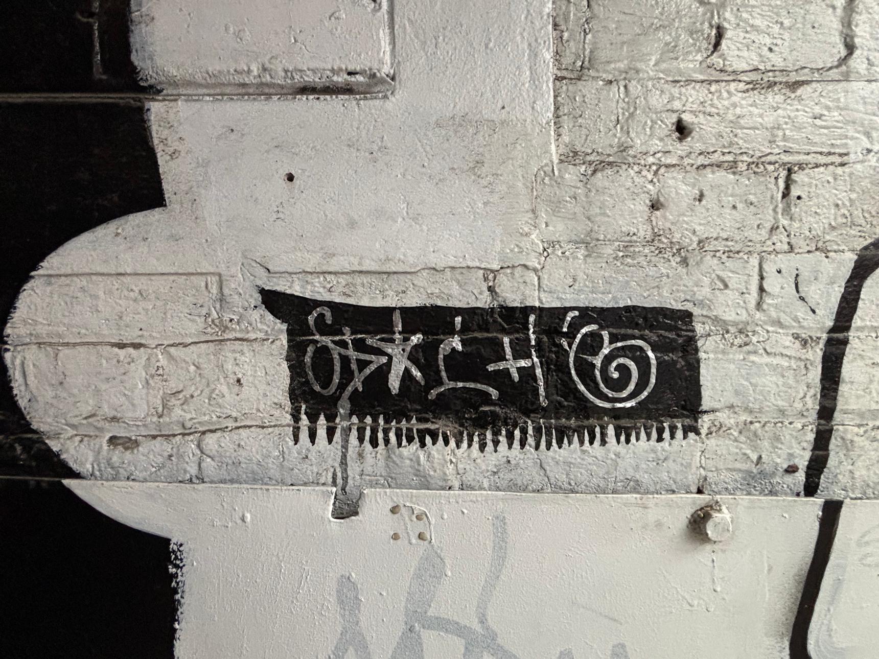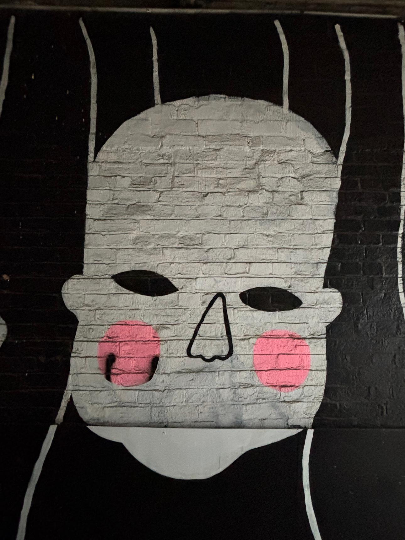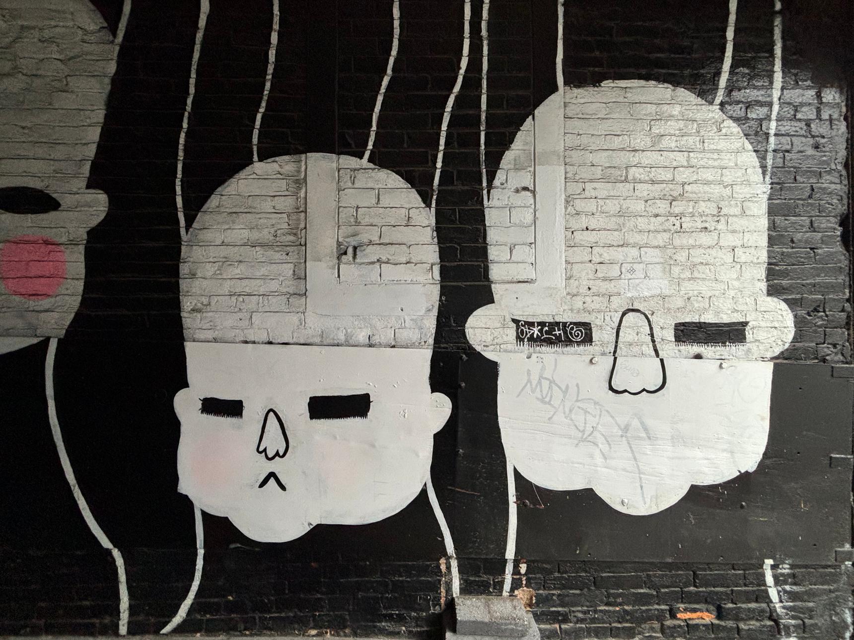 The limited palette and raw brick texture give the work a haunting, introspective feel. As you walk beneath the archway, the mural turns the passage into a moment of pause, prompting reflection on identity, anonymity, and being seen while moving through the city.