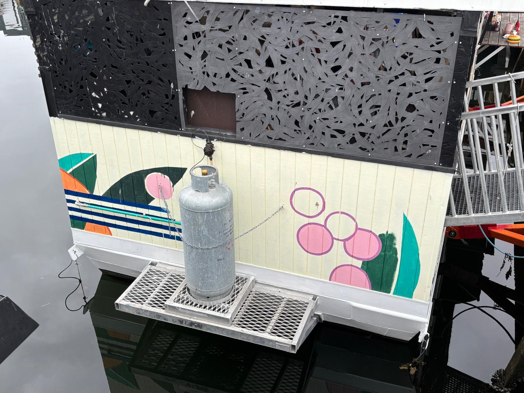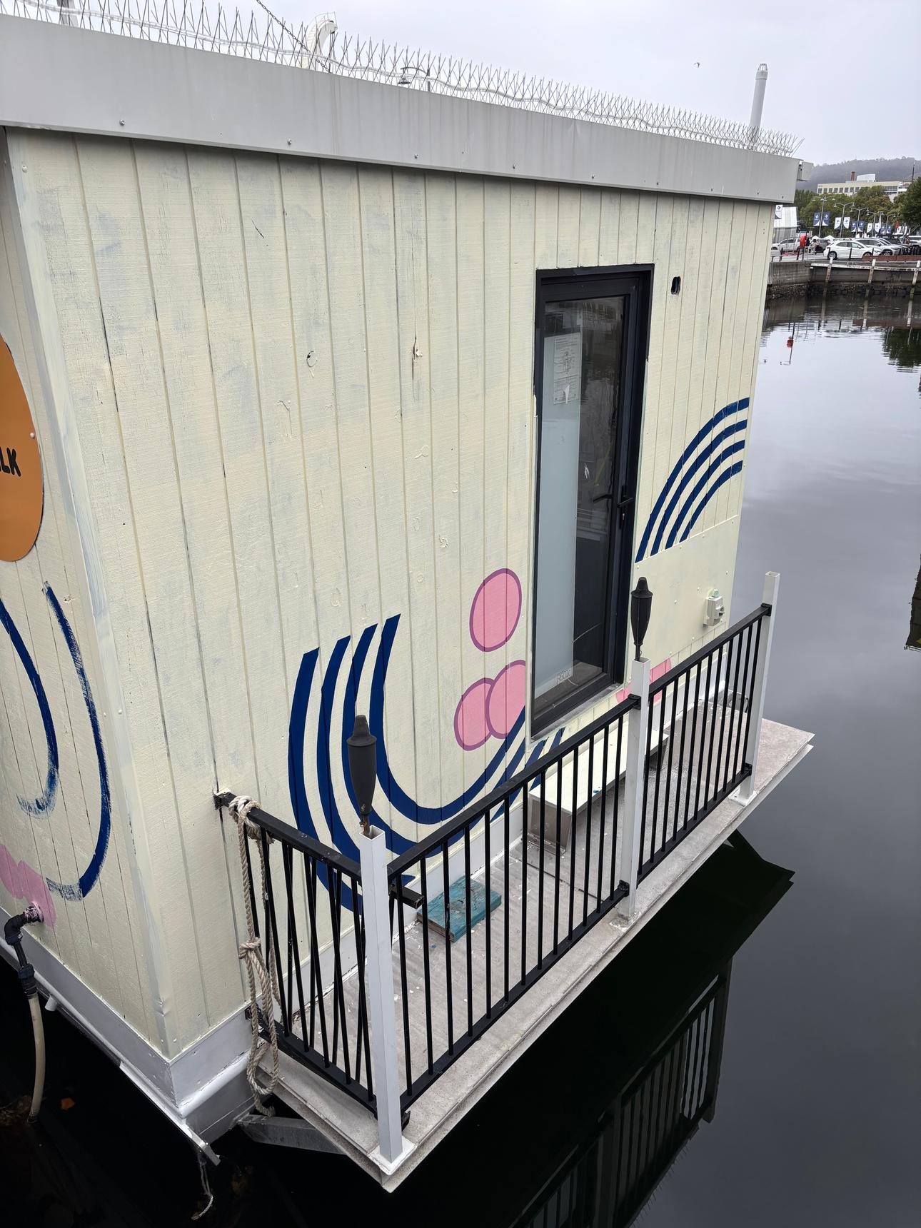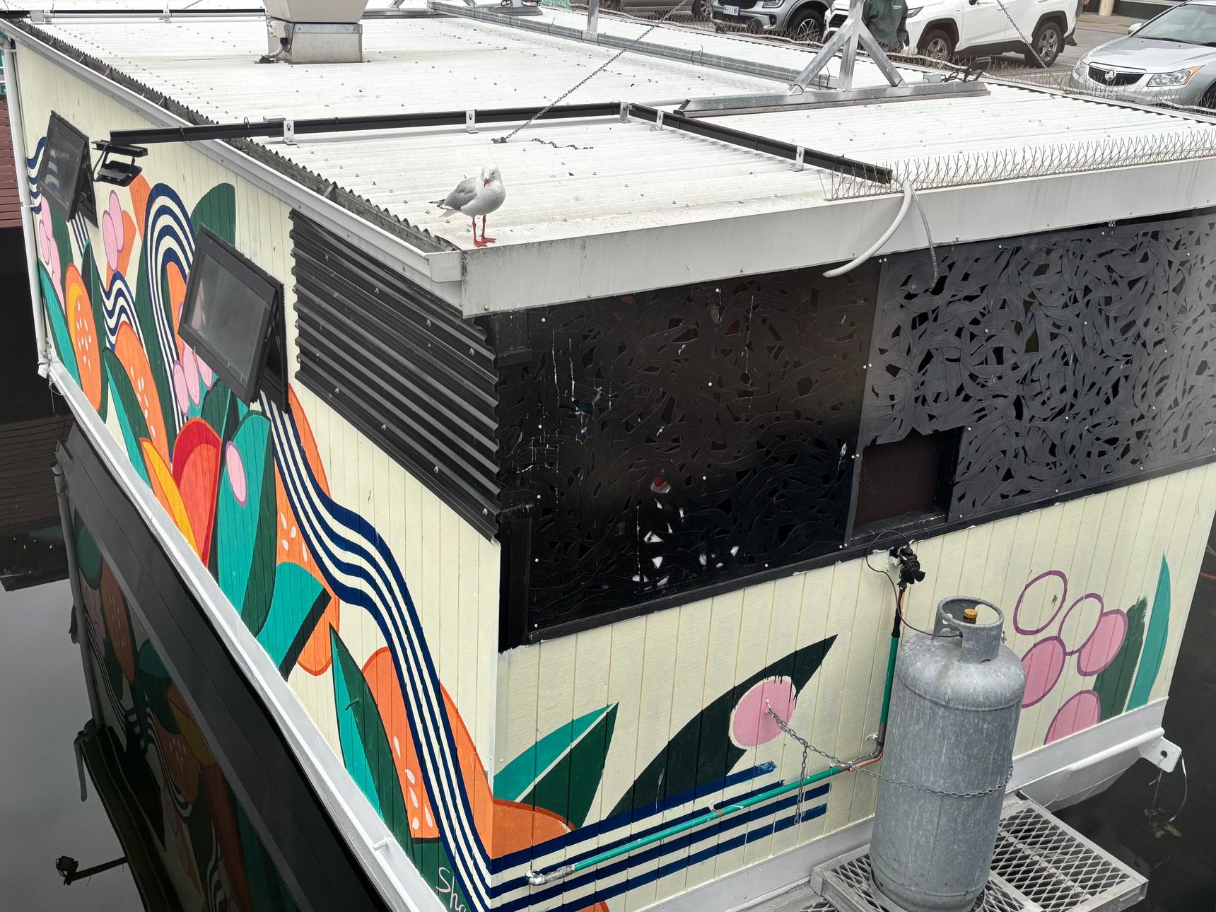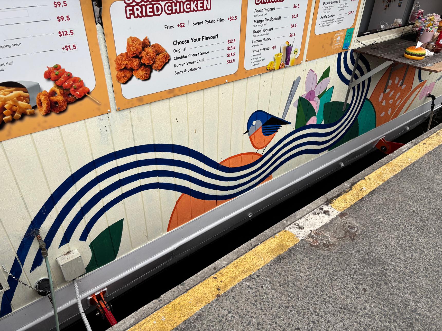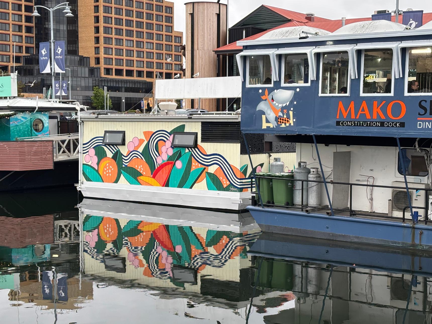 This large-scale mural wraps around the exterior walls of Belly Talk, a floating takeaway shop at Hobart’s iconic Constitution Dock. Created in November 2025, the artwork transforms the utilitarian structure into a vibrant, waterfront landmark.