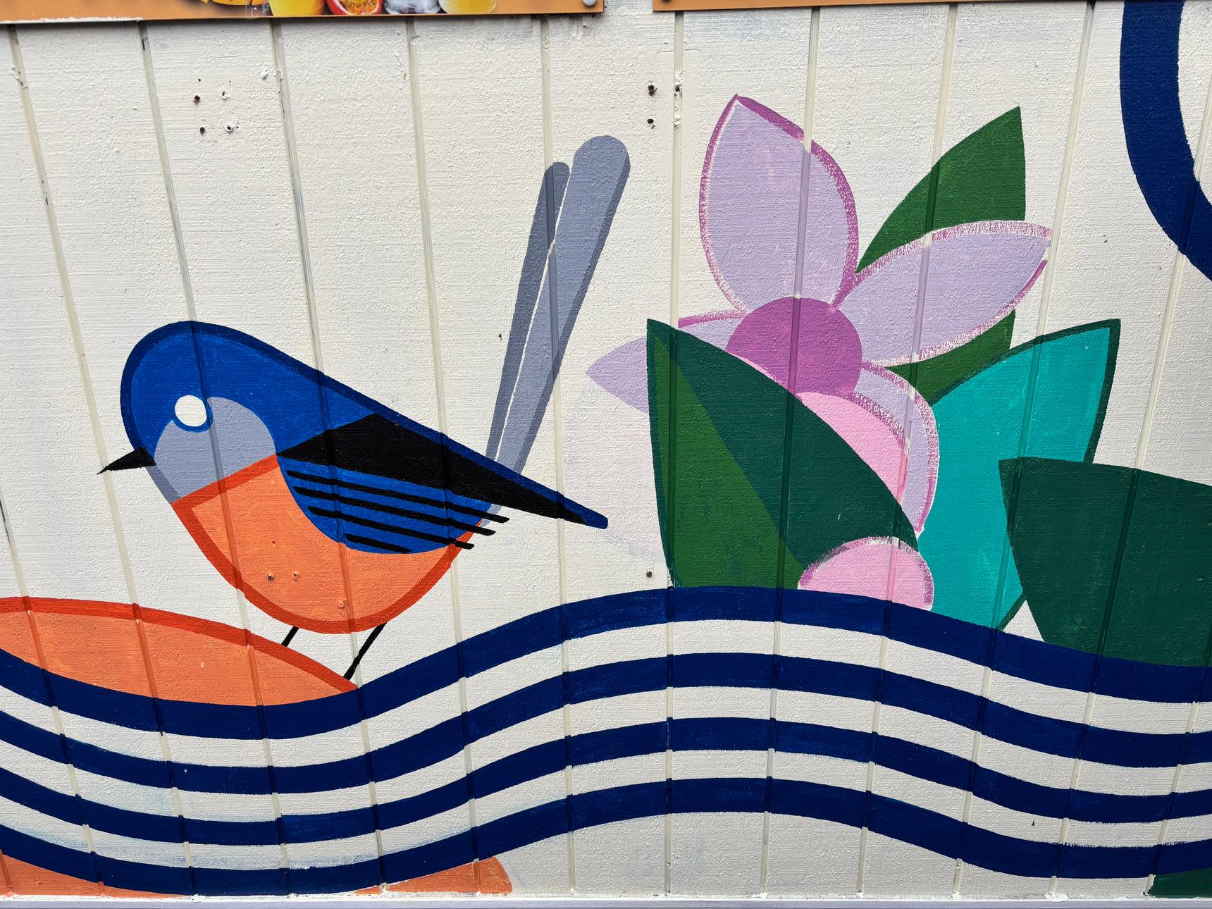 Positioned directly above the water, the mural becomes part of the landscape itself — with reflections often visible on calm days. As viewers move around the dock, different elements of the design reveal themselves, encouraging slow viewing and exploration from multiple angles.