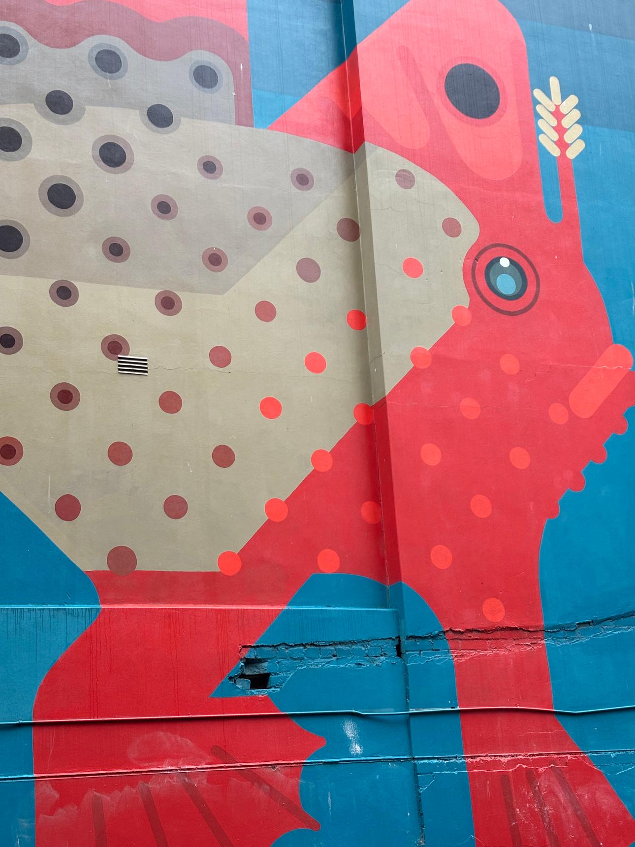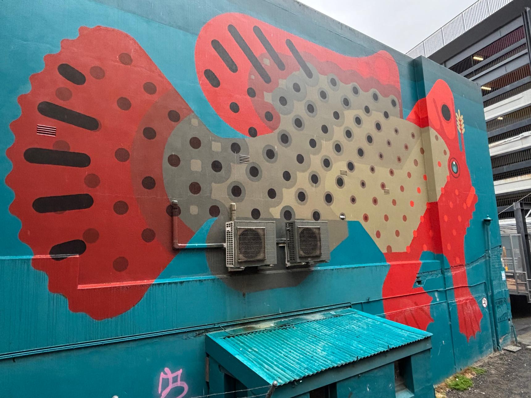 This large-scale mural depicts the critically endangered Tasmanian Red Handfish, an extraordinary species found only in Tasmania’s coastal waters. Painted in bold reds, muted earth tones and deep teal, the artwork combines playful graphic shapes with strong visual presence, transforming an otherwise industrial wall into a striking moment of urban storytelling.