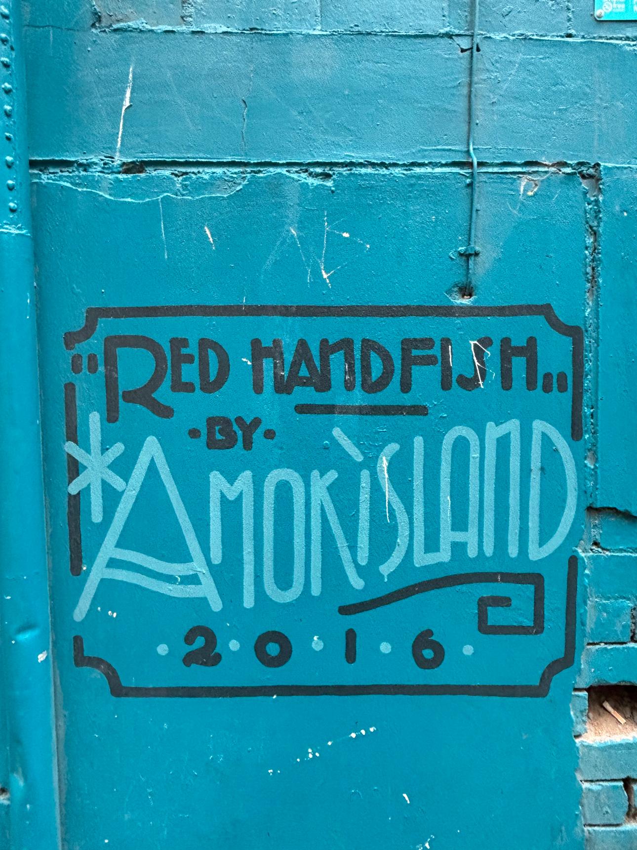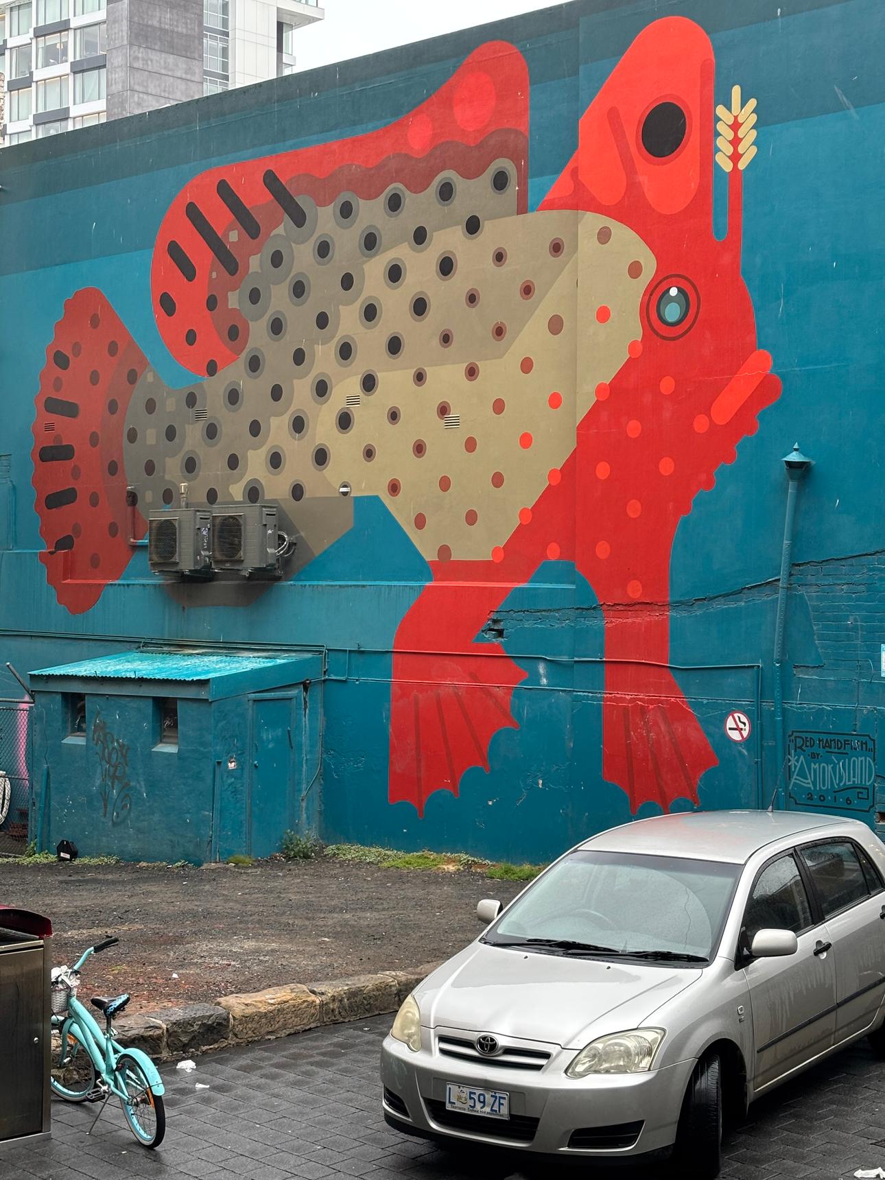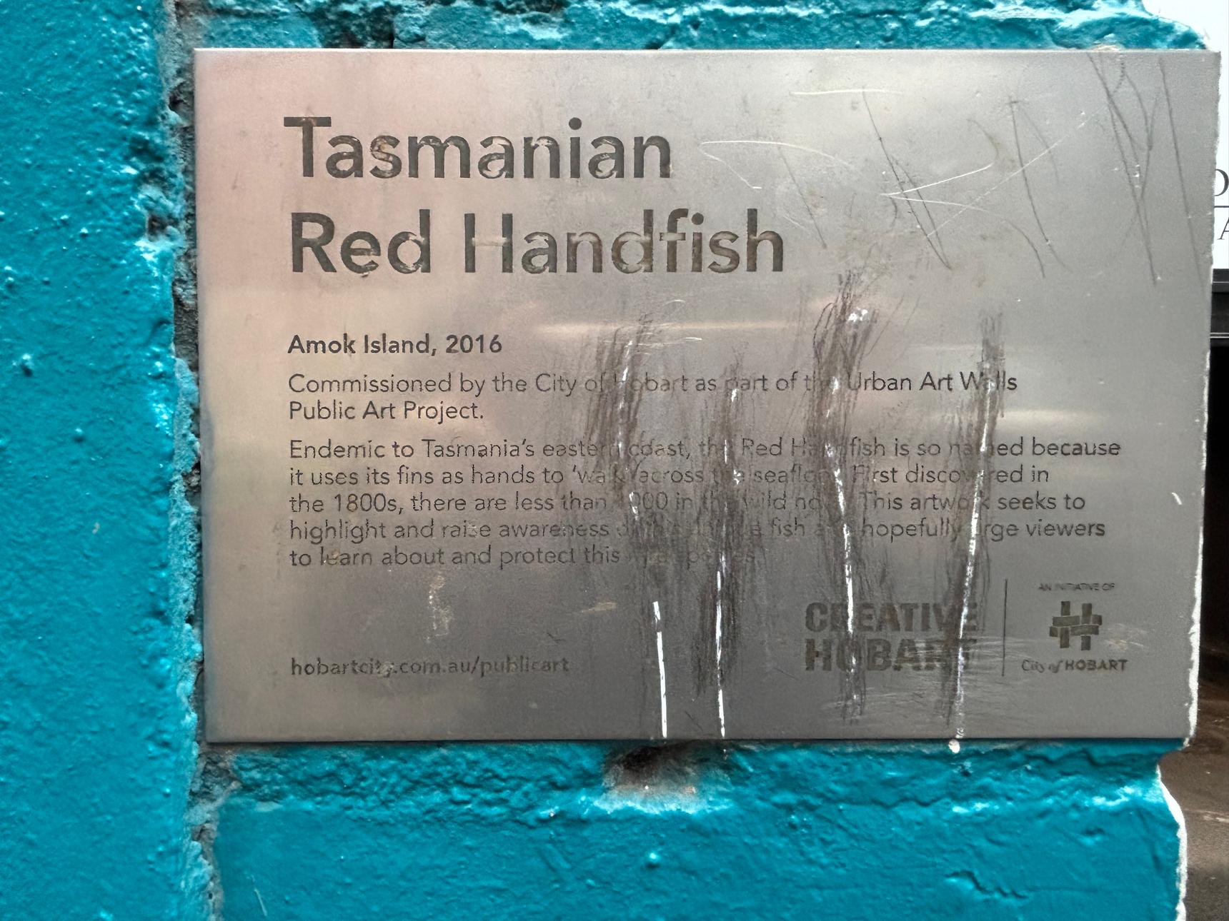 Created by Amok Island in 2016, the mural draws attention to a species with fewer than a thousand individuals left in the wild. Known for using its fins like hands to “walk” along the seafloor, the Red Handfish becomes both a symbol of Tasmania’s unique biodiversity and a quiet call to conservation.