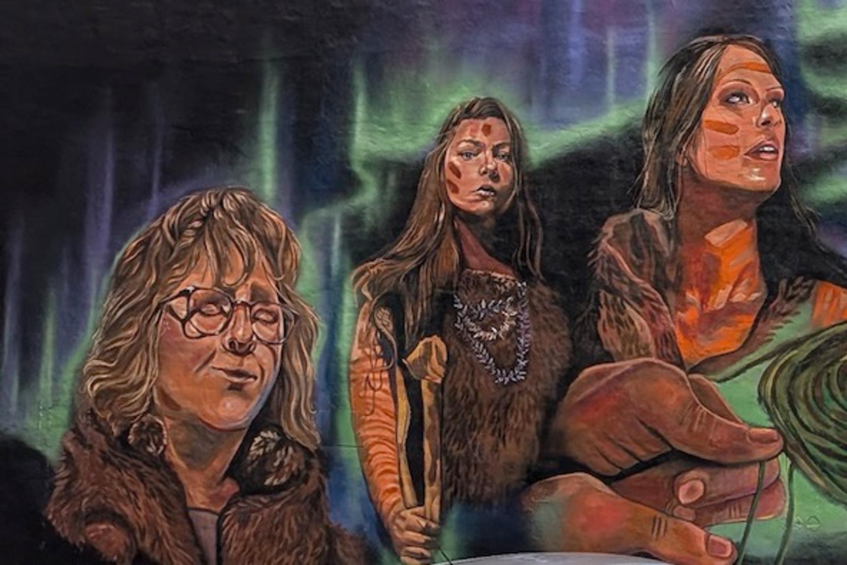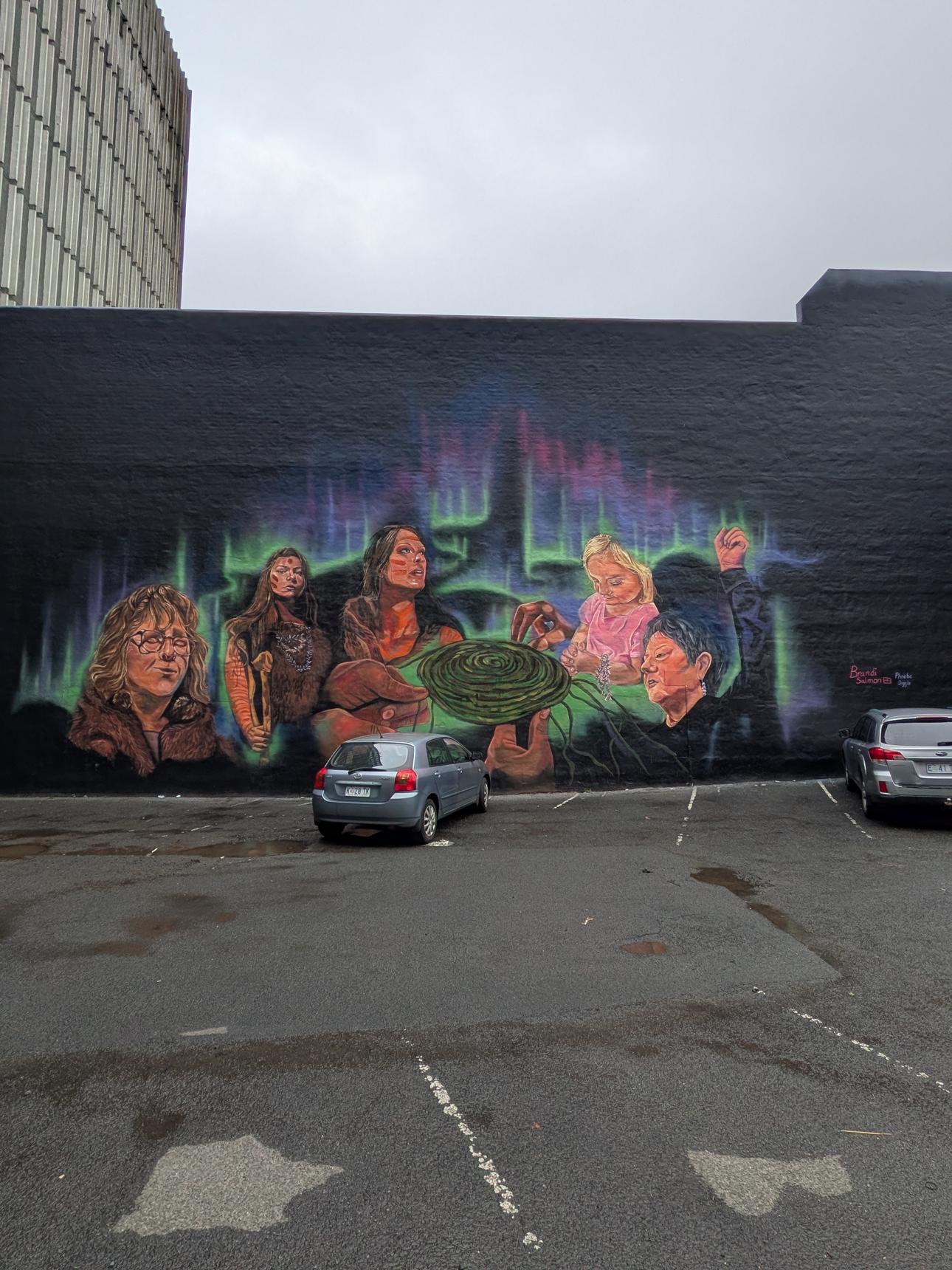 This mural is a celebration of Aboriginal women, Palawa women. Growing up on the mainland, whenever Tasmania was spoken about there was this misconception that Palawa people were “gone”. That is a colonial lie. Palawa people are here, they are strong and thriving. Thank you to to the women depicted for trusting me to paint you: