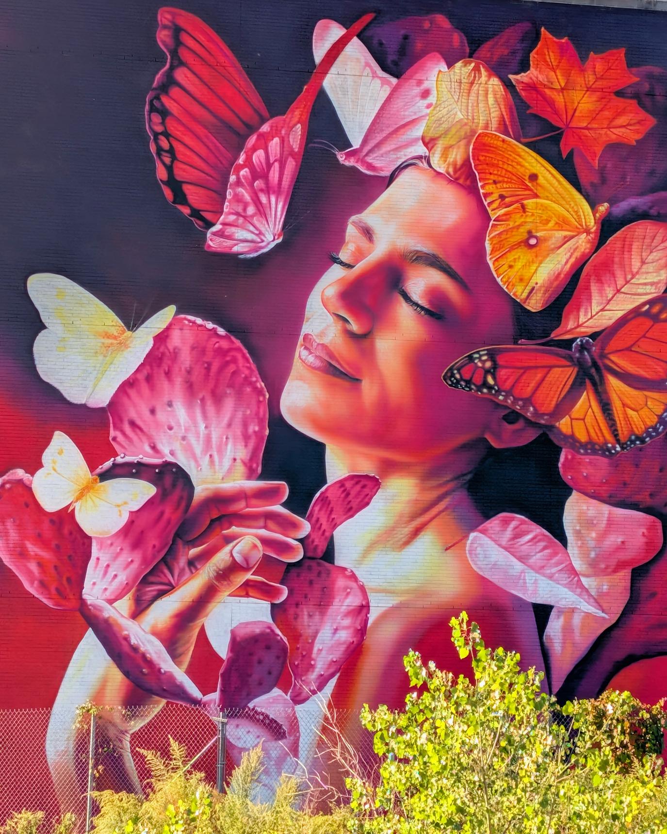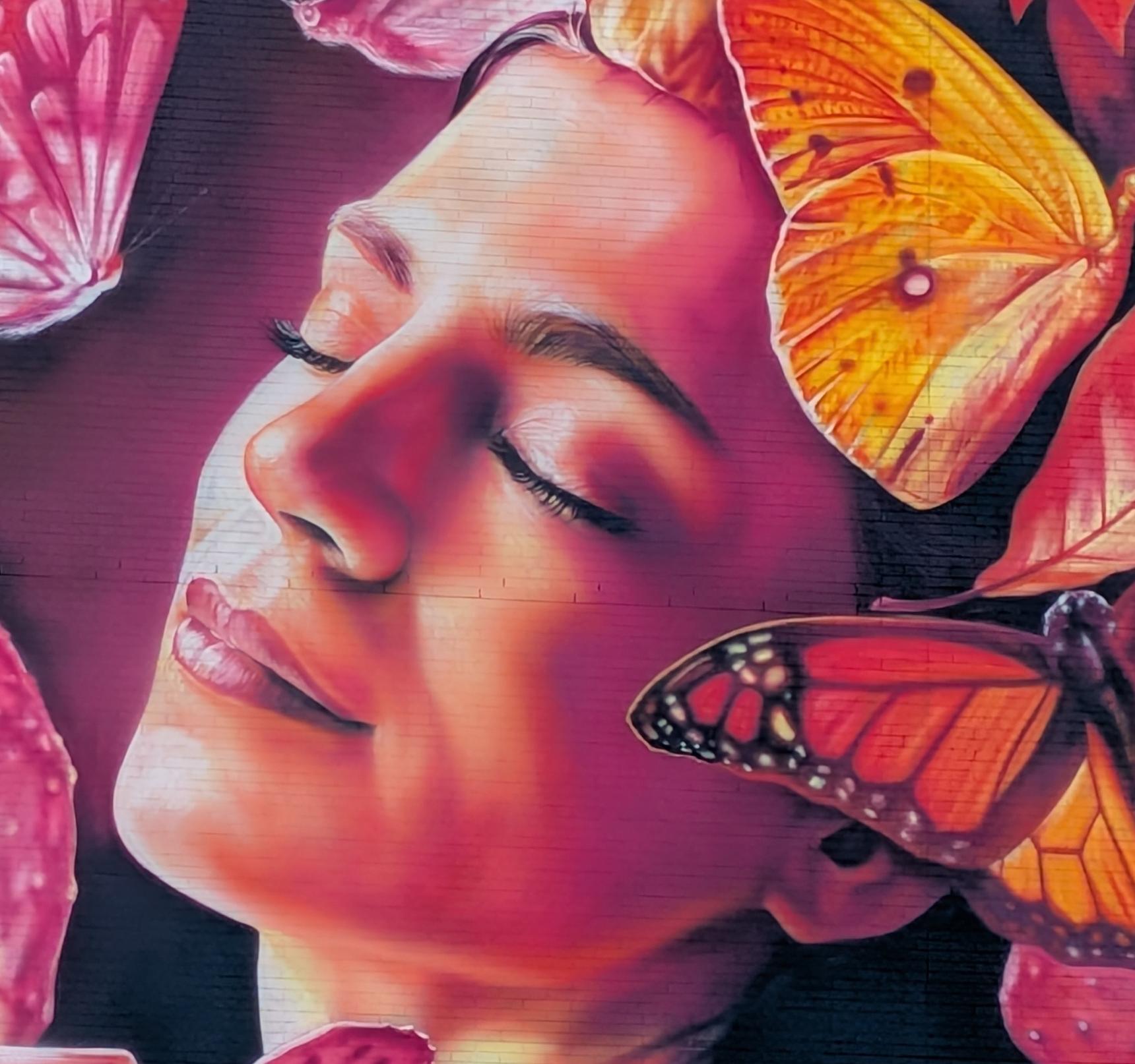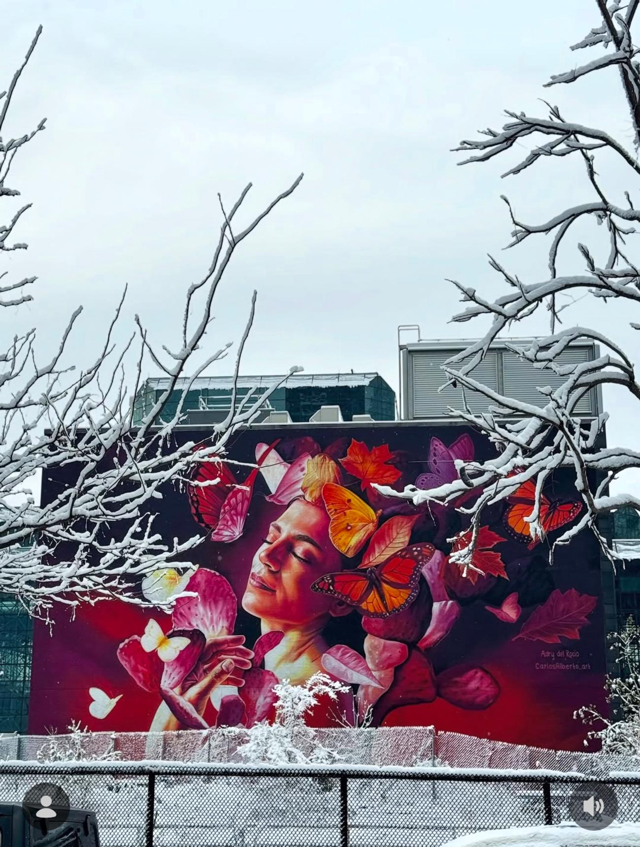 The artwork depicts a young Manhattan woman surrounded by dark purple skies—a reference to the 2023 wildfires that blanketed NYC in smoke. Yet, as we zoom in on her, she breathes deeply and meditatively, creating a halo of light from which life can emerge again. Around her swirl leaves of acacia, oak, and maple trees, alongside the resilient Opuntia Humifusa cactus, still rooted between the High Line’s train tracks. Both fragile and strong, this cactus anchors renewal—purifying the air and offering refuge to life. Butterflies take flight, symbolizing metamorphosis and highlighting the resilience and biodiversity of New York City itself.