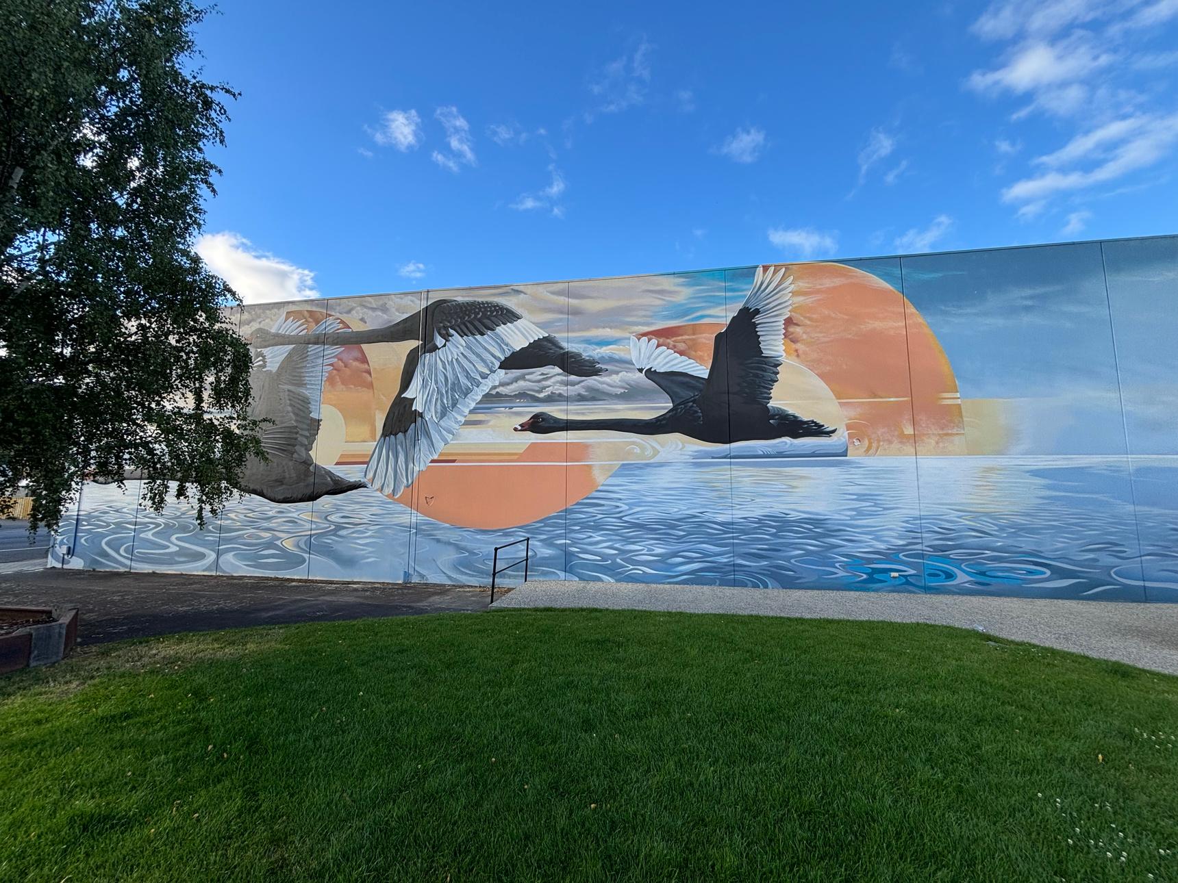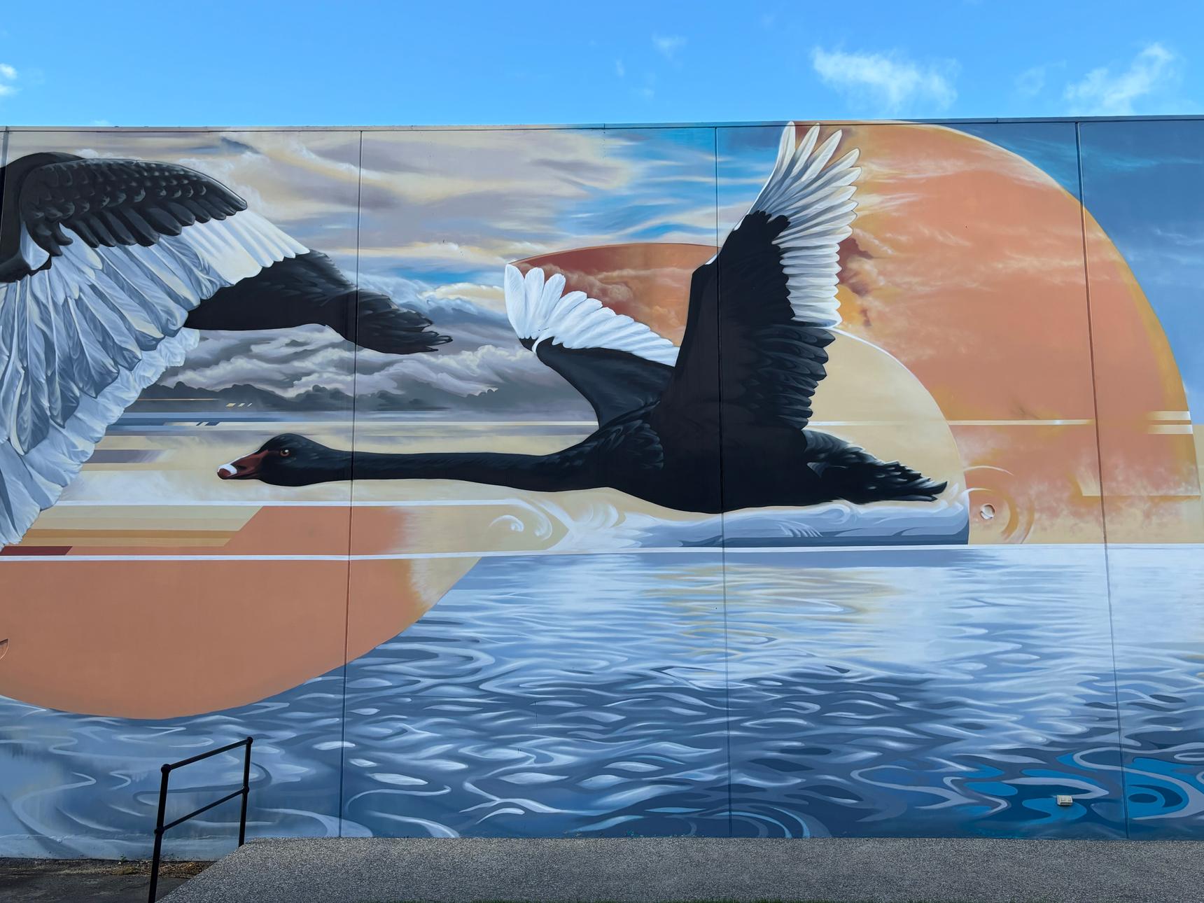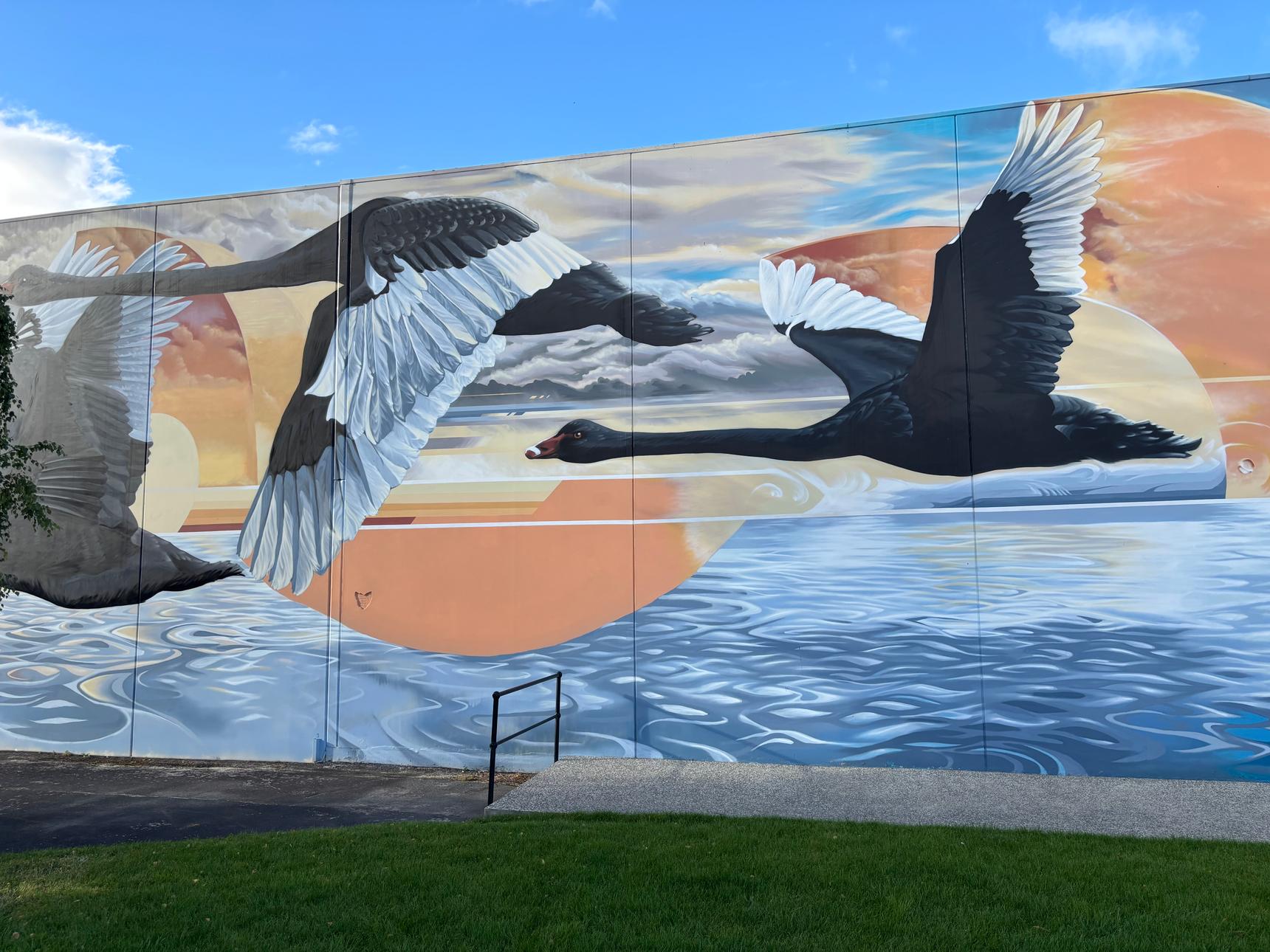 The artwork is deeply rooted in local Aboriginal culture, inspired by the stories of Palawa Elder Rodney Dillon about the significance of the black swan to the people of the Huon Valley. The mural reflects themes of connection to Country, storytelling, and environmental wisdom, celebrating the river, the land and the Swans as guides and indicators of seasonal changes. It forms part of the broader Black Swan Park space — a community gathering place designed to honour culture, knowledge and shared heritage.