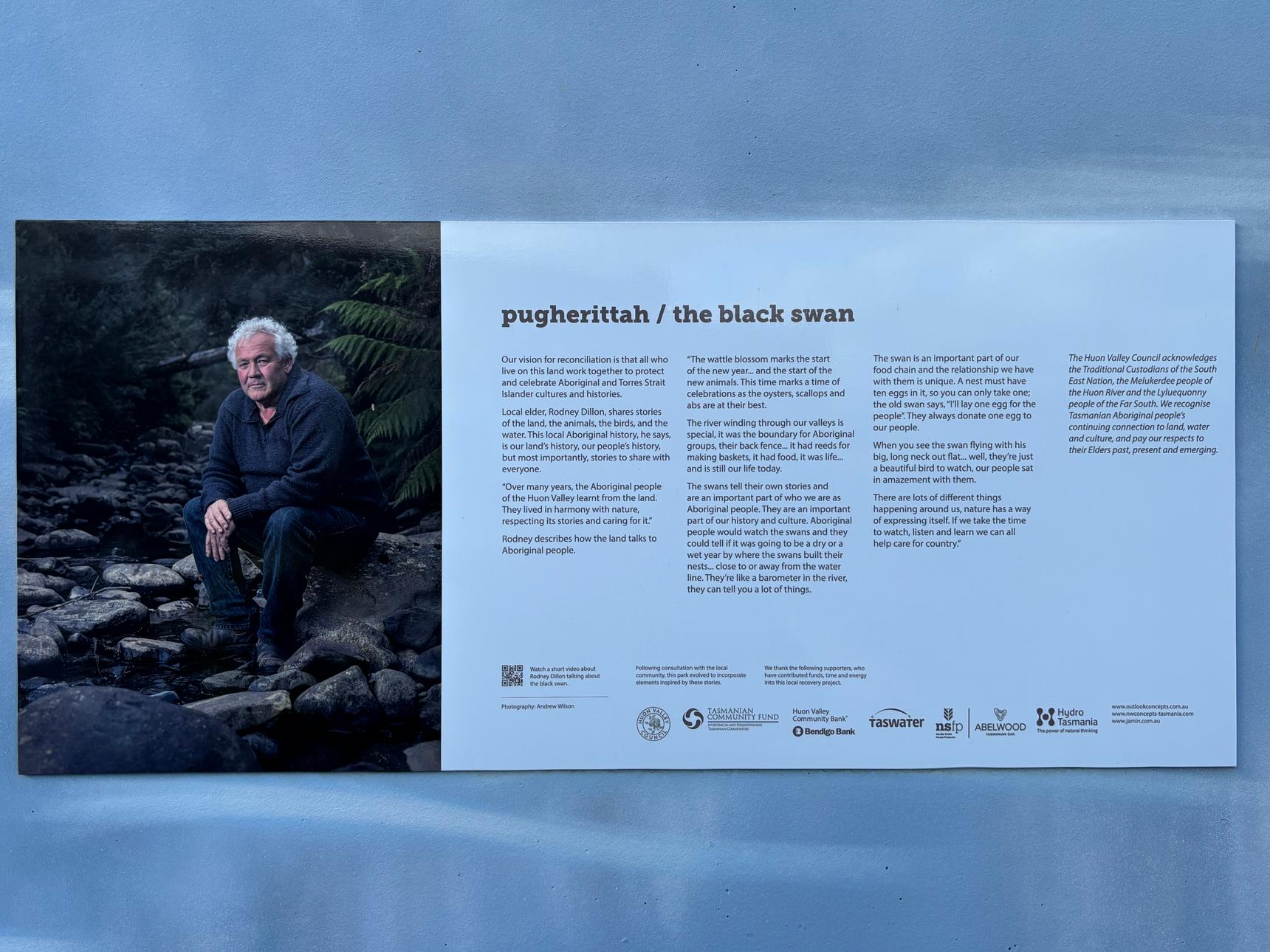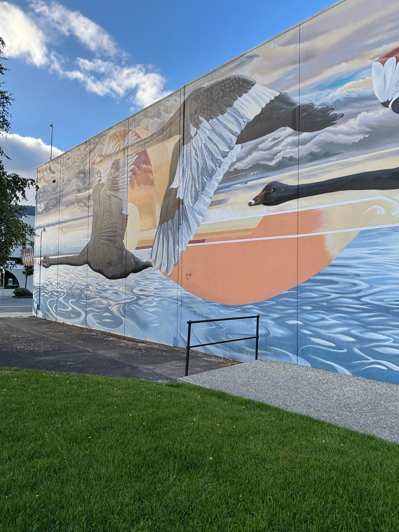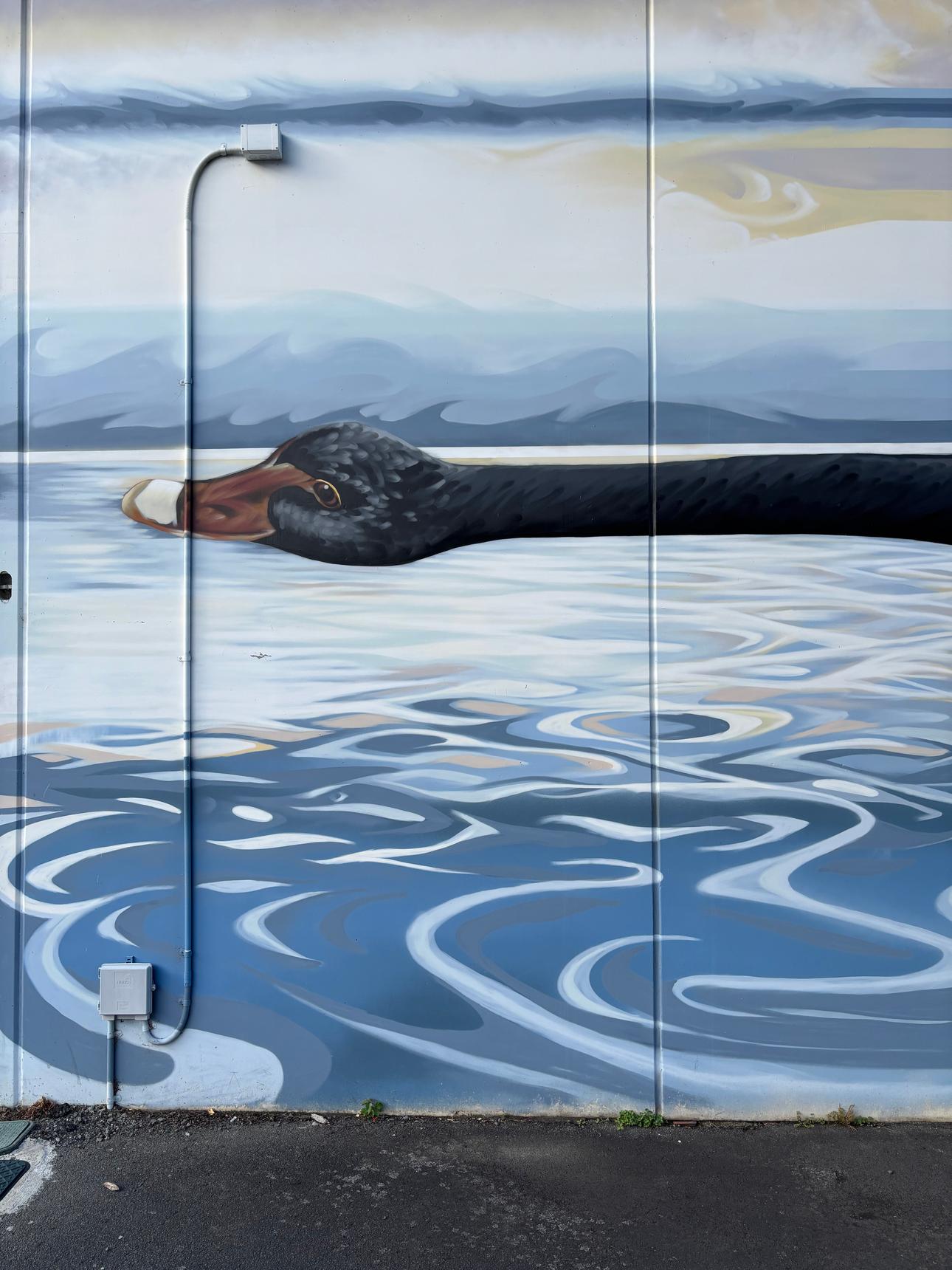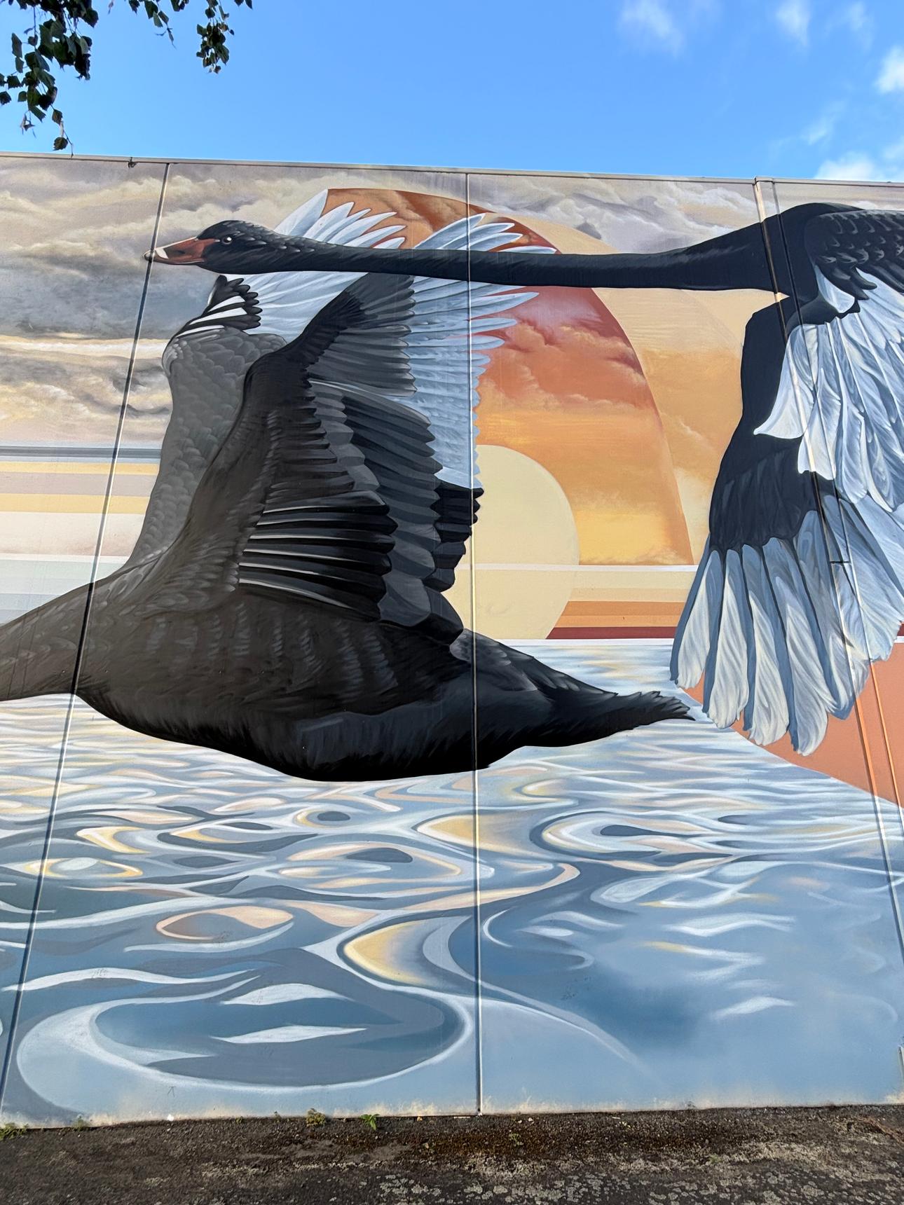 The artwork is deeply rooted in local Aboriginal culture, inspired by the stories of Palawa Elder Rodney Dillon about the significance of the black swan to the people of the Huon Valley. The mural reflects themes of connection to Country, storytelling, and environmental wisdom, celebrating the river, the land and the Swans as guides and indicators of seasonal changes. It forms part of the broader Black Swan Park space — a community gathering place designed to honour culture, knowledge and shared heritage.