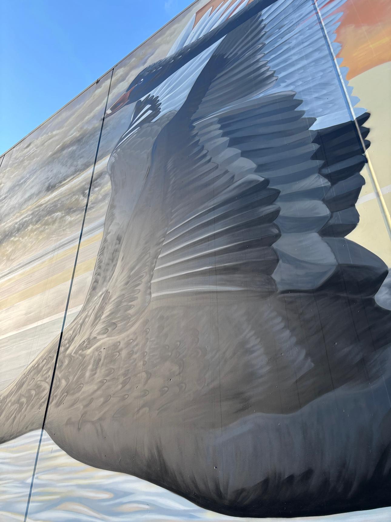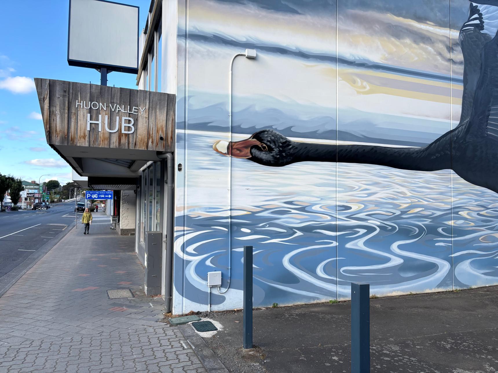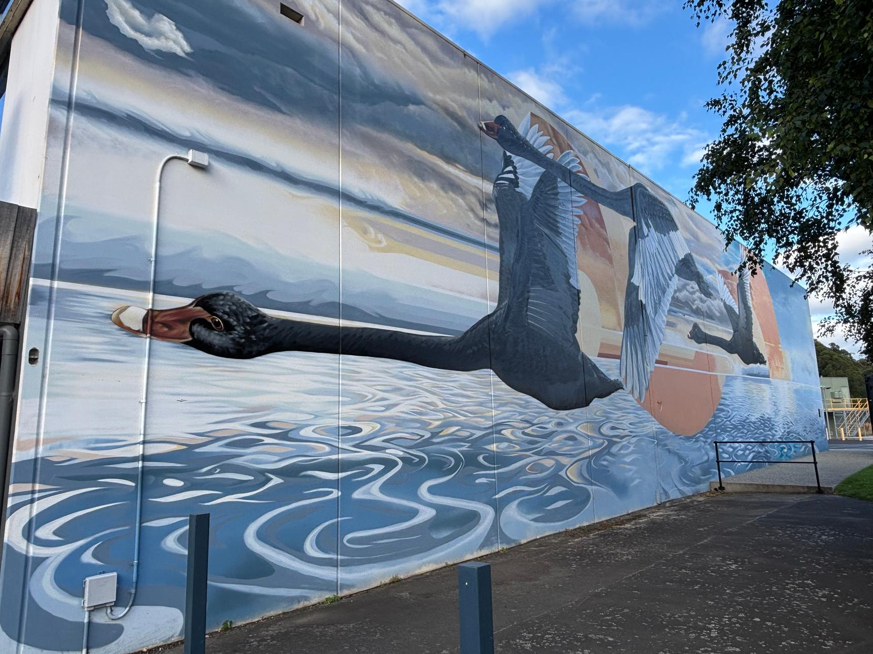 This captivating and large-scale mural adorns the wall of the Huon Valley Hub in Huonville and depicts a dynamic flight of black swans soaring over the water at sunrise or sunset. The sweeping composition captures movement, grace and the natural beauty of the region — the birds gliding low with wings fully extended, their reflections hinted in the gentle ripples below.