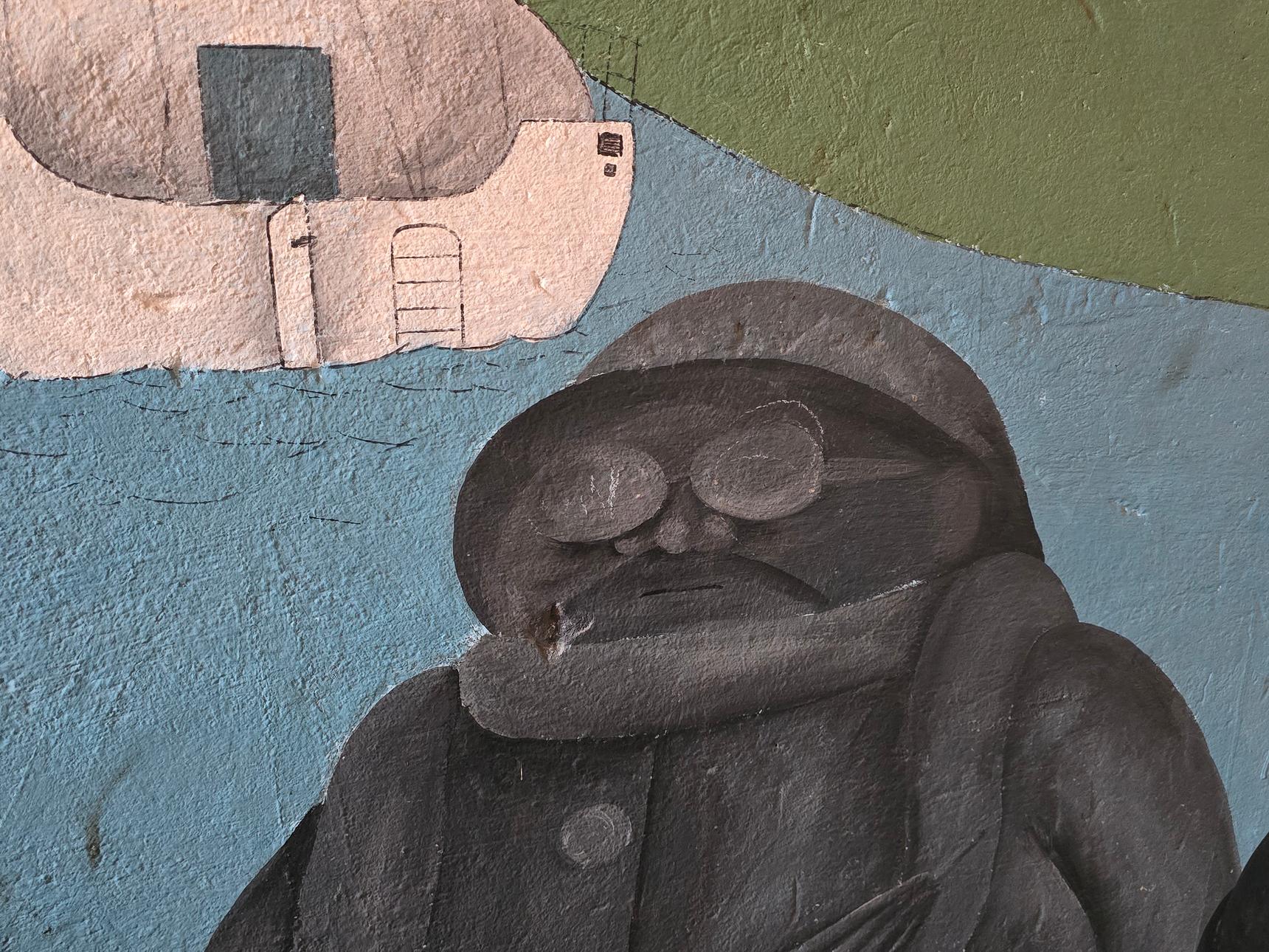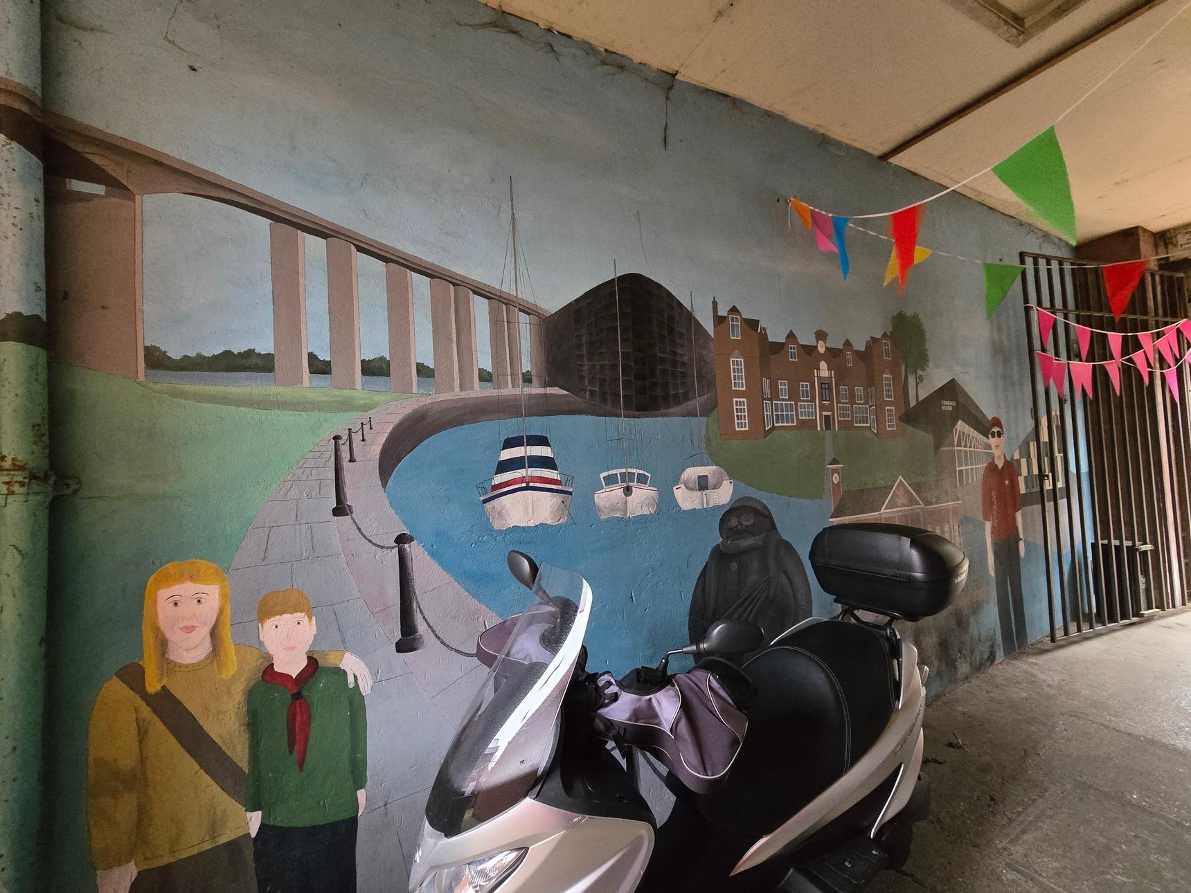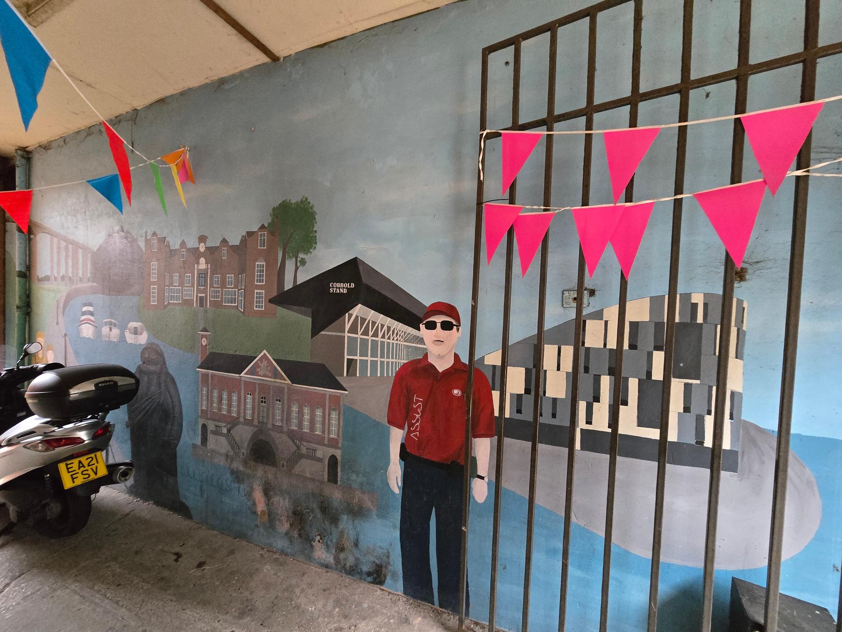 On wall in alleyway through to craft shop. Access is restricted to shop opening times; it is still viewable when closed, but viewing is through barred gate. Please note that poor lighting may make viewing when closed tricky.