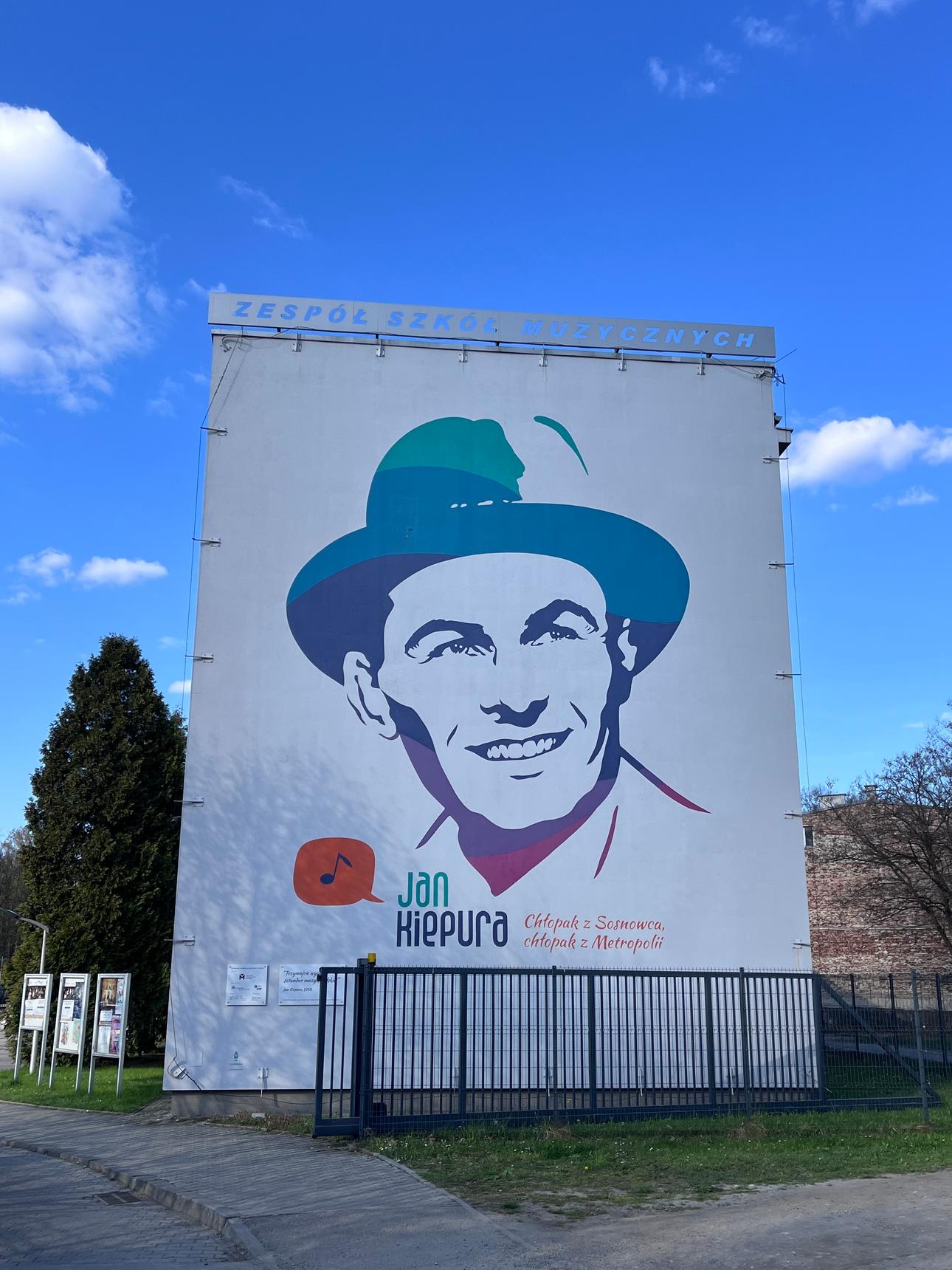 The portrait of Jan Kiepura, a renowned Polish opera singer and film star of the early 20th century who was born in Sosnowiec, painted on the building of the Music School Complex.