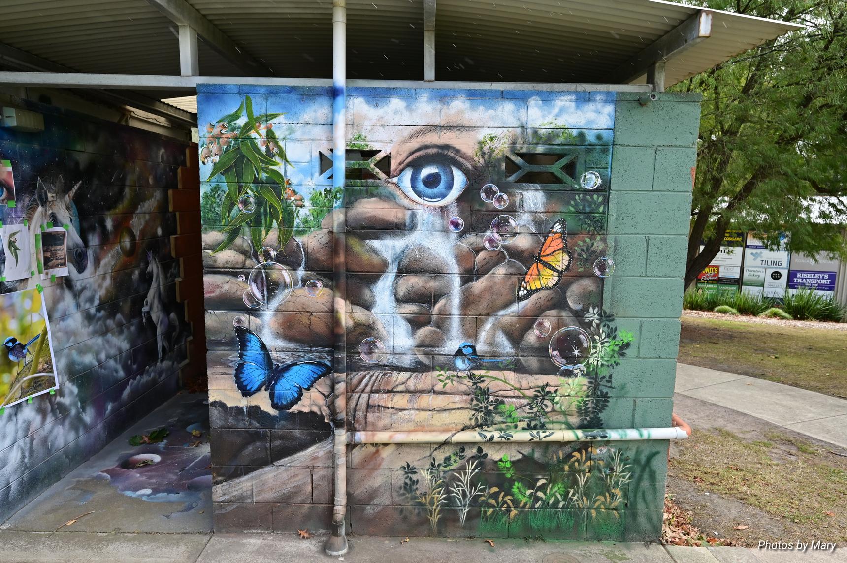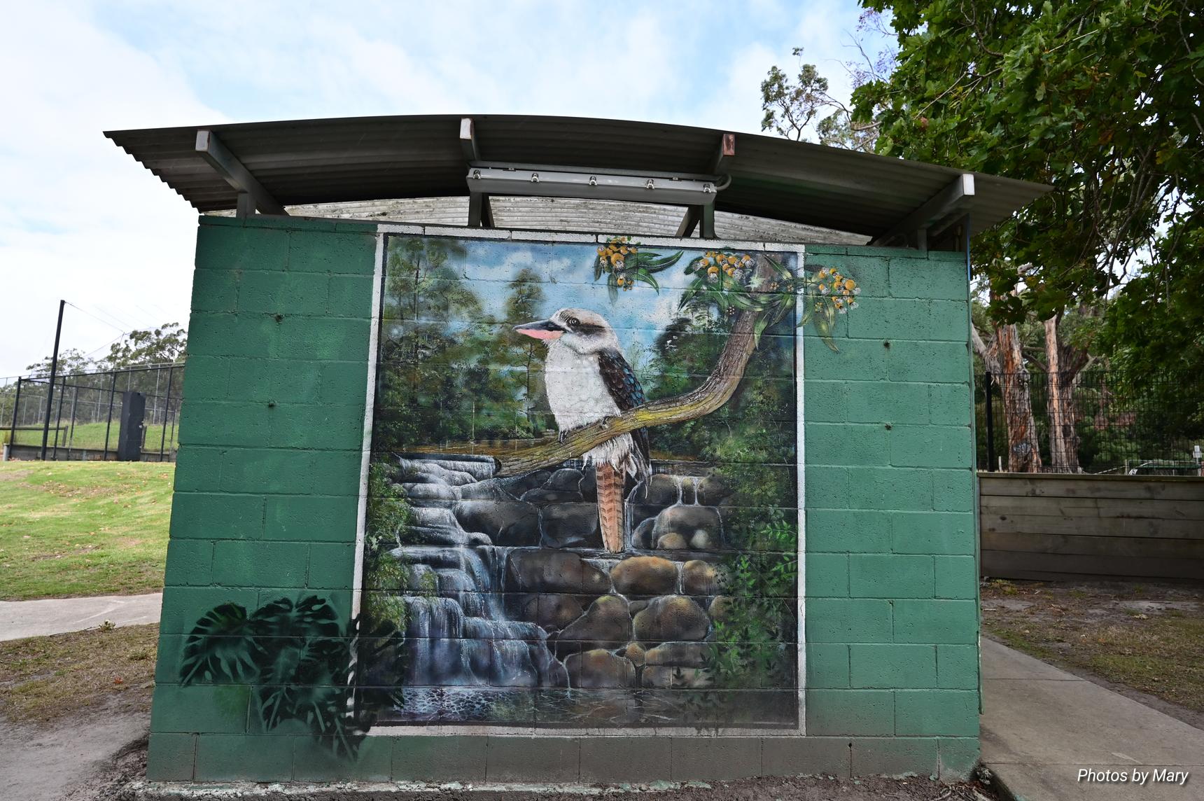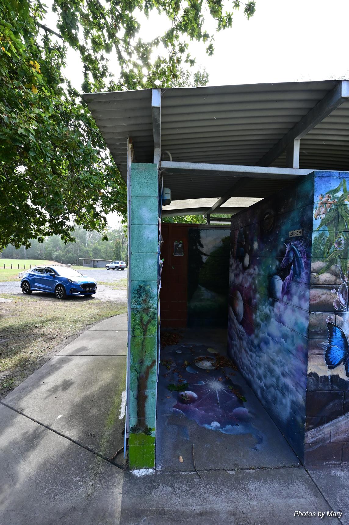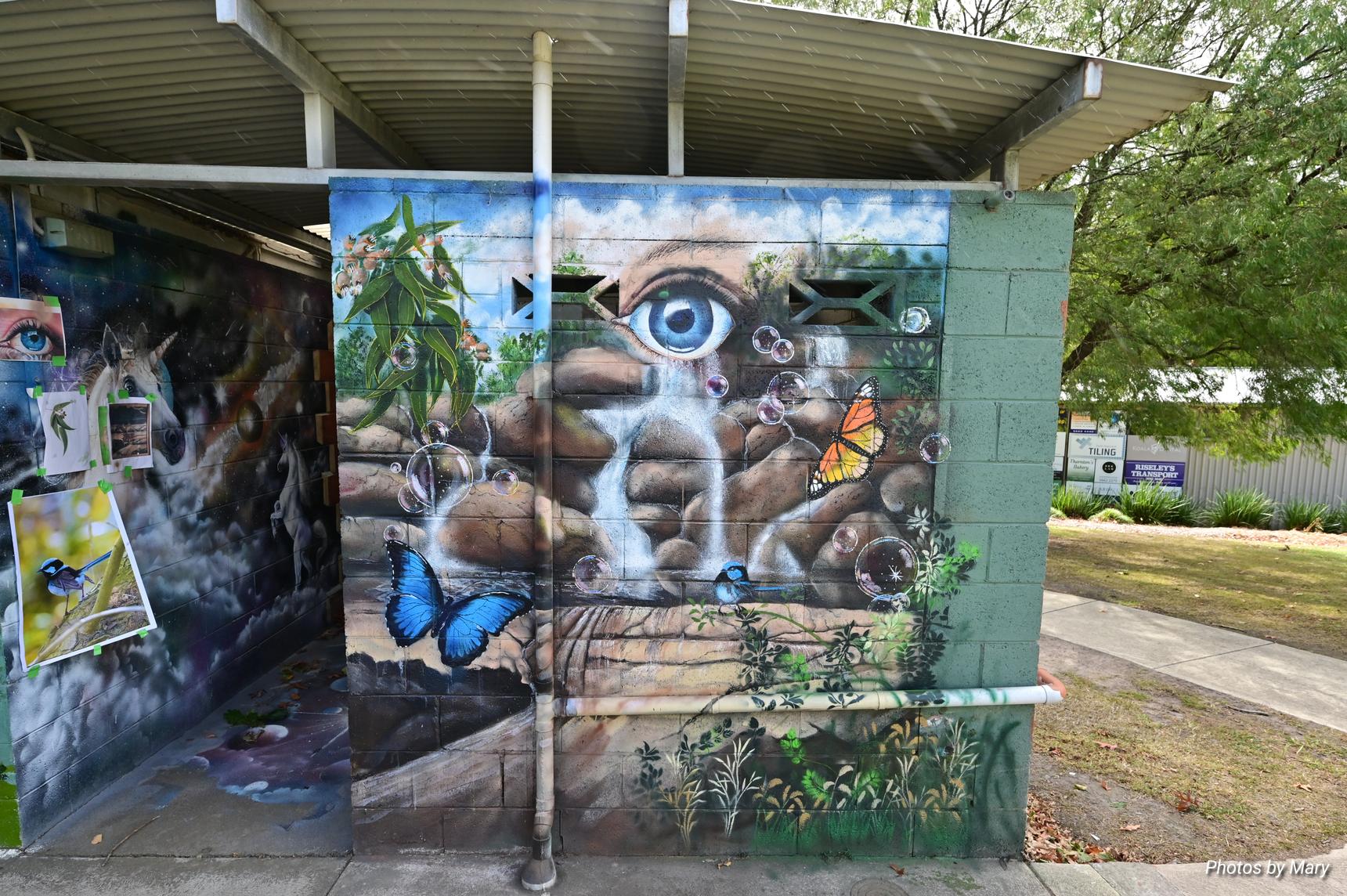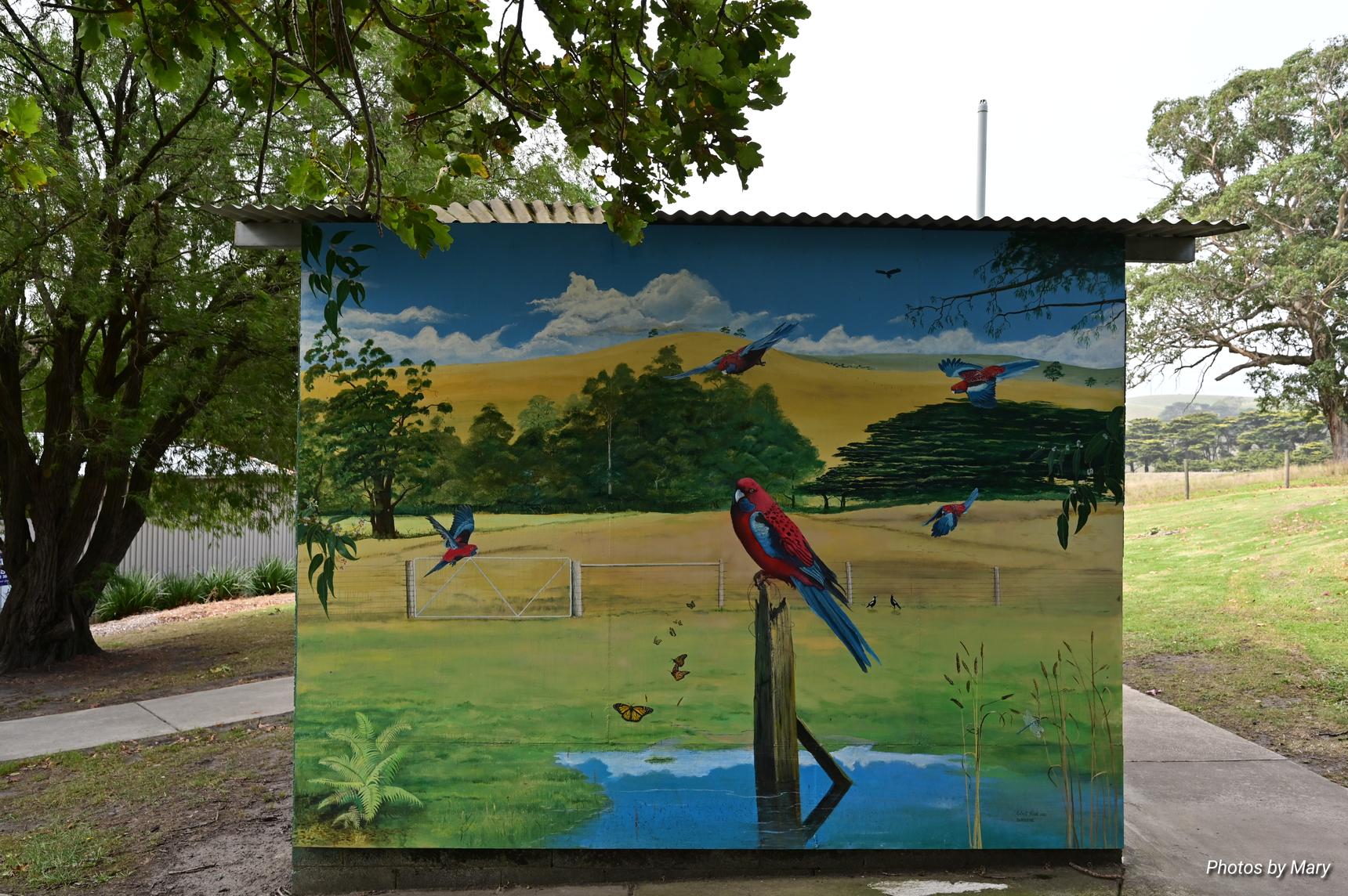 The murals, painted on the ladies toilet block at Koonwarra Recreation Reserve features various types of bird life, mythical animals and creative artwork