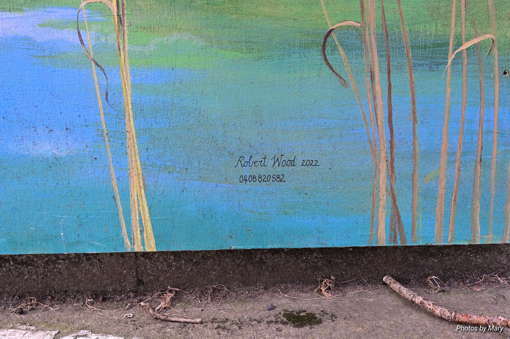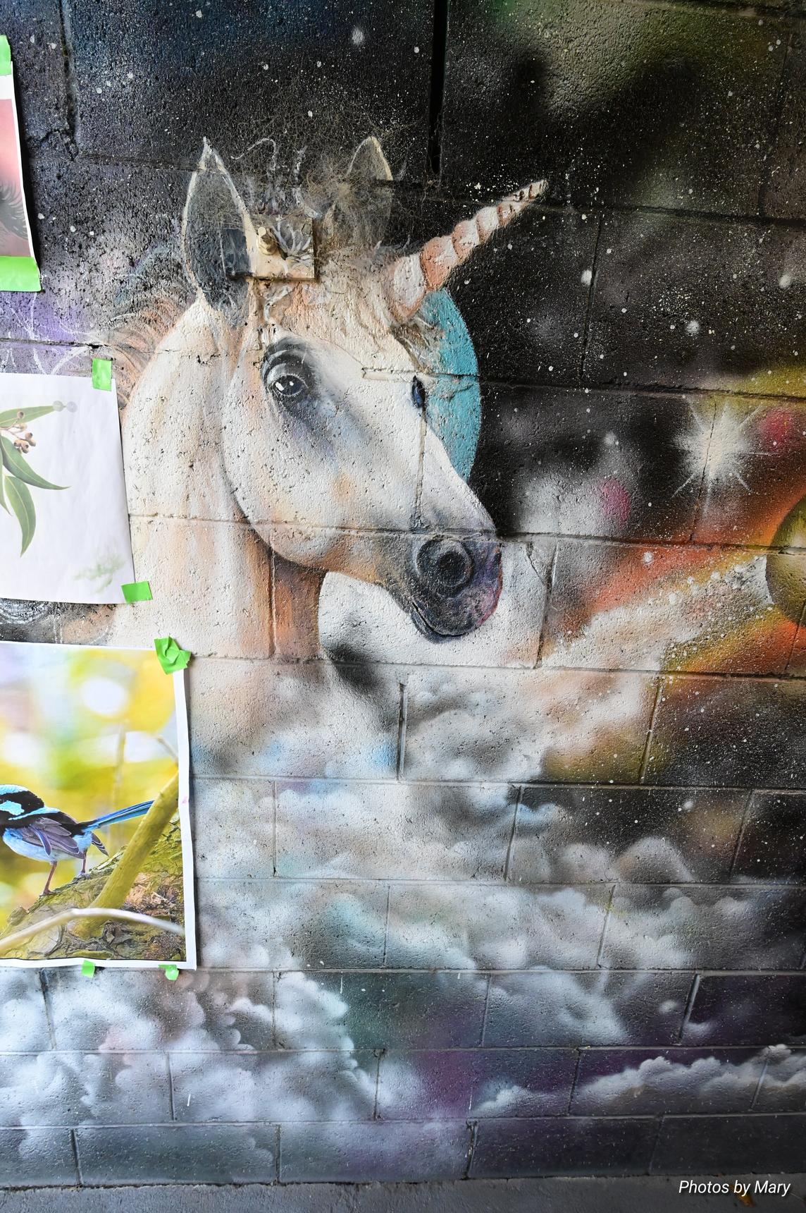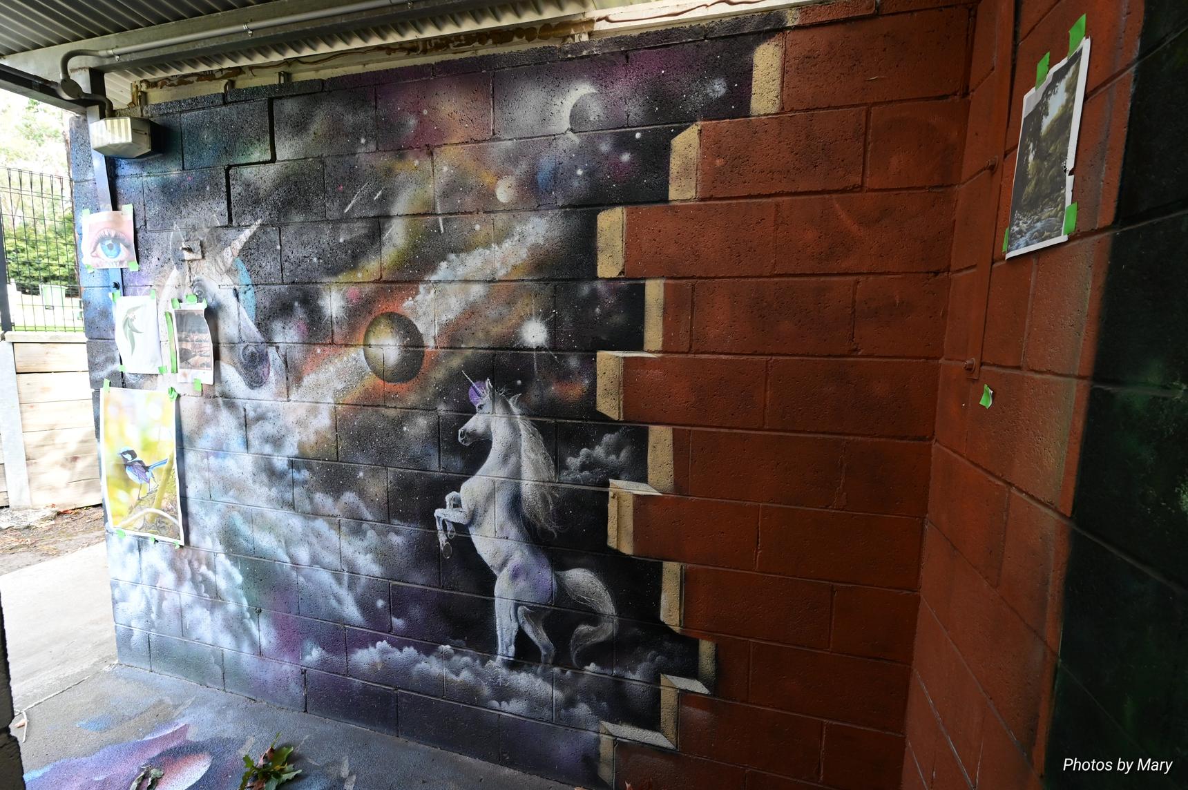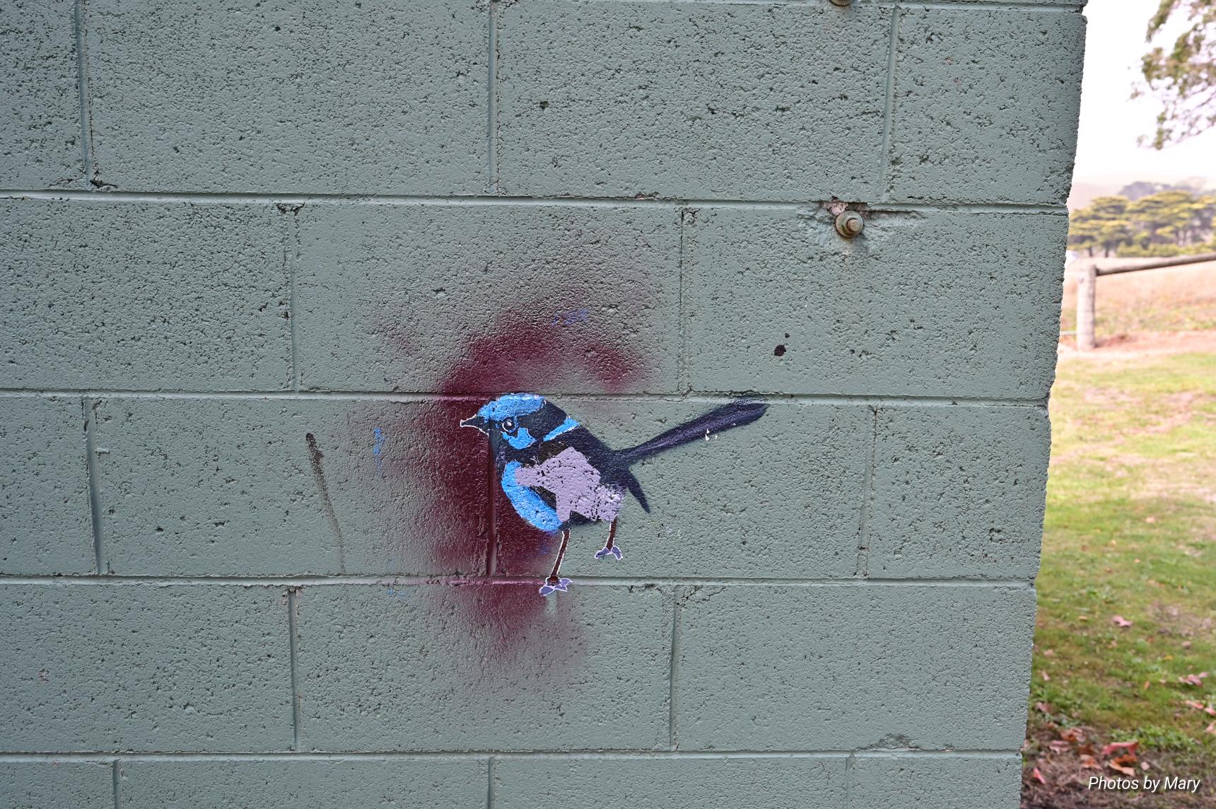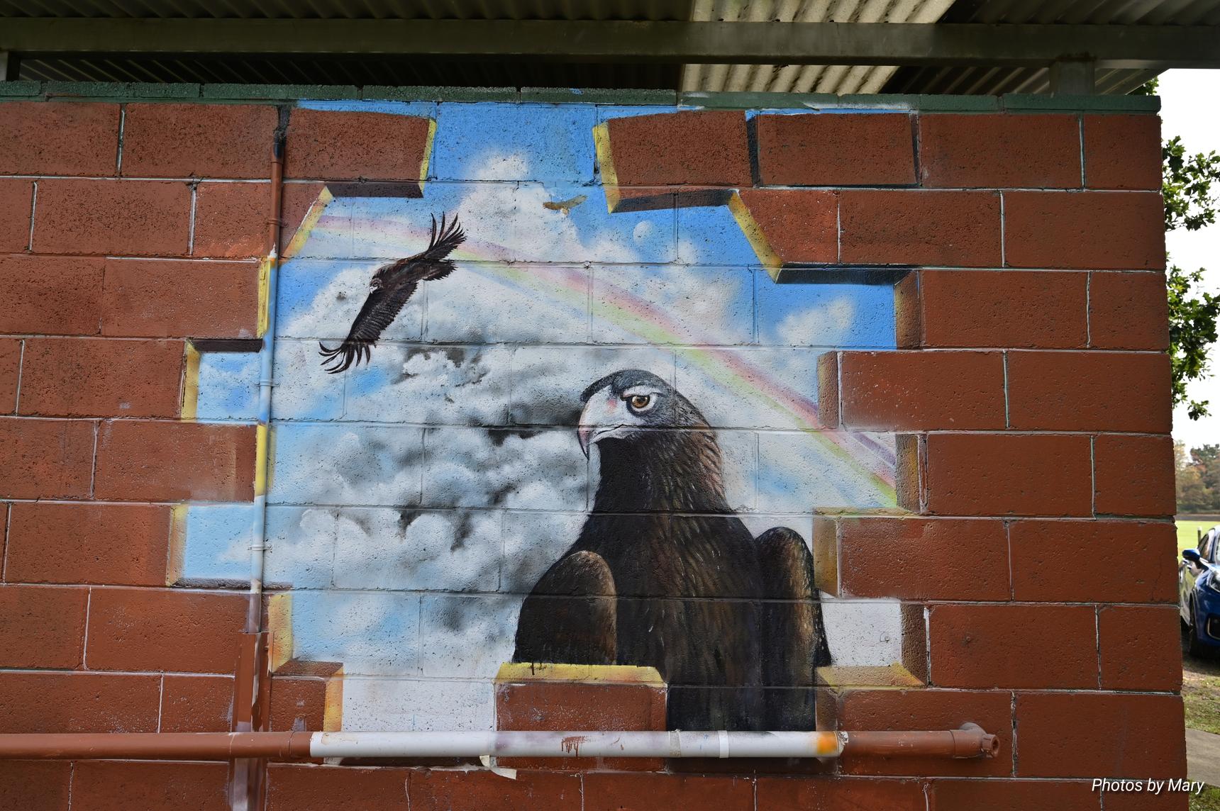 The murals, painted on the ladies toilet block at Koonwarra Recreation Reserve features various types of bird life, mythical animals and creative artwork
