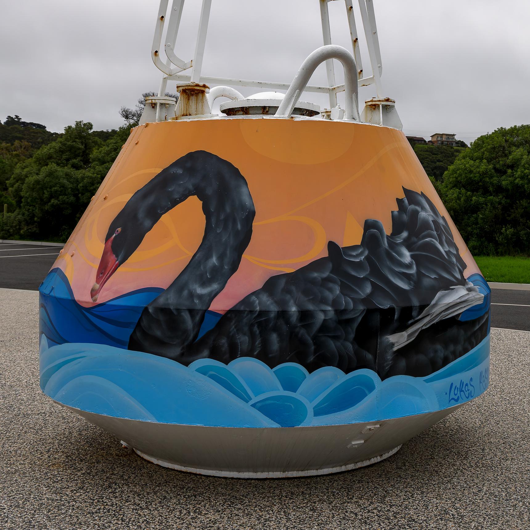 There are two focal points on each buoy: this one features a black swan and a pelican floating on the water during sunset.