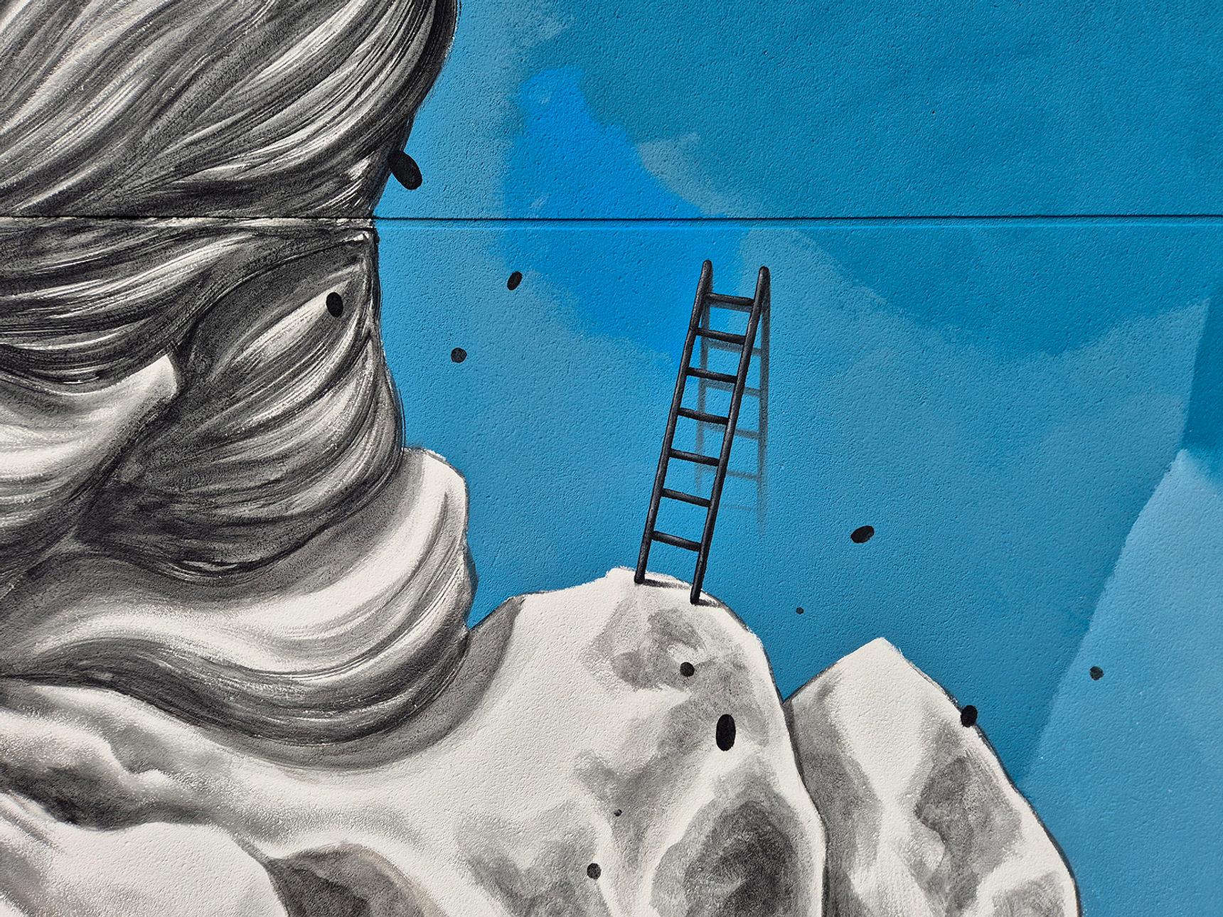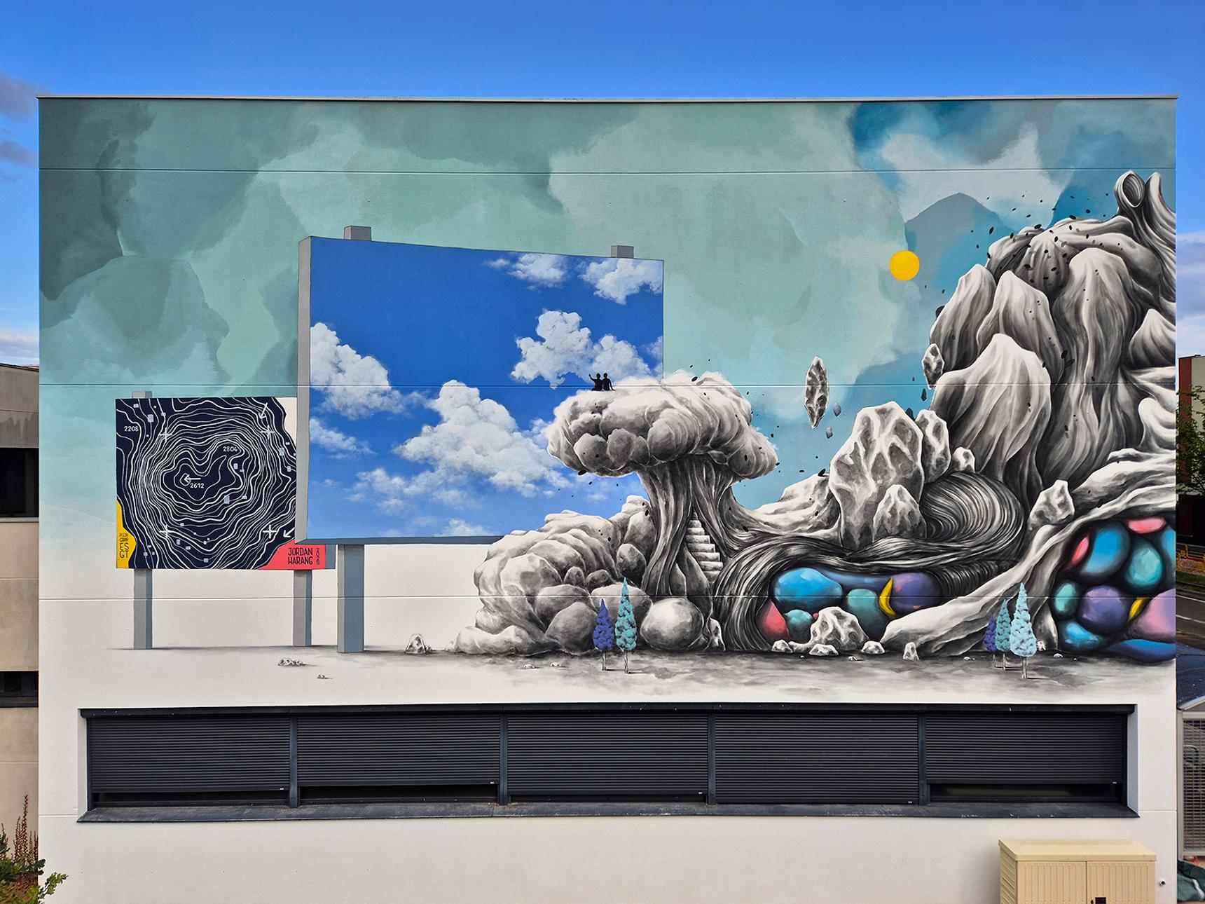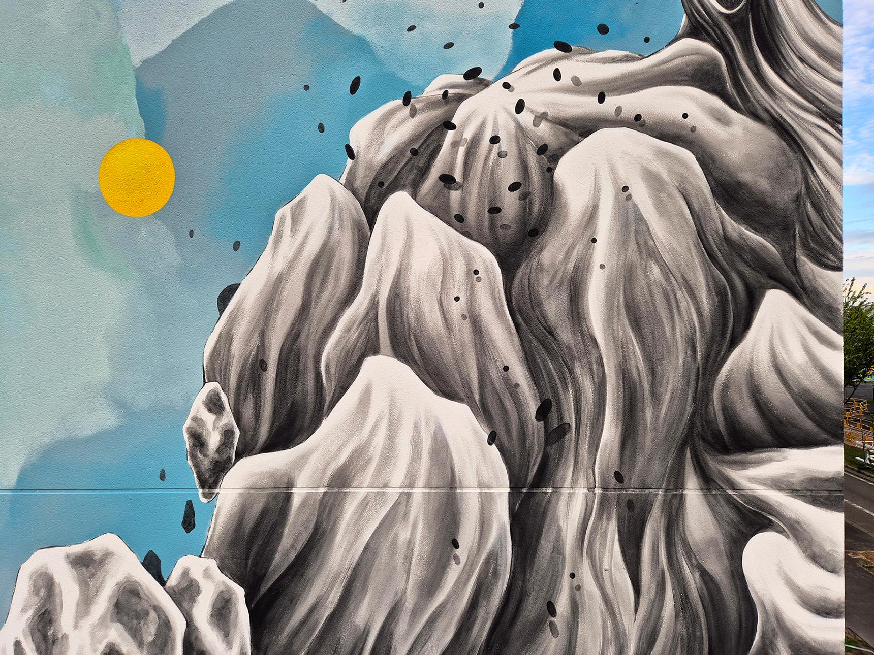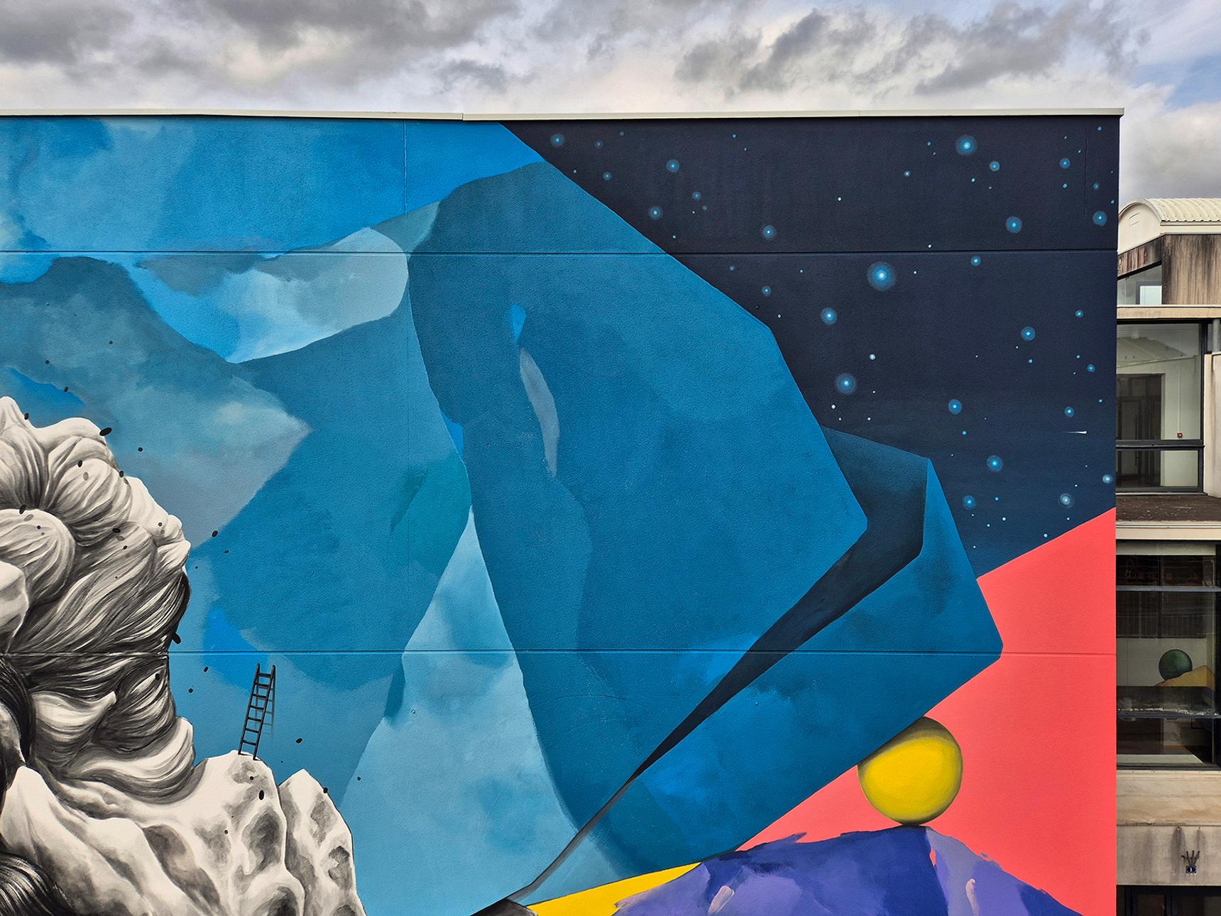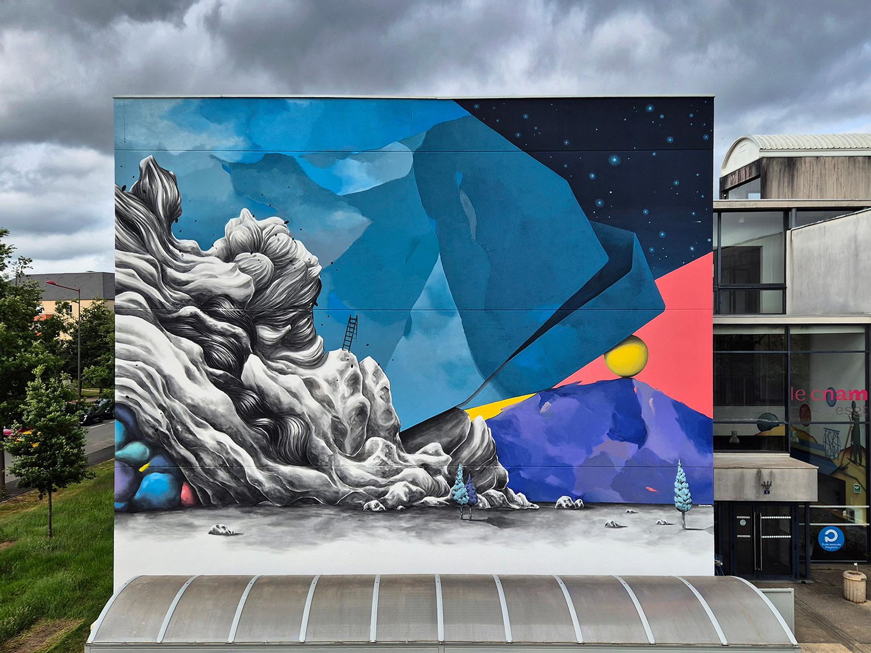Mural created on the facade of the Cnam Higher School of Engineers, Surveyors and Topographers (ESGT) in Le Mans. Curated by Plein Champ - 2025