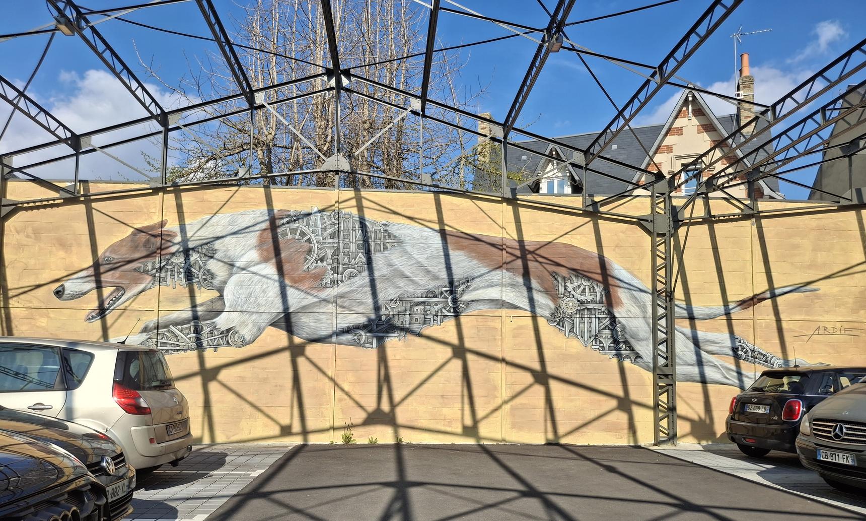 Au fond de cet ancien hangar transformé en parking, Ardif nous propose un lévrier en pleine action.