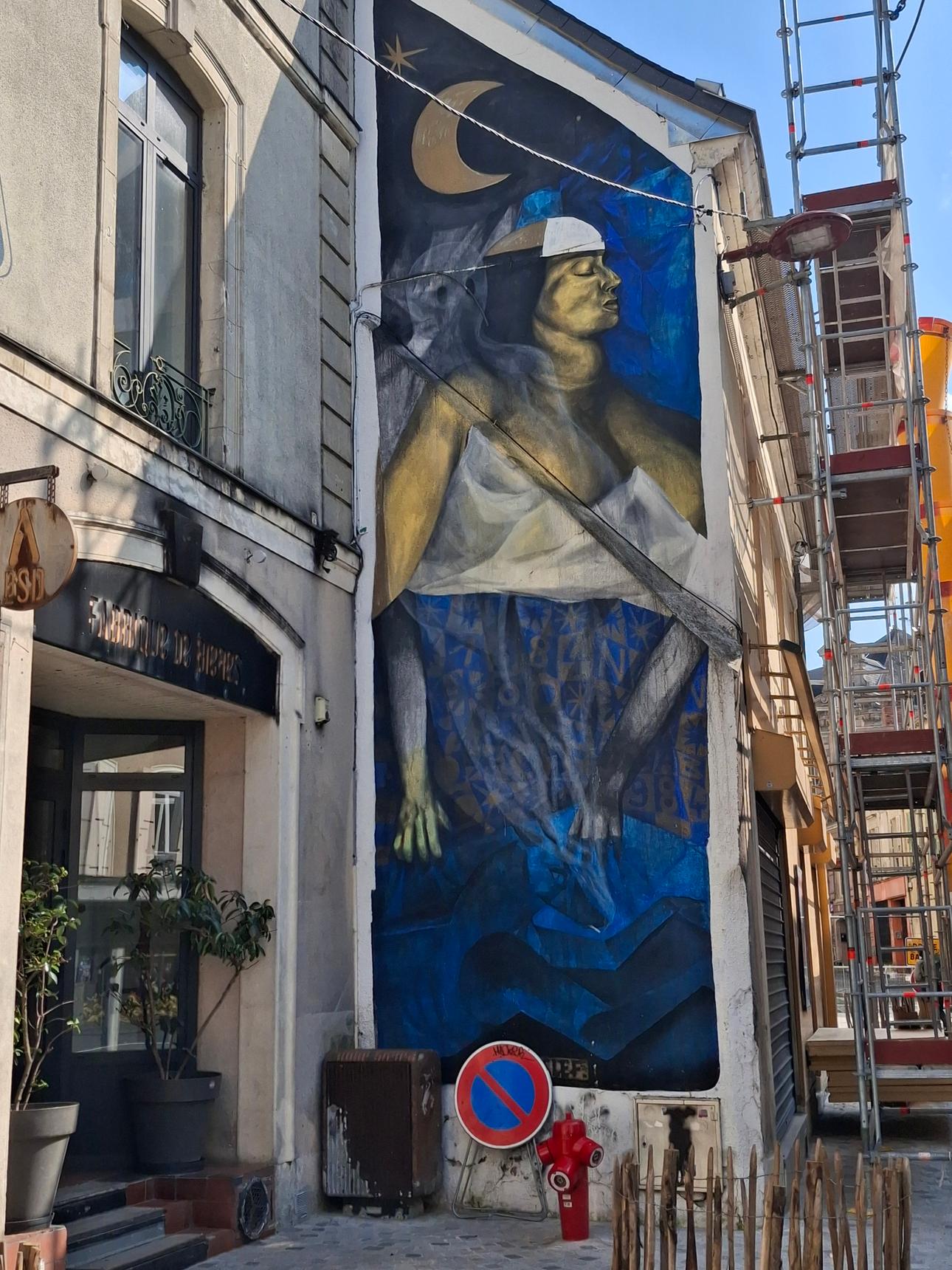 Kazy painted this mural on the walls of downtown Le Mans. He presents us with a somewhat mysterious work depicting a woman who appears to be asleep, surrounded by the ghost of her dreams, hence the name the artist gave to his mural: "Smoky Spooky Dreams".