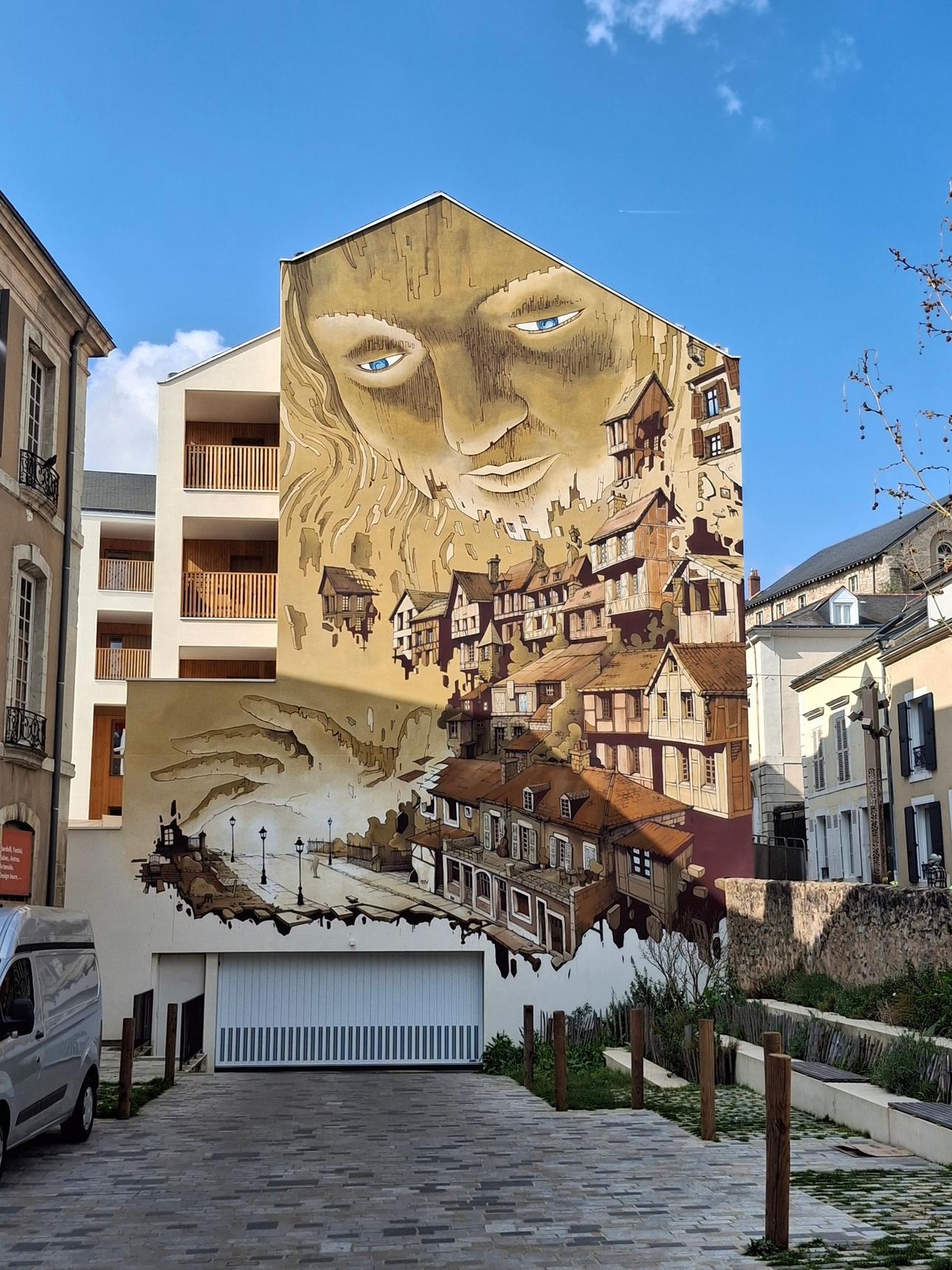 The idea behind the mural is to reopen the dialogue with the old town, the Plantagenet city, by playing on its proximity to the Saint-Pierre-la-Cour collegiate church, which required working with the architects of the Bâtiments de France (French National Heritage Buildings).