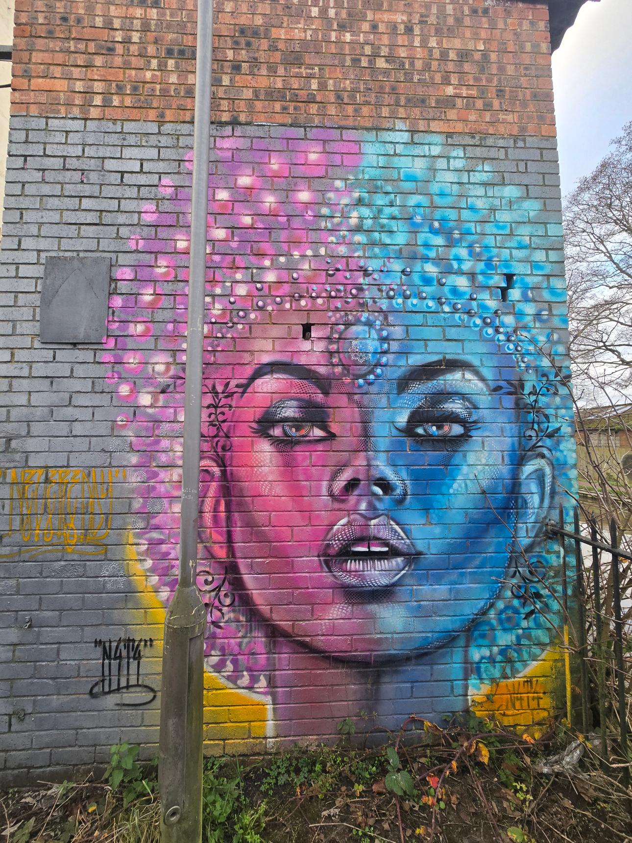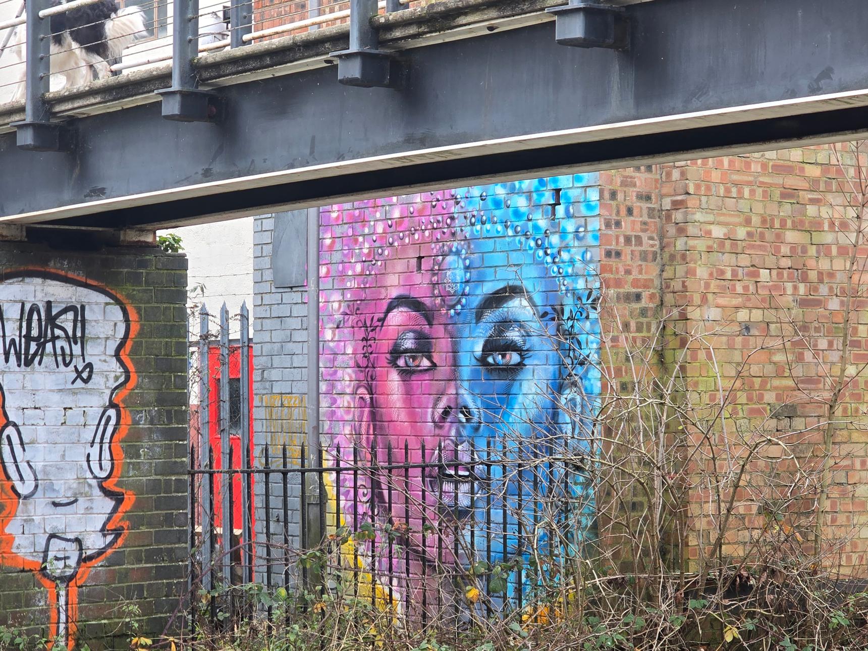 South side of canal, by footbridge. Access from canal by Althorpe Street, or from the Eagle Recreational Ground to the south. There is a lot of other art near here that is constantly changing. This piece by N4T4 has remained untouched