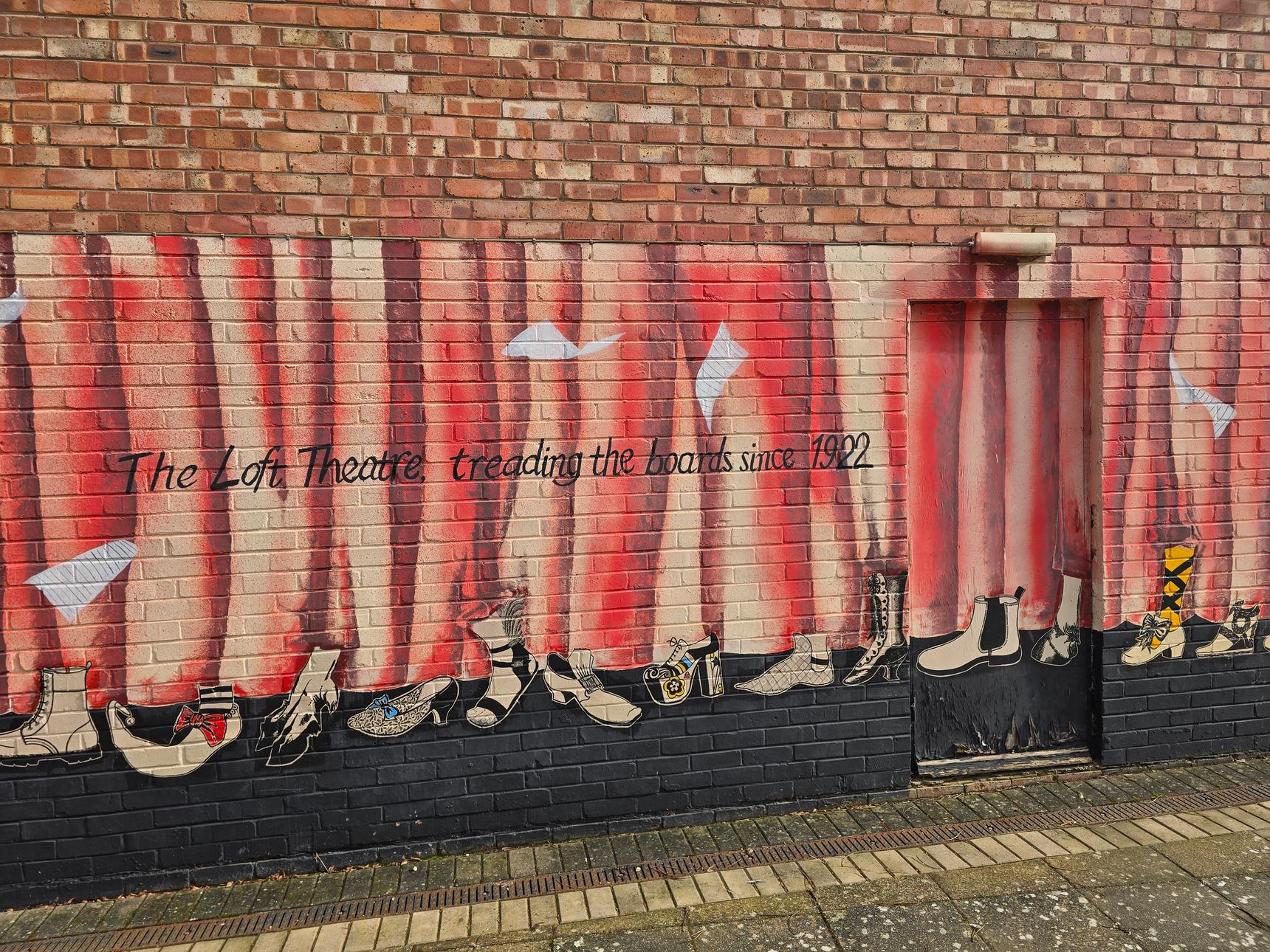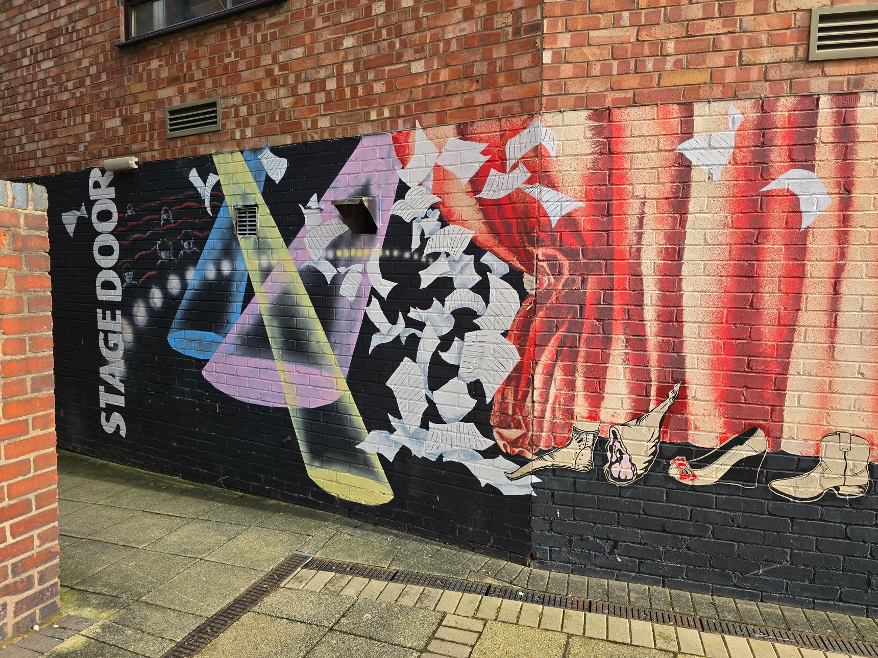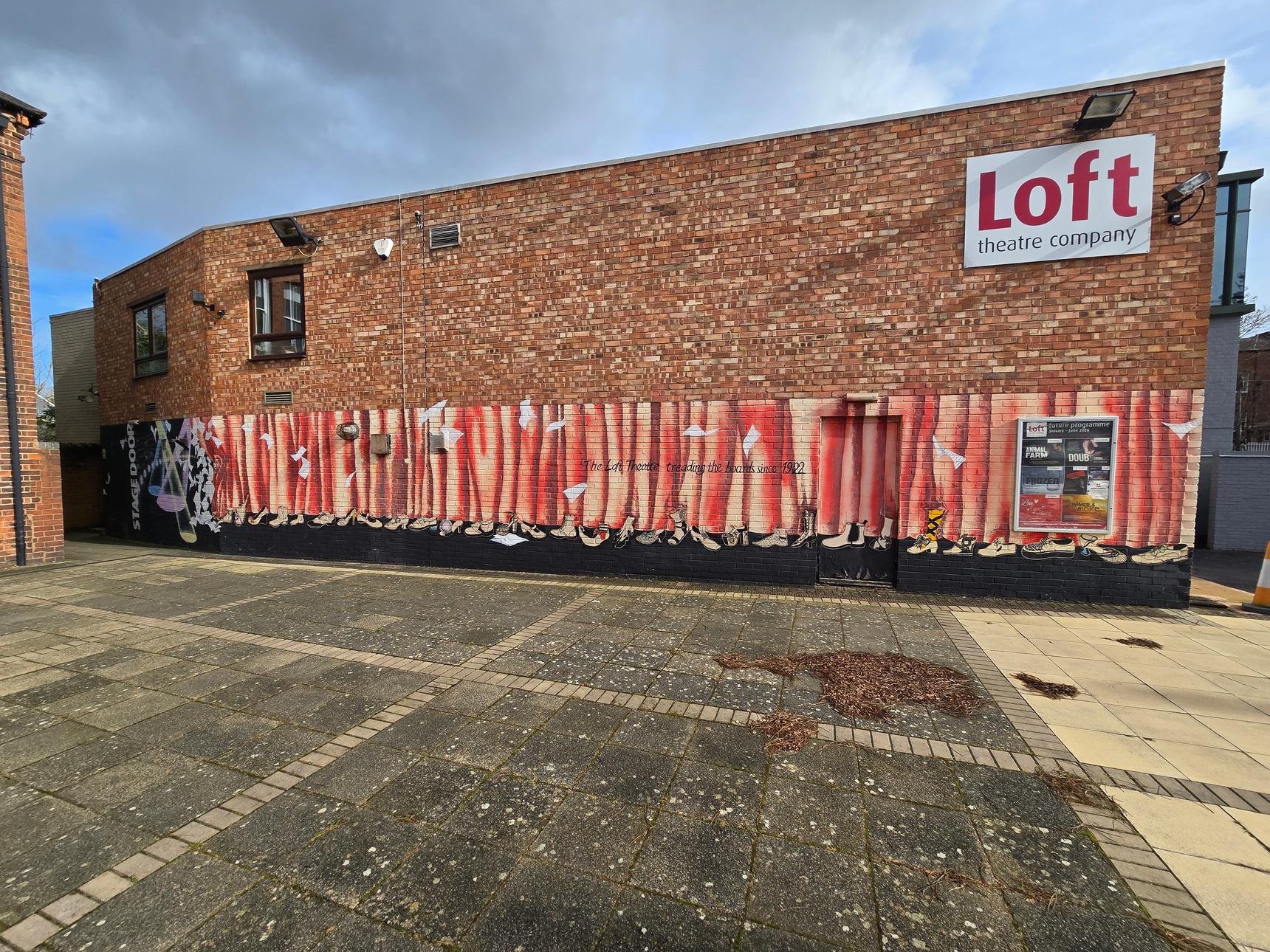 Mural on the side of the Loft Theatre. Access to Spencer Yard is from Spencer Street, to the south of the mural.