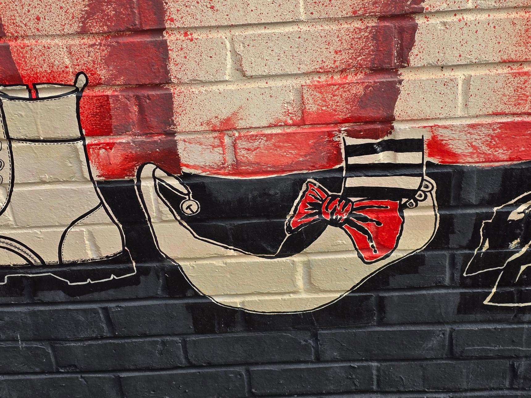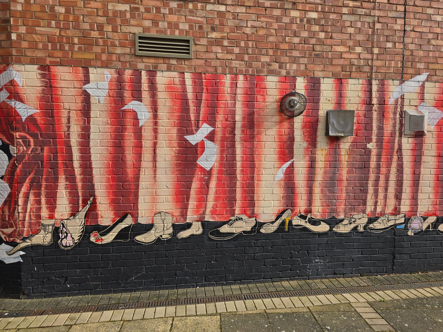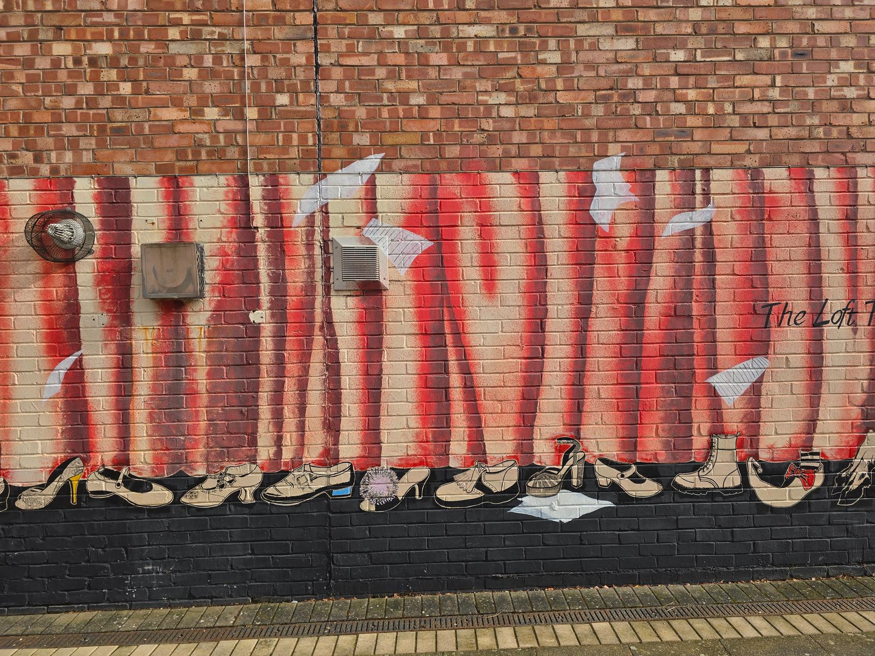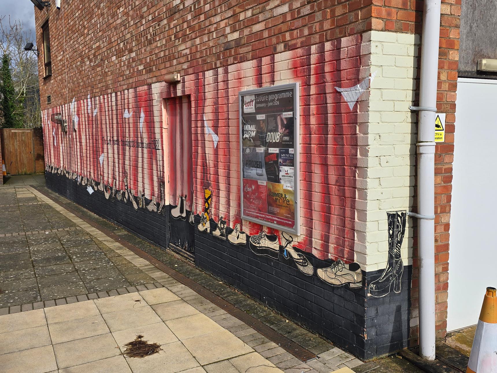 Mural on the side of the Loft Theatre. Access to Spencer Yard is from Spencer Street, to the south of the mural.