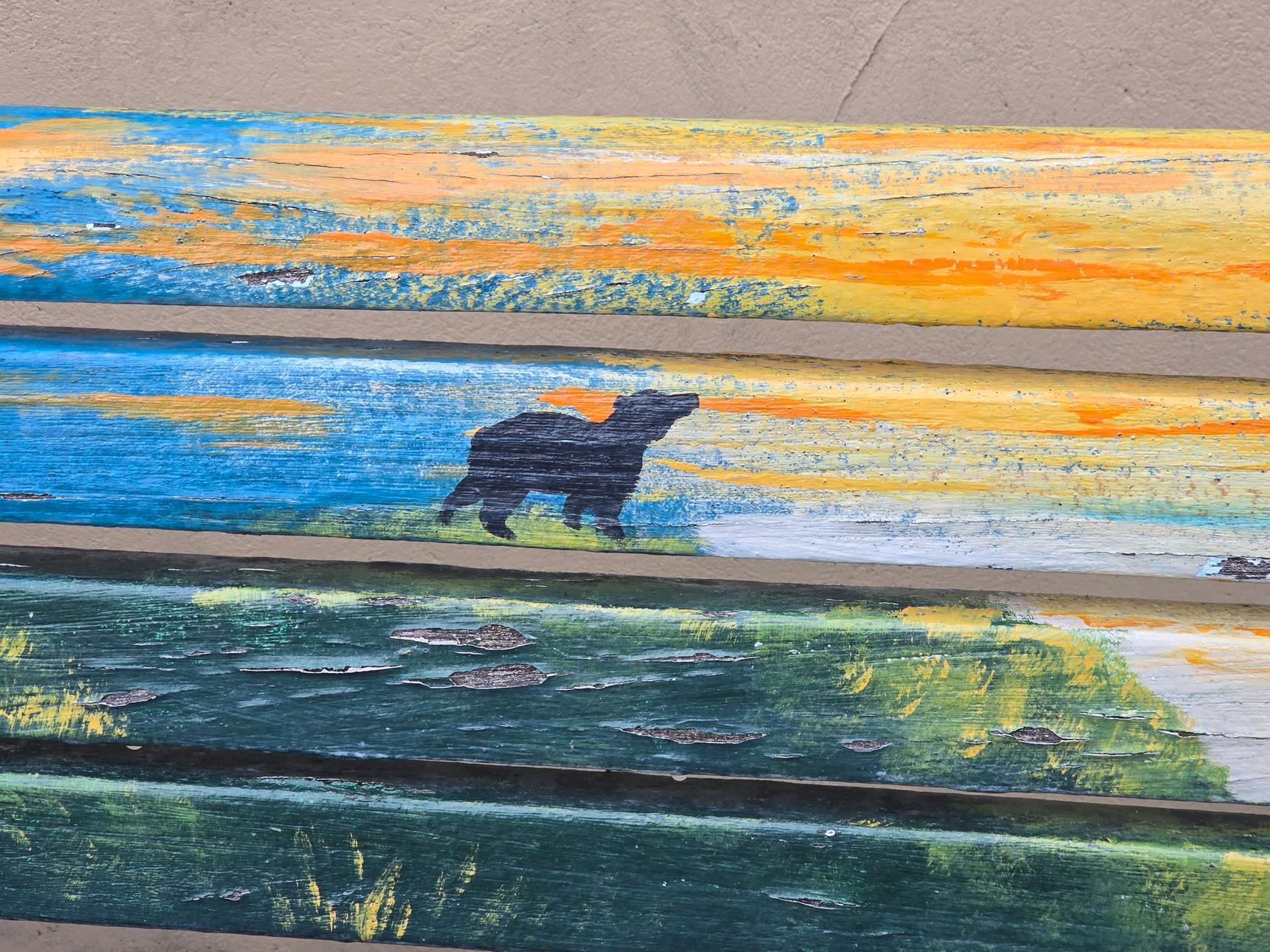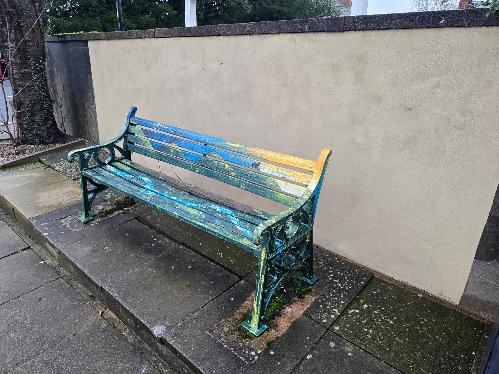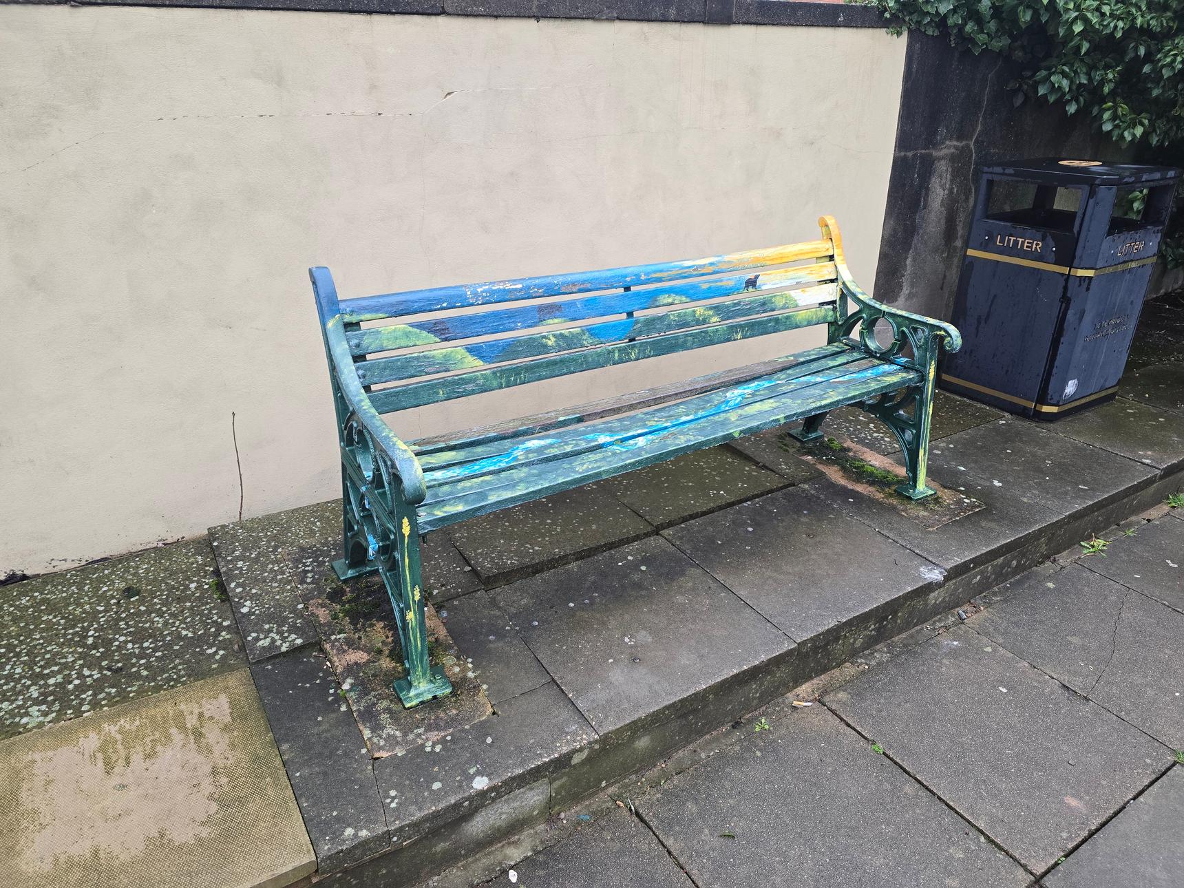 Part of a series old benches, lovingly painted by local artists. This one, and the one near the Bear and Ragged Staff, is by Tabitha Marsh. The concept for this one is a bear without a ragged staff.