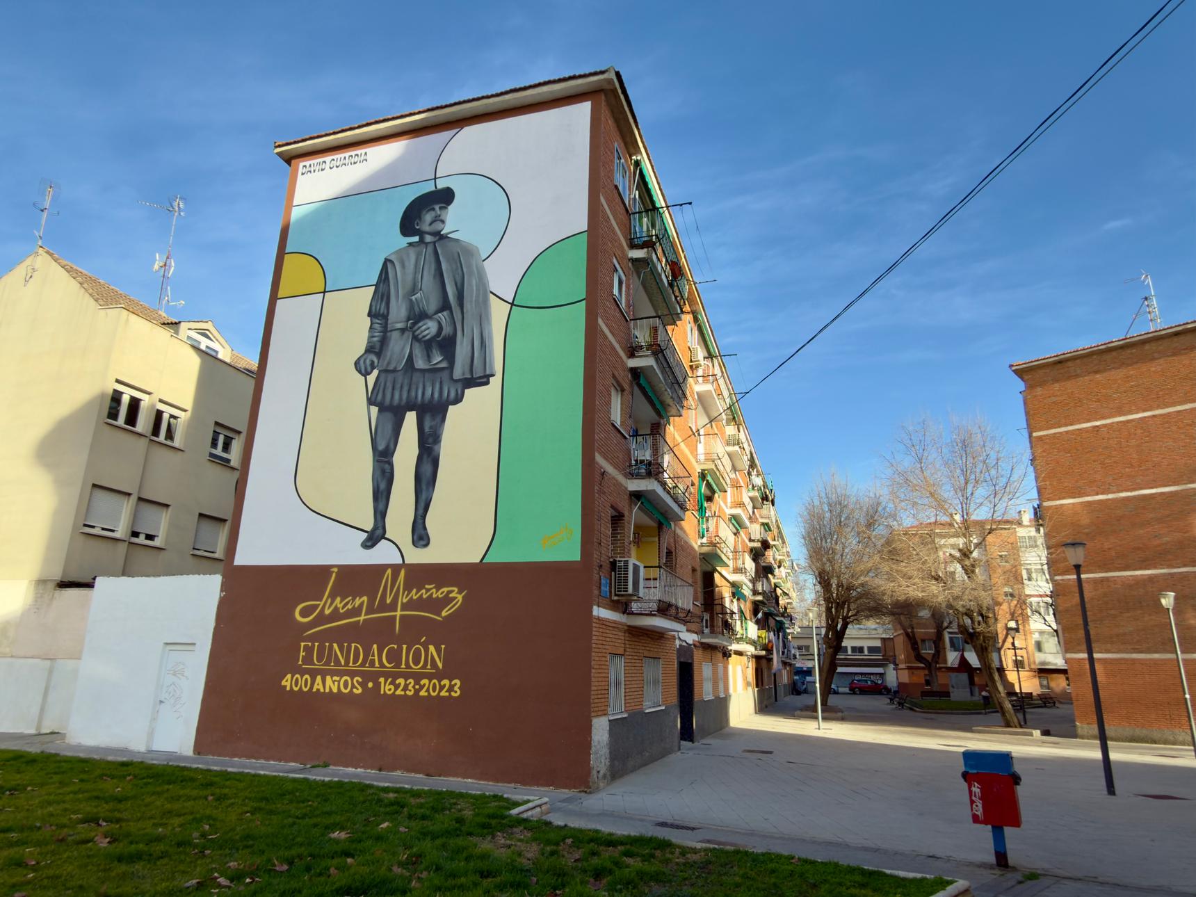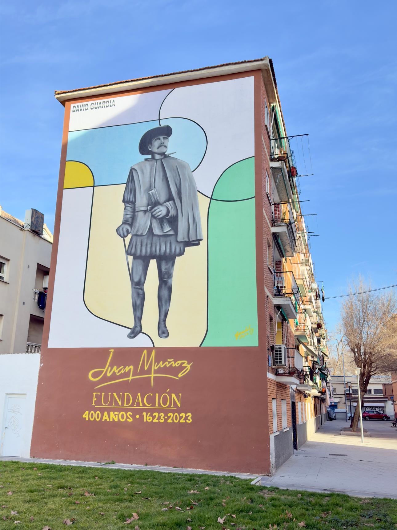 En homenaje a la figura de Juan Muñoz y a la Fundación que lleva su nombre en el ciudad de Leganés, el artista David Guardia ha plasmado su figura en esta fachada junto a la iglesia de San Nicasio. Un mural de 13 metros de alto por 7 de ancho, todo ello con motivo del IV Centenario del nacimiento de la Fundación.