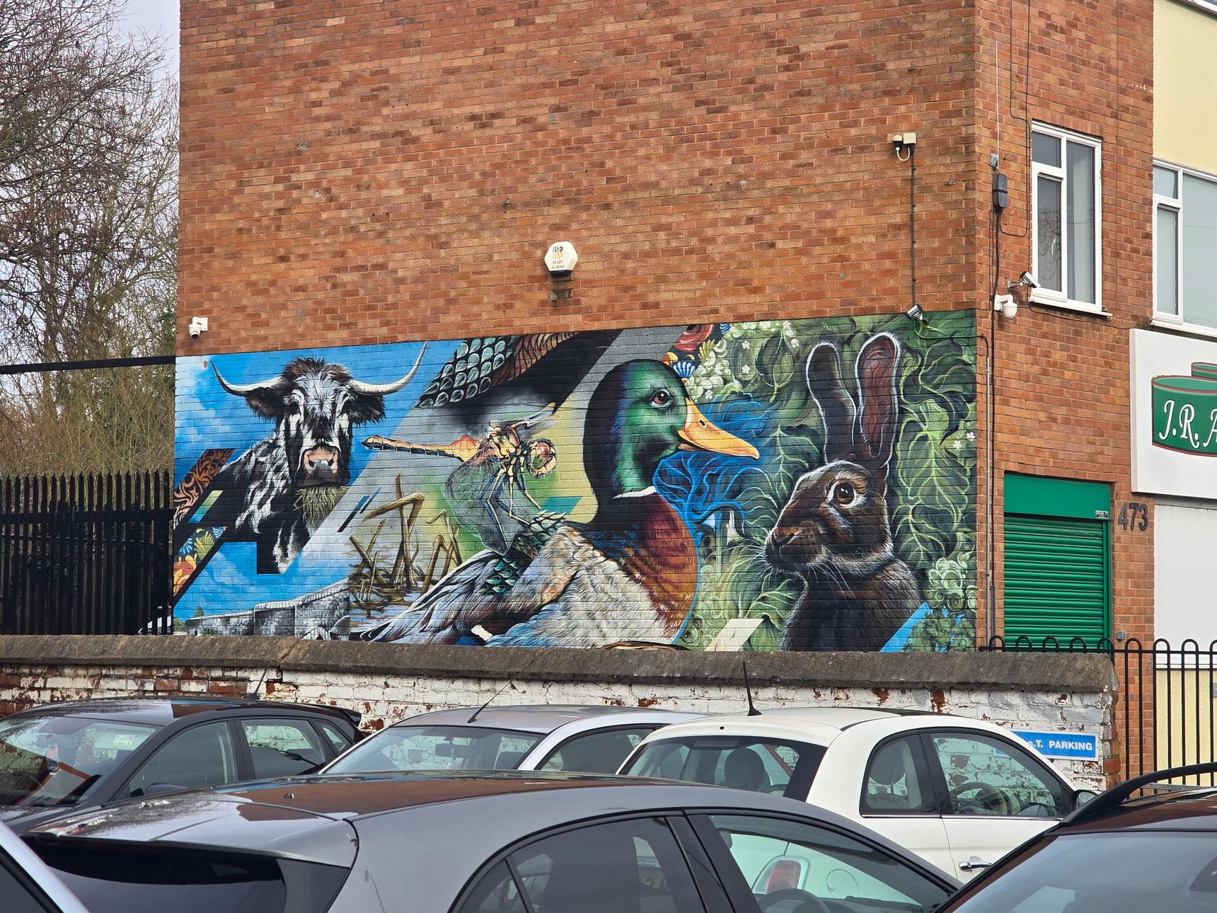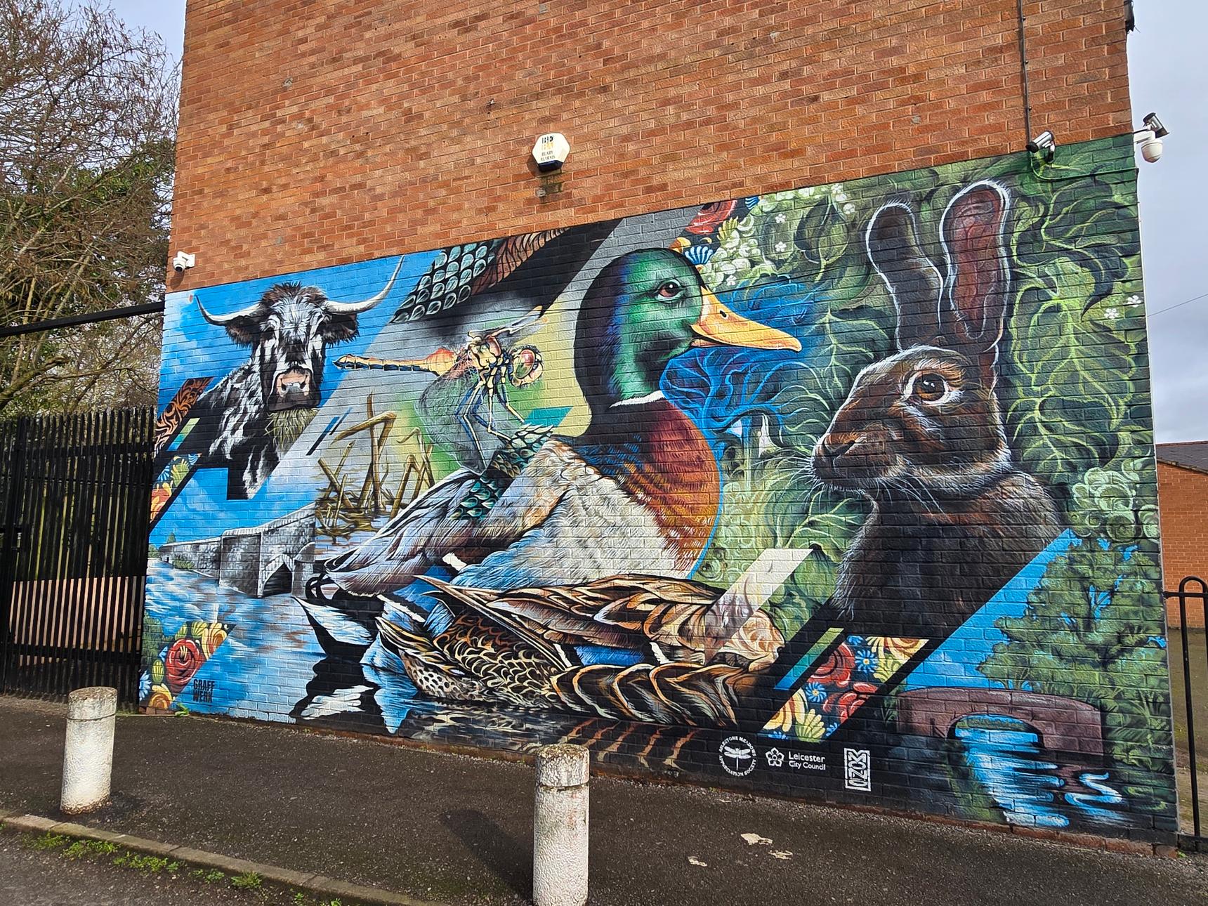 This mural was commissioned by the Aylestone Meadows Appreciation Society, with funding by Leicester City Council. For a bit more about the mural, see here.