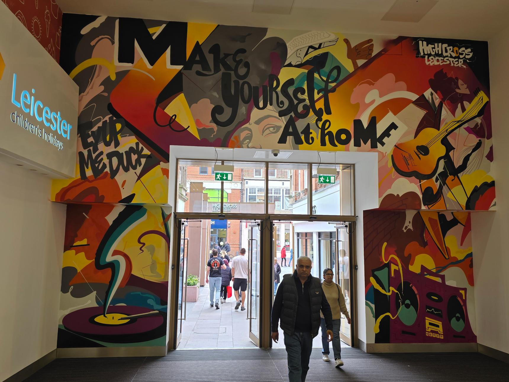 Created to celebrate Leicester Music, this mural was commissioned by Highcross Shopping Centre, in conjunction with Graffwork. To listen to an interview about this mural, see here.