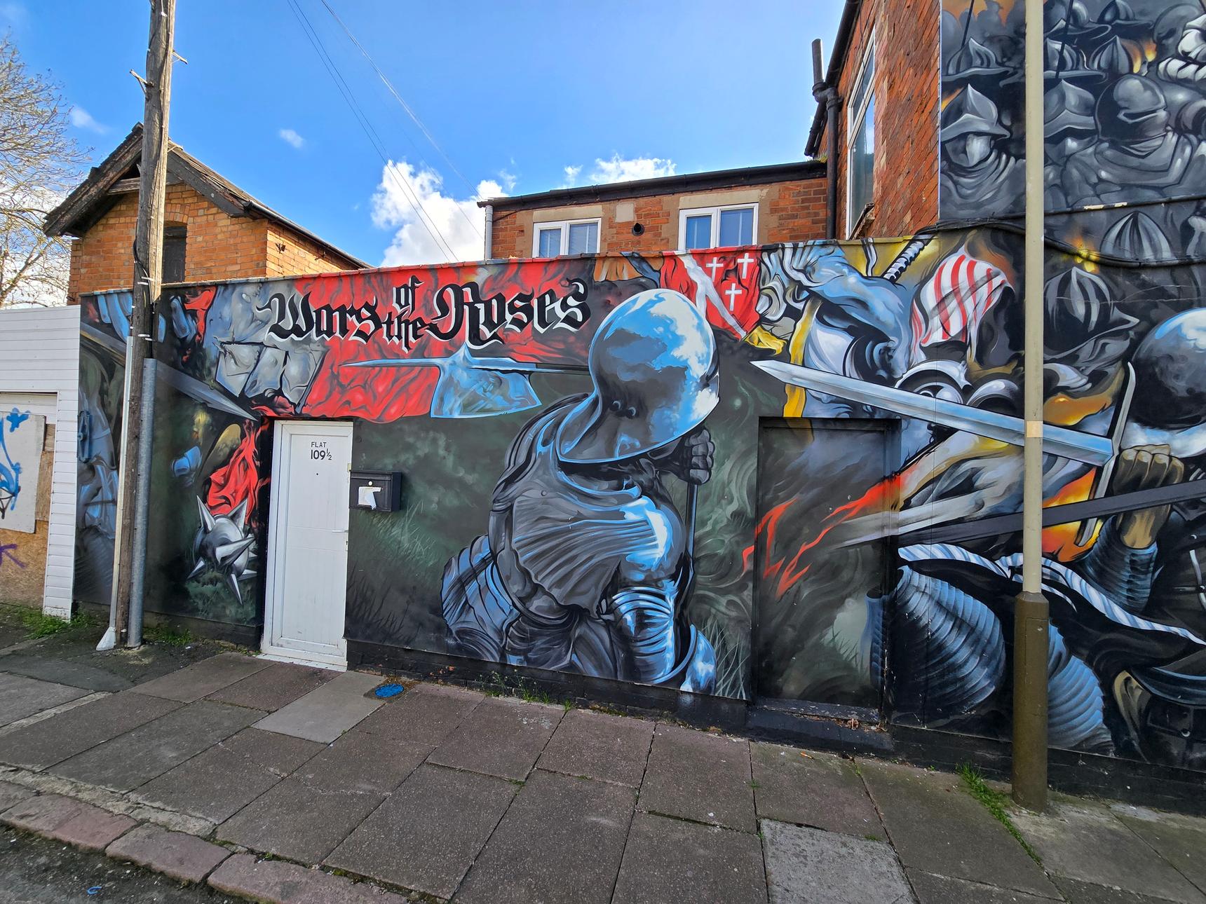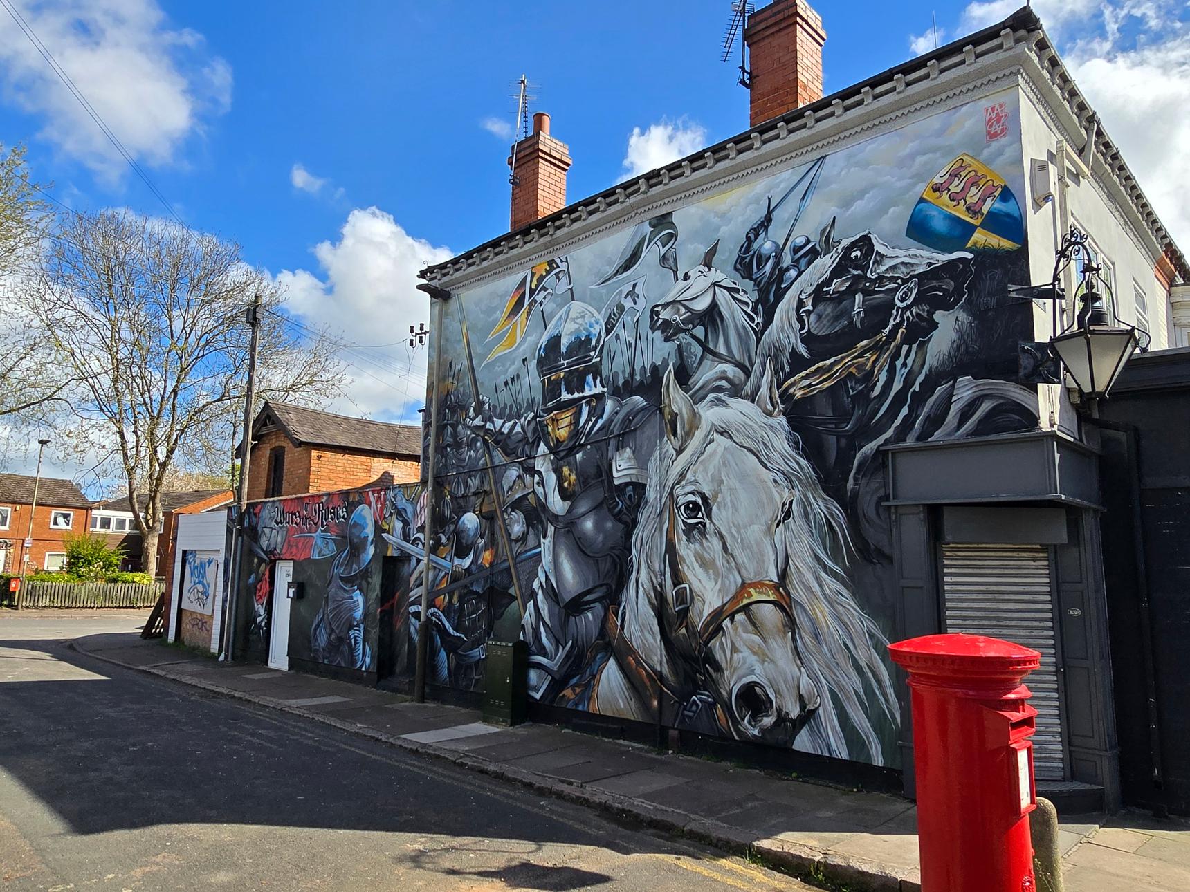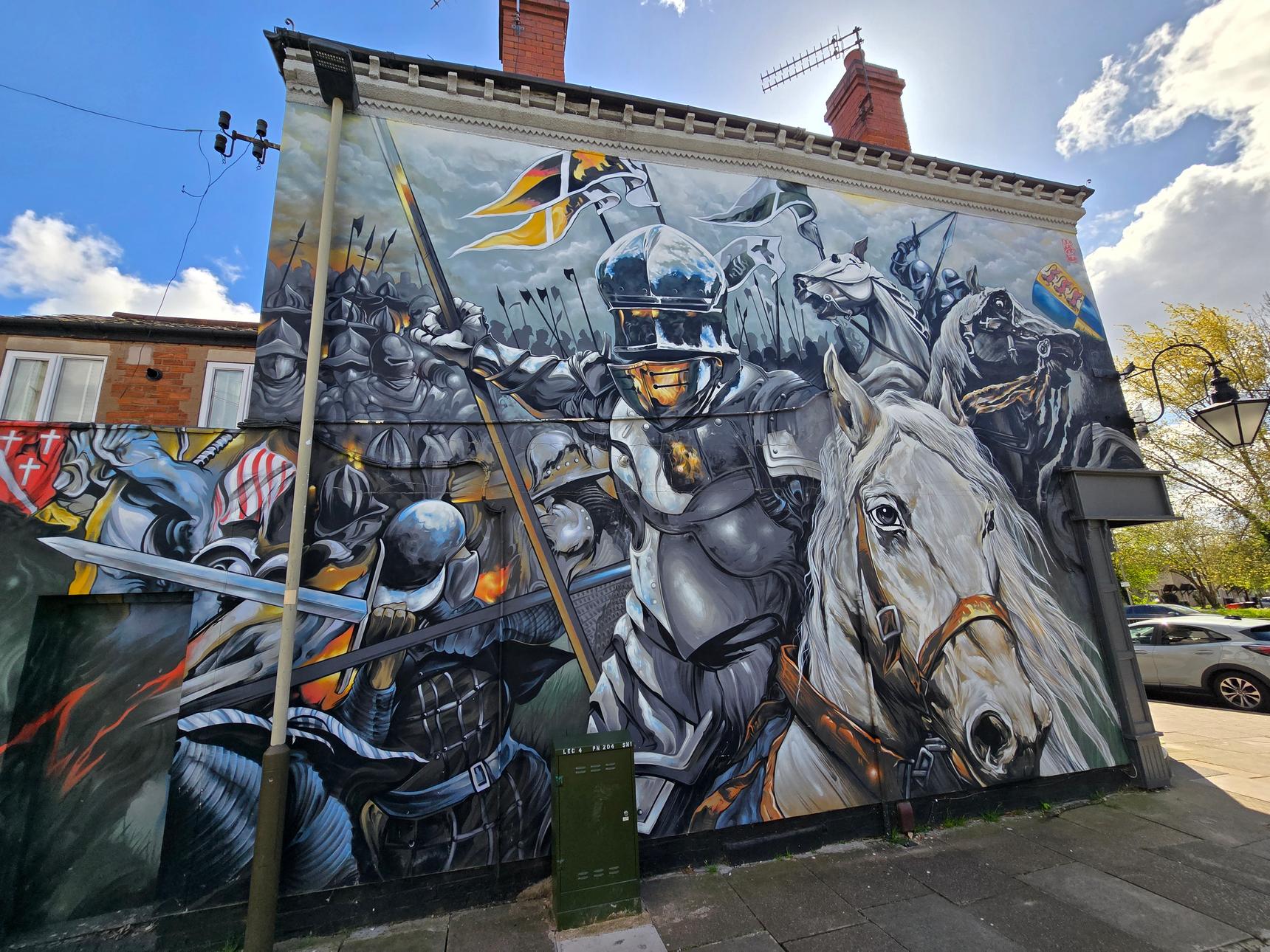 This mural was commissioned in 2021 by Leicester City Council. It depicts the Battle of Bosworth, where King Richard III was defeated. His remains were, centuries later, discovered buried under a car park in Leicester.