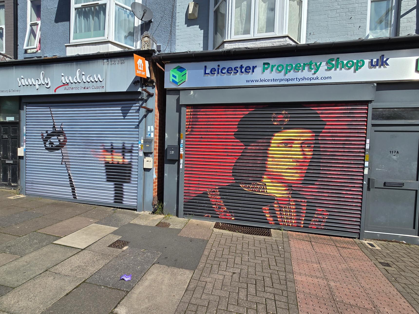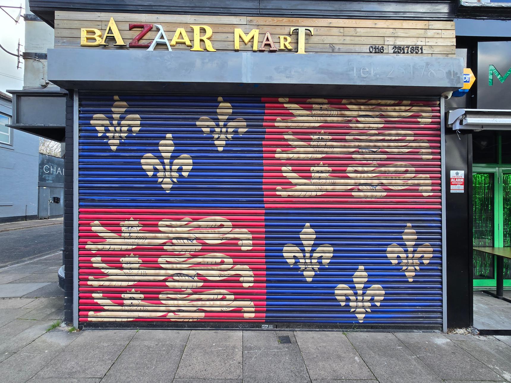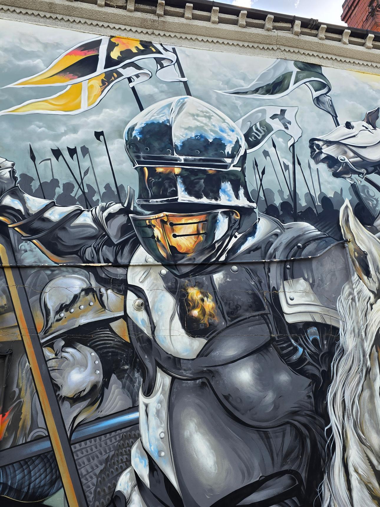 This mural was commissioned in 2021 by Leicester City Council. It depicts the Battle of Bosworth, where King Richard III was defeated. His remains were, centuries later, discovered buried under a car park in Leicester.
