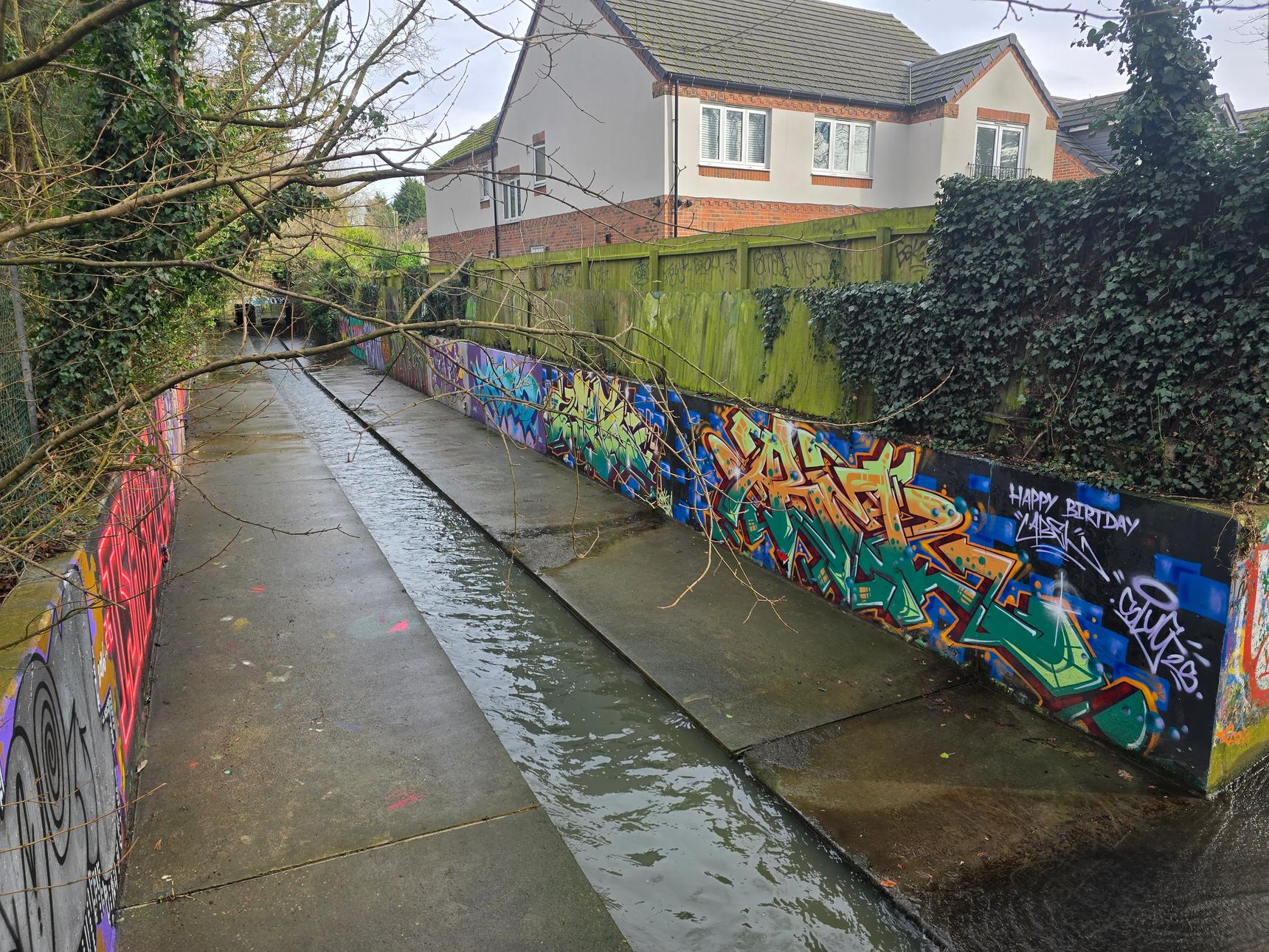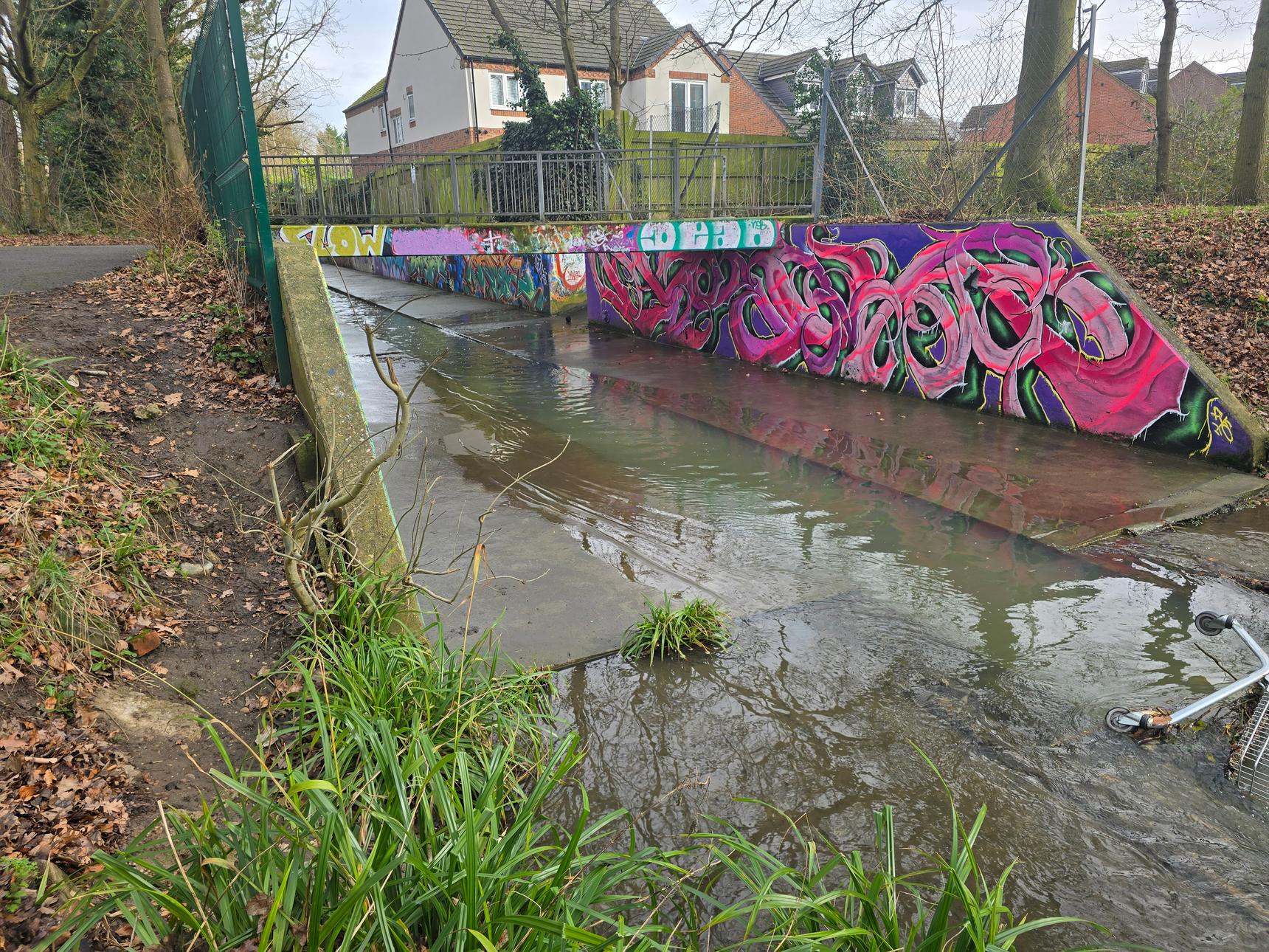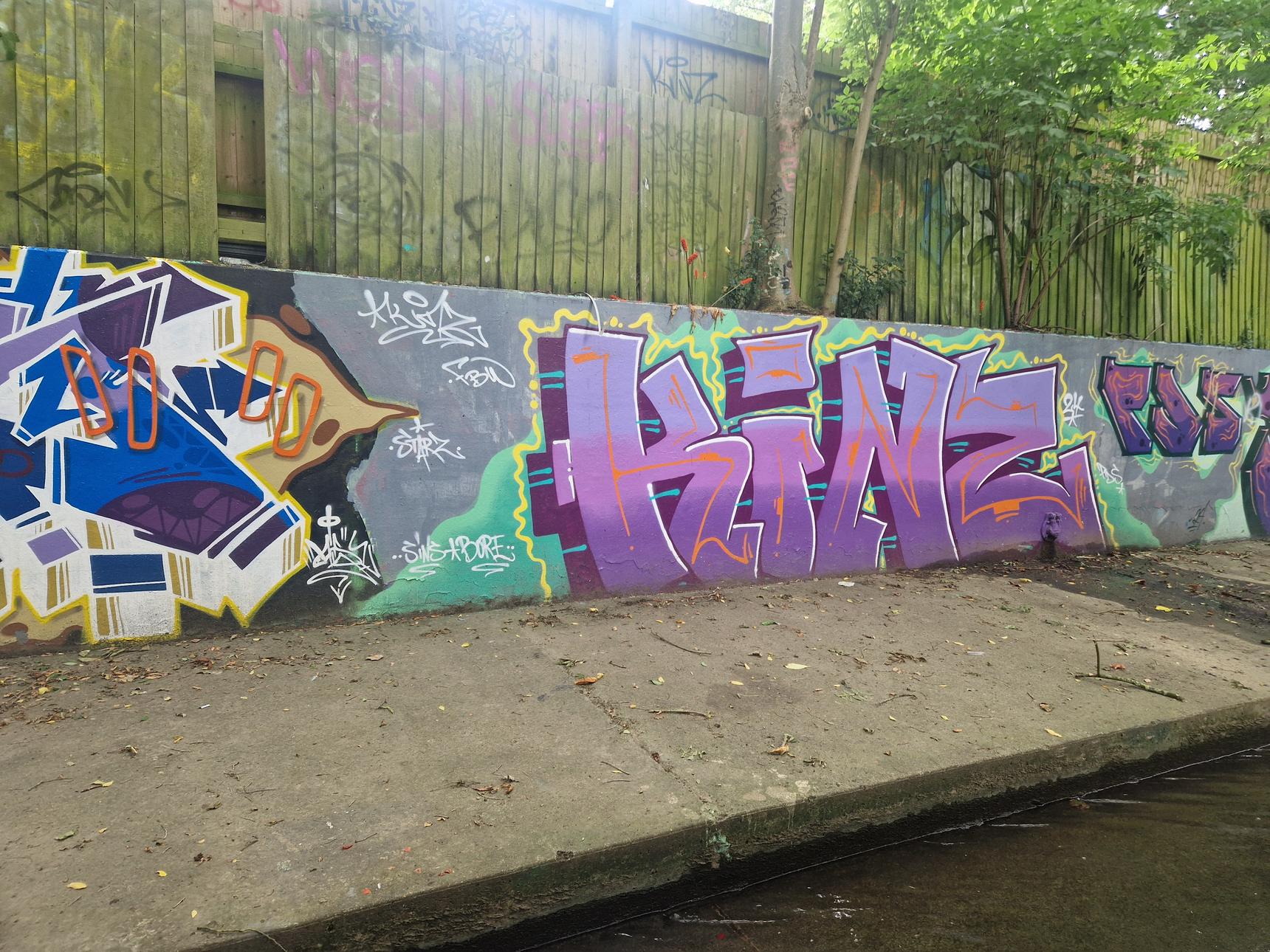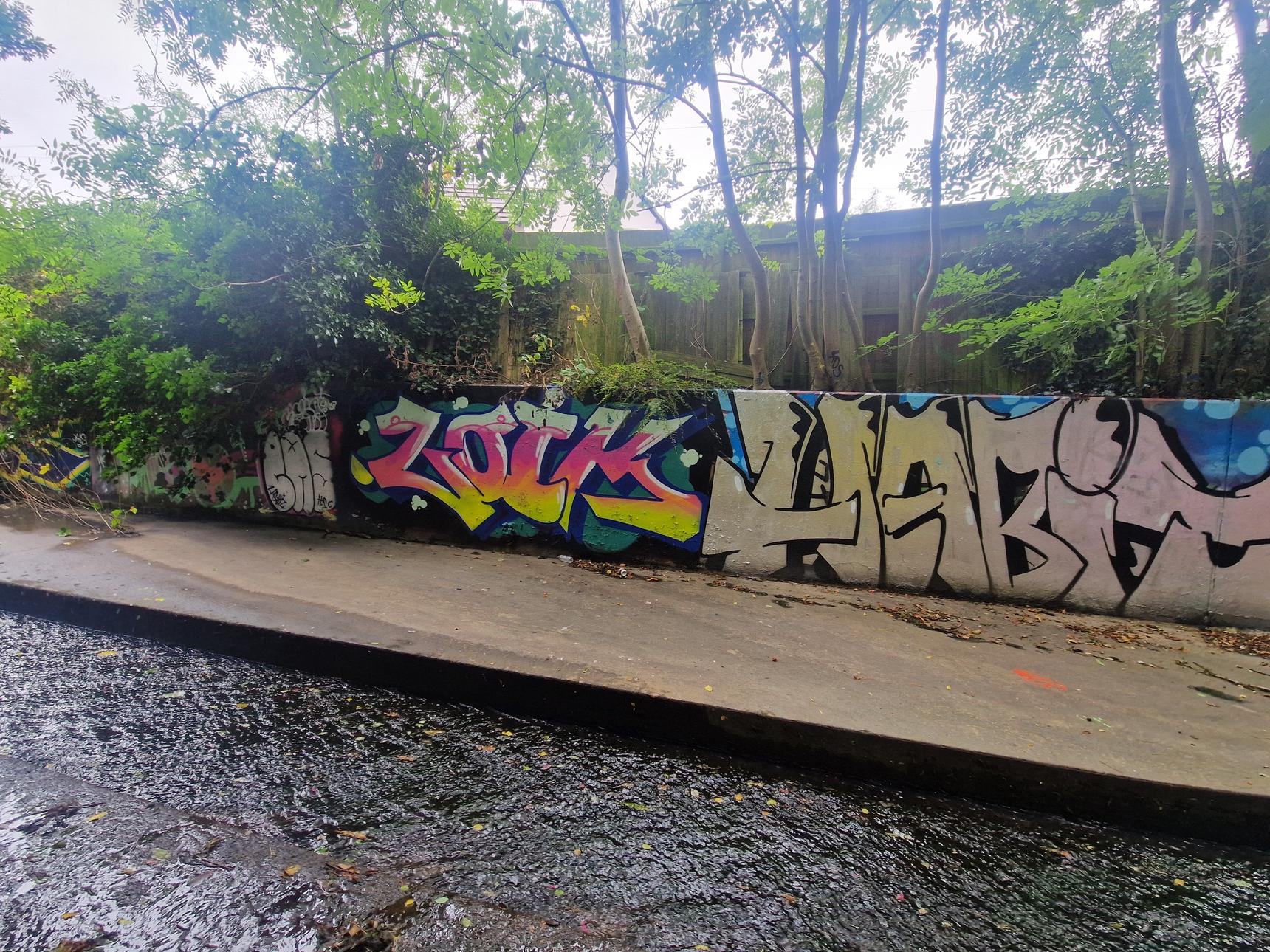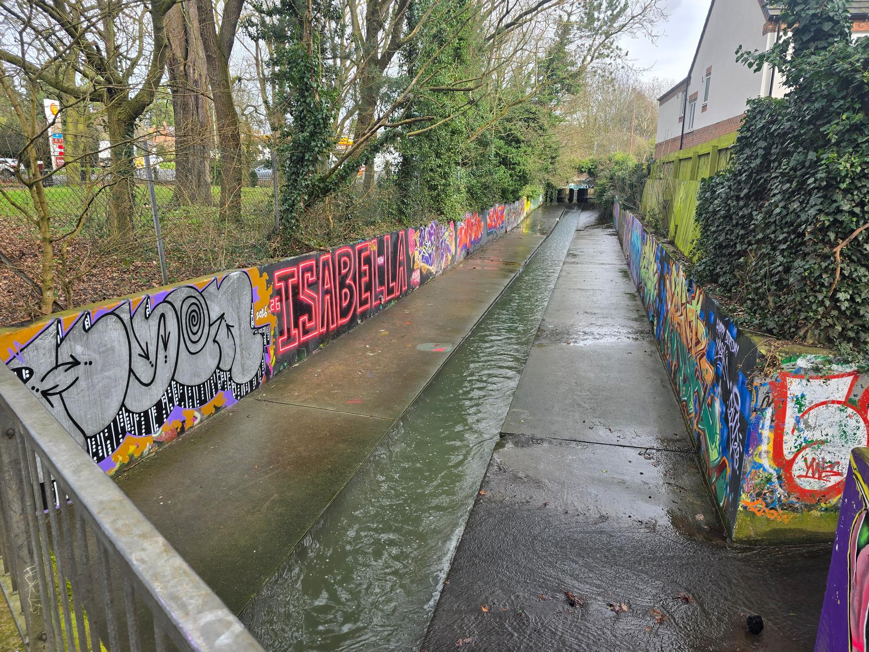 Legal spray paint location on the concrete walls of the storm drain, where Bushby Brook flows into Humberstone Park.