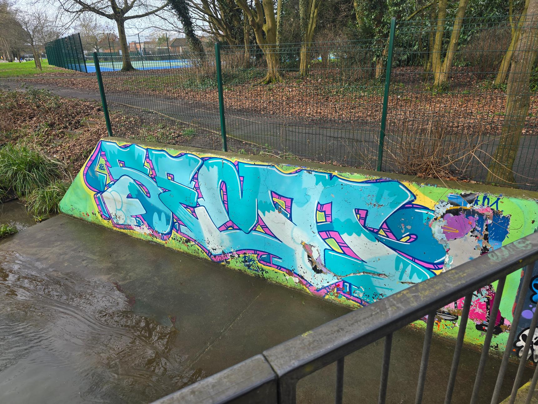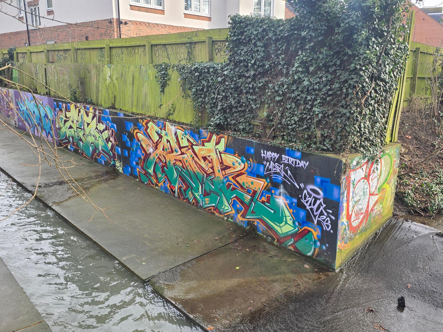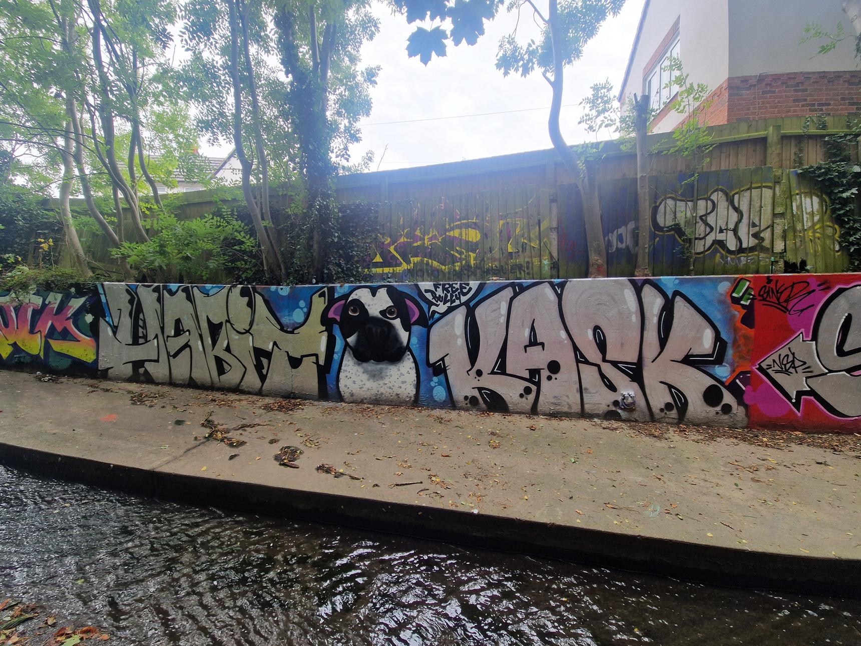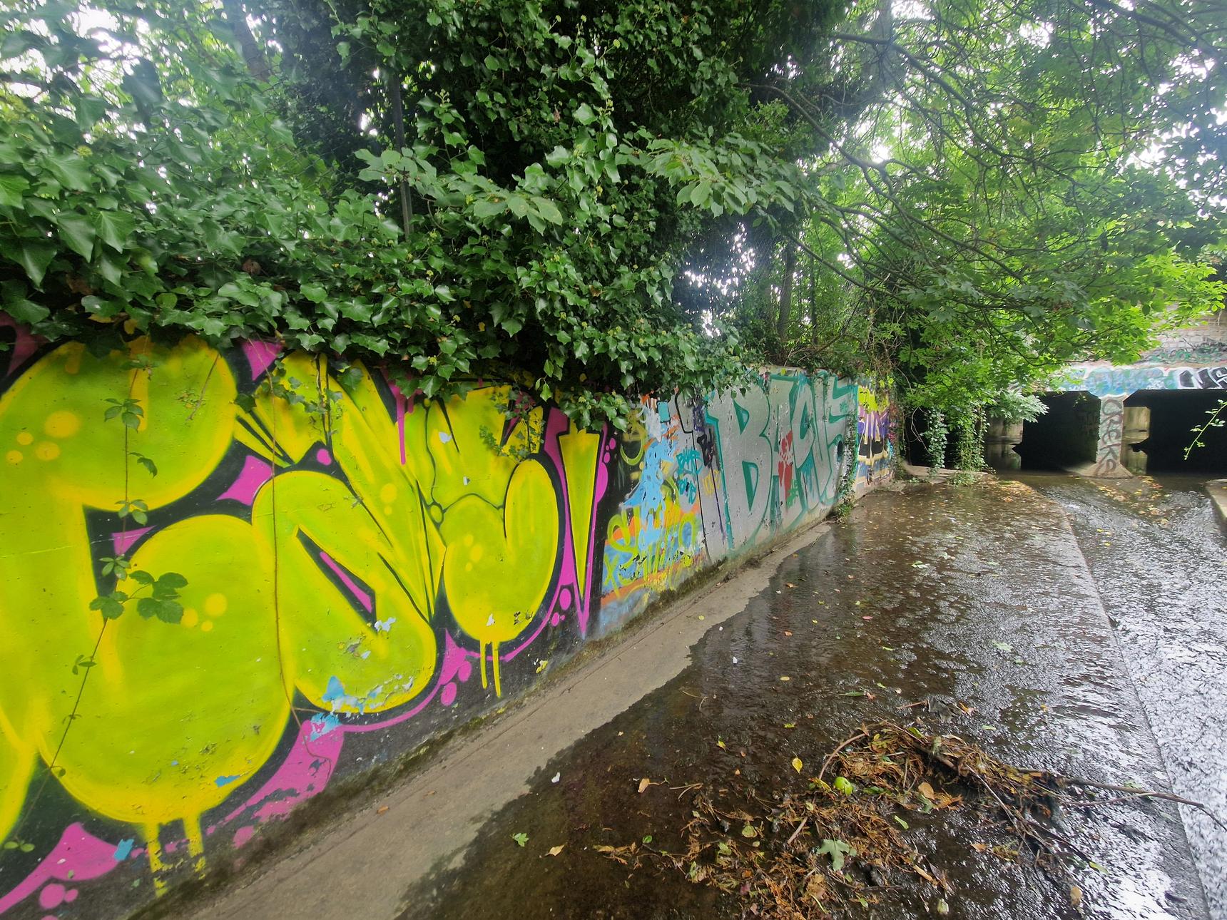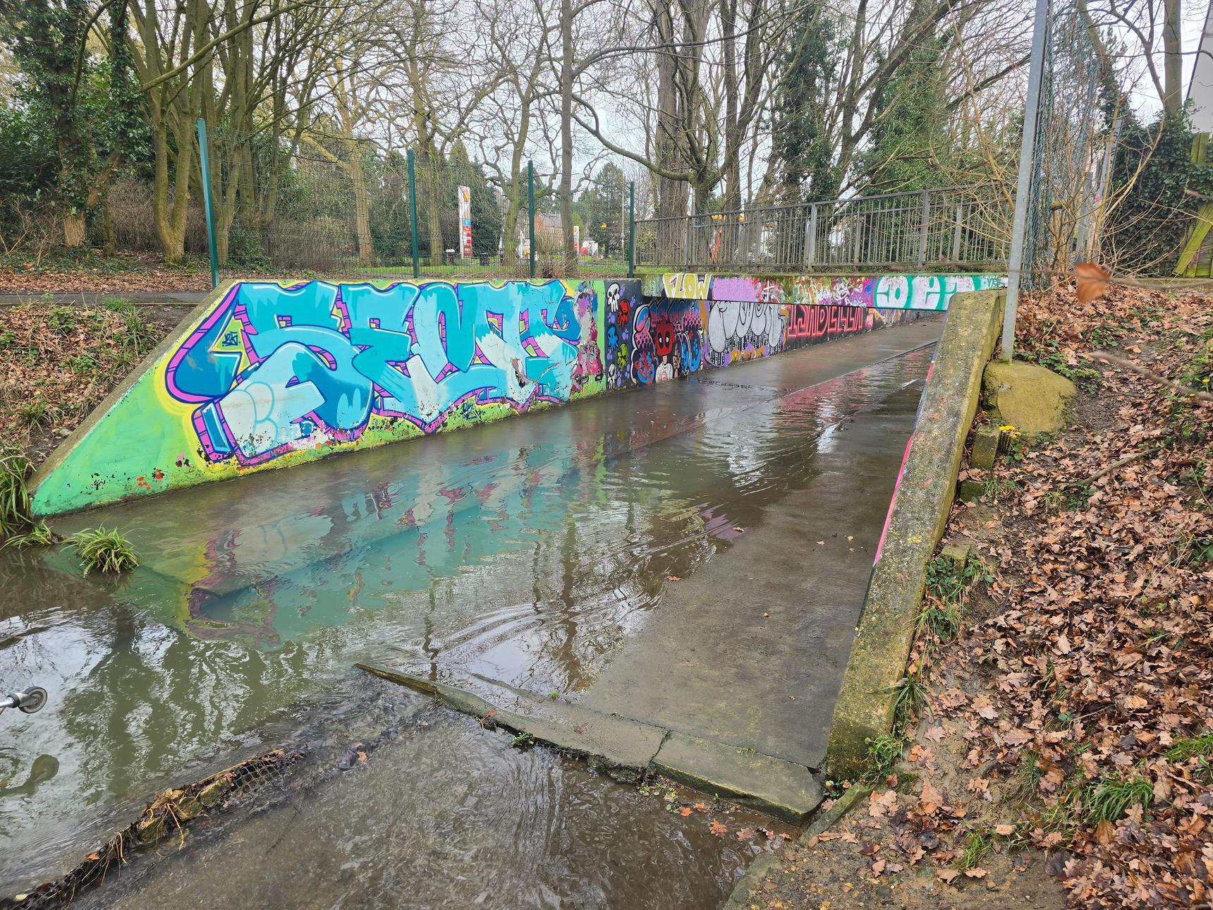 Legal spray paint location on the concrete walls of the storm drain, where Bushby Brook flows into Humberstone Park.