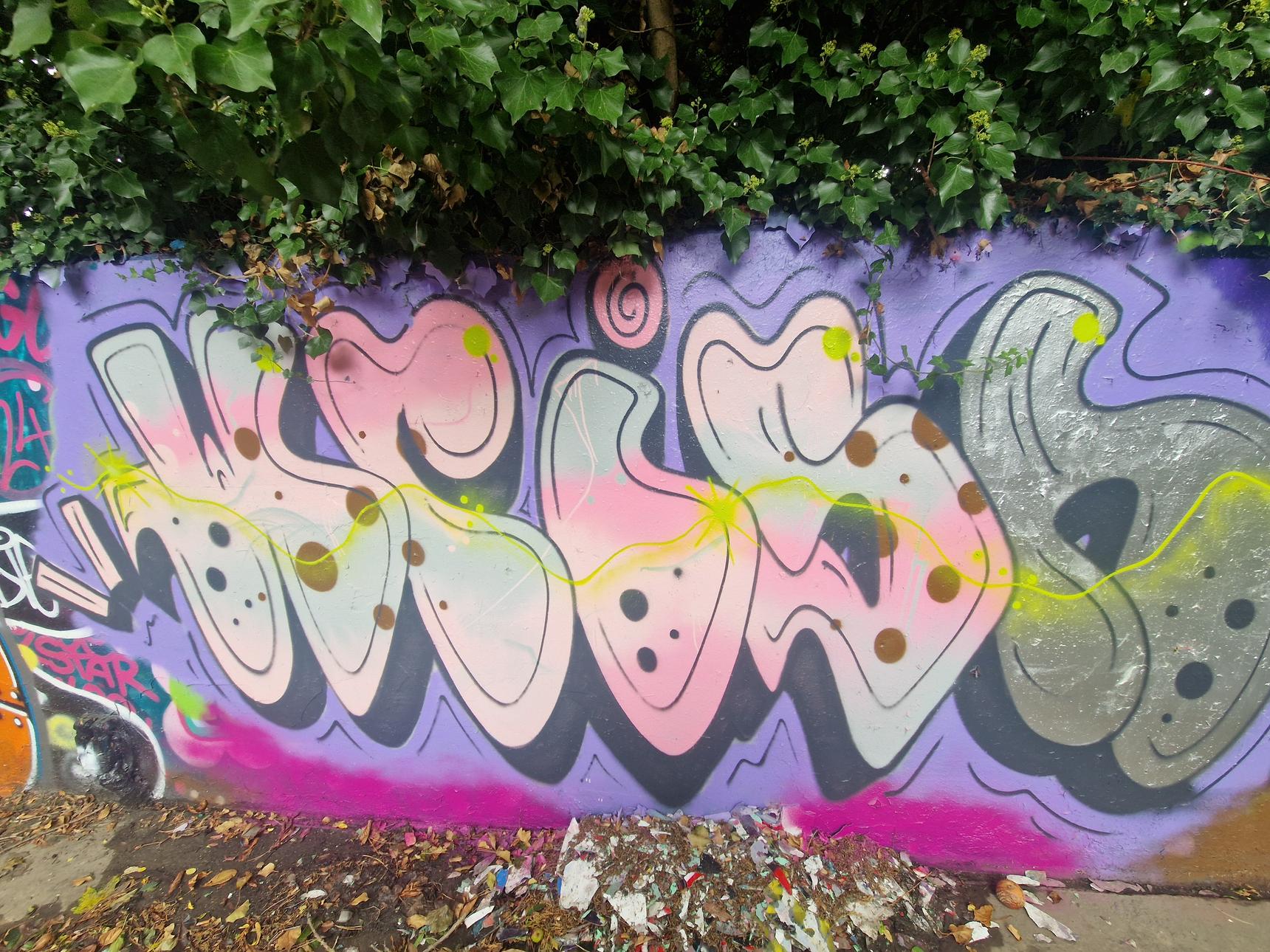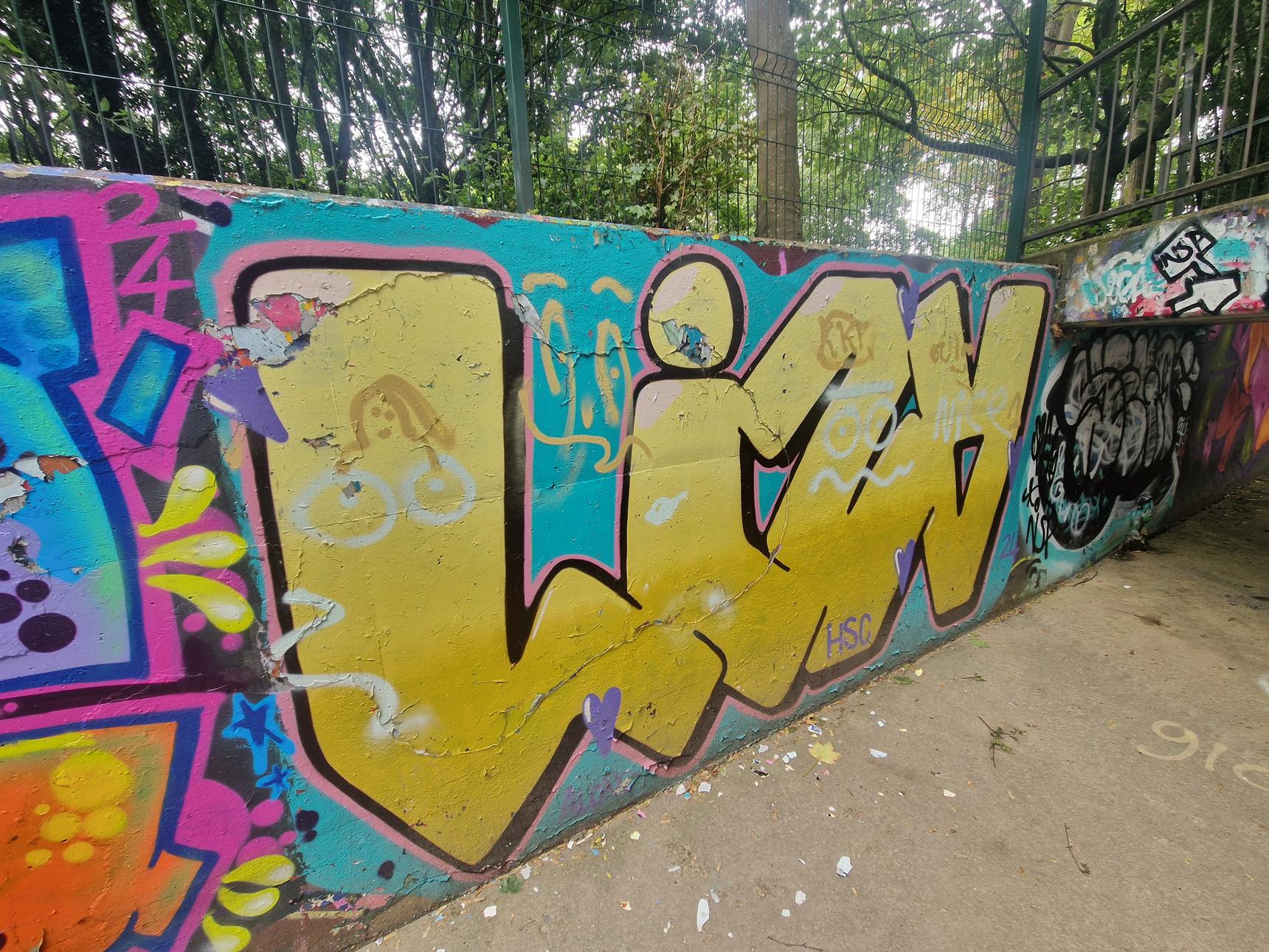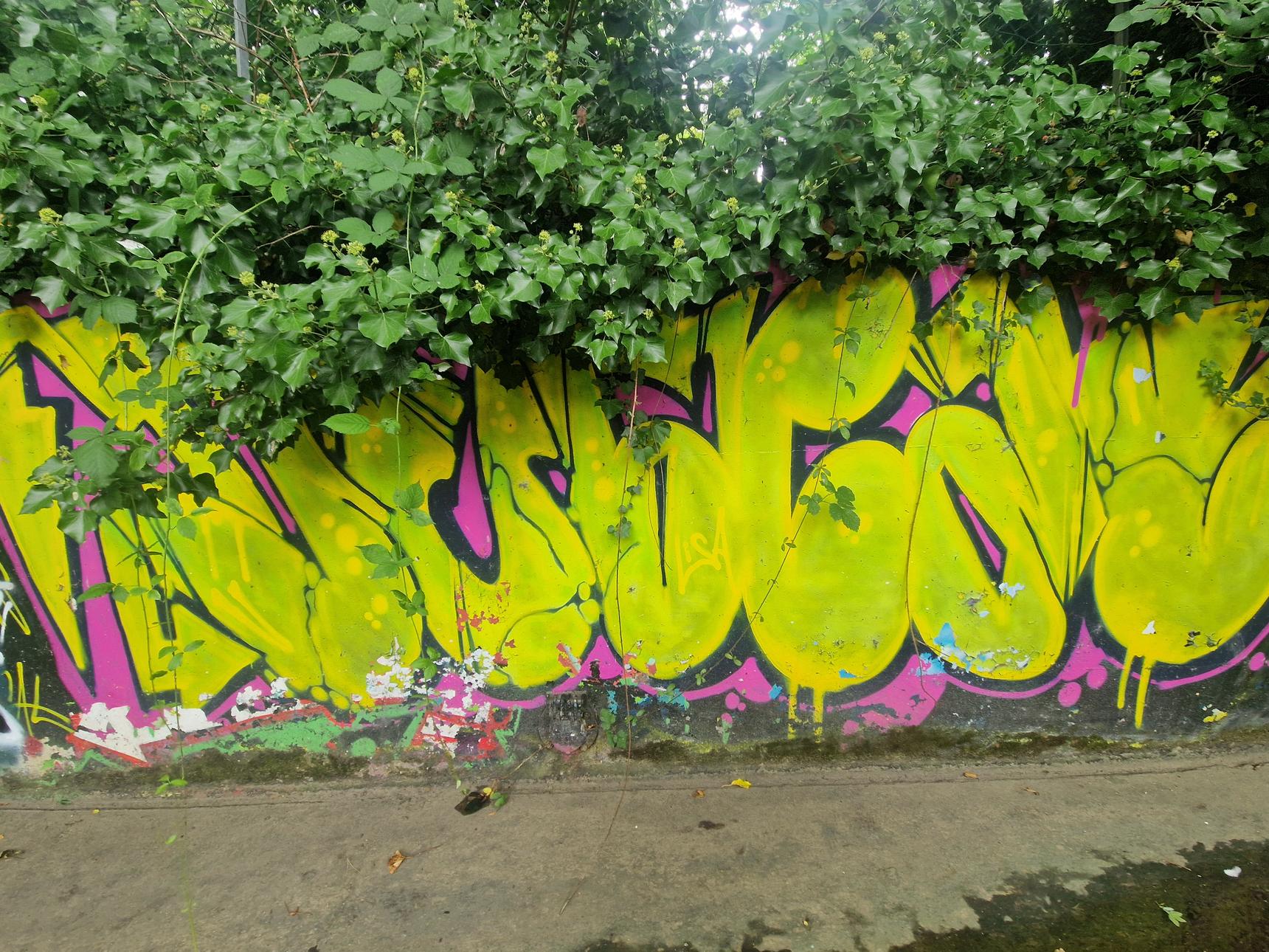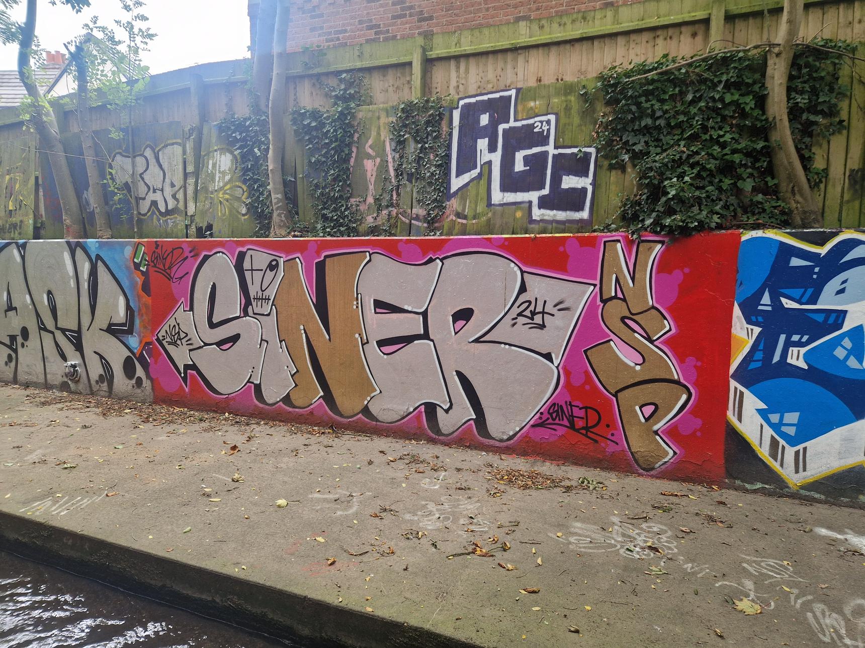 Legal spray paint location on the concrete walls of the storm drain, where Bushby Brook flows into Humberstone Park.