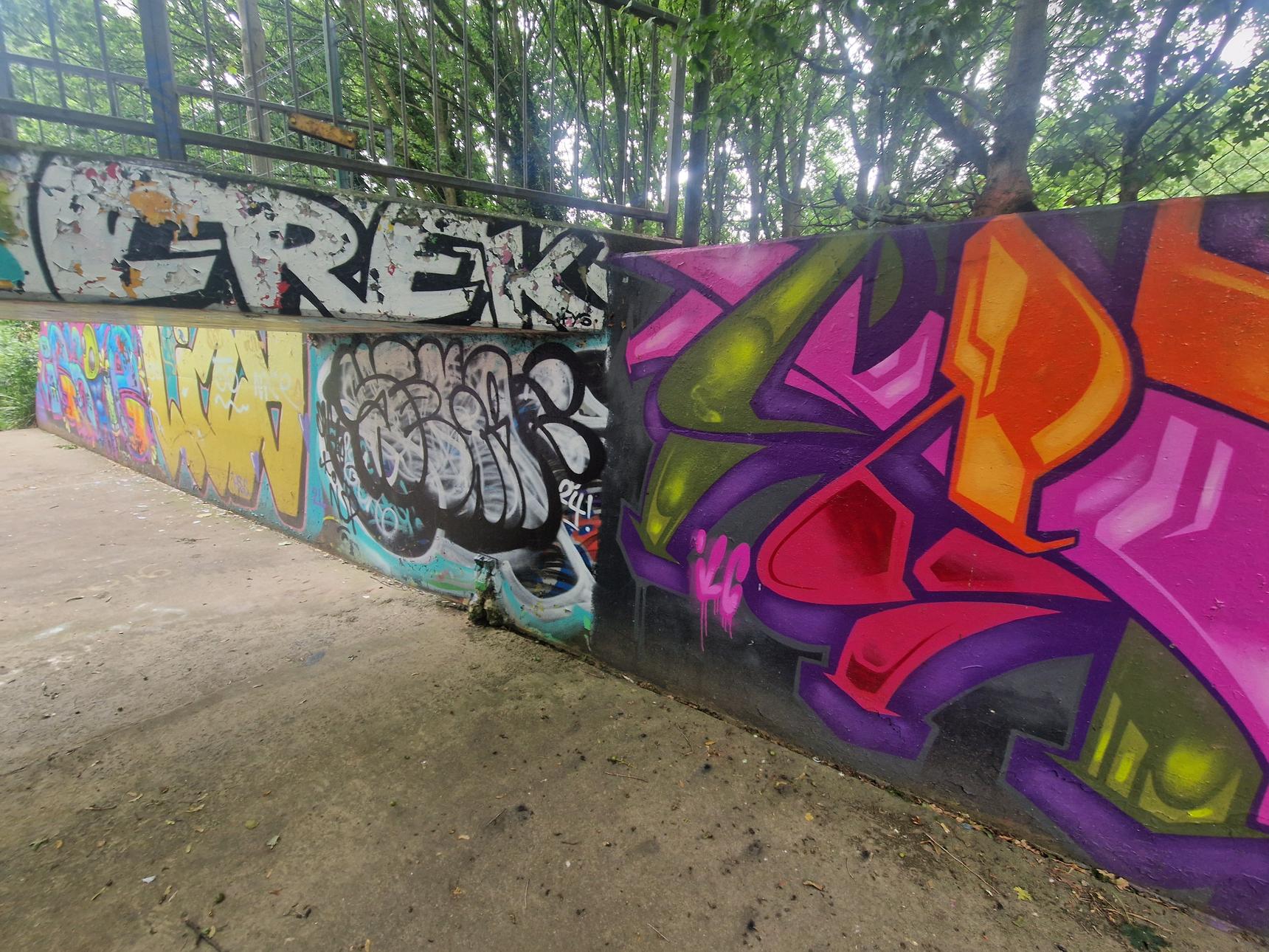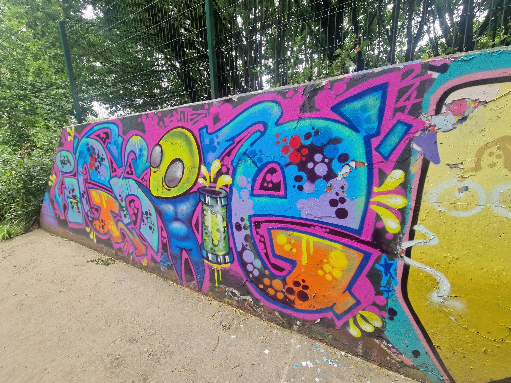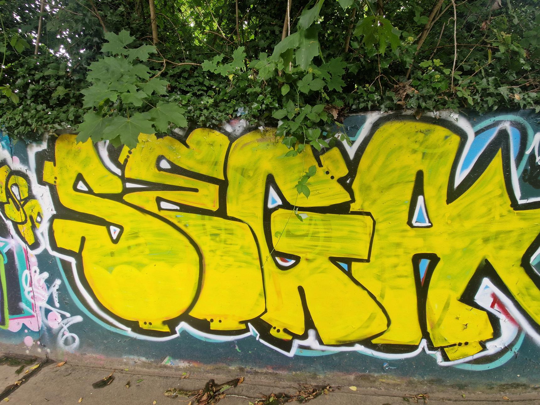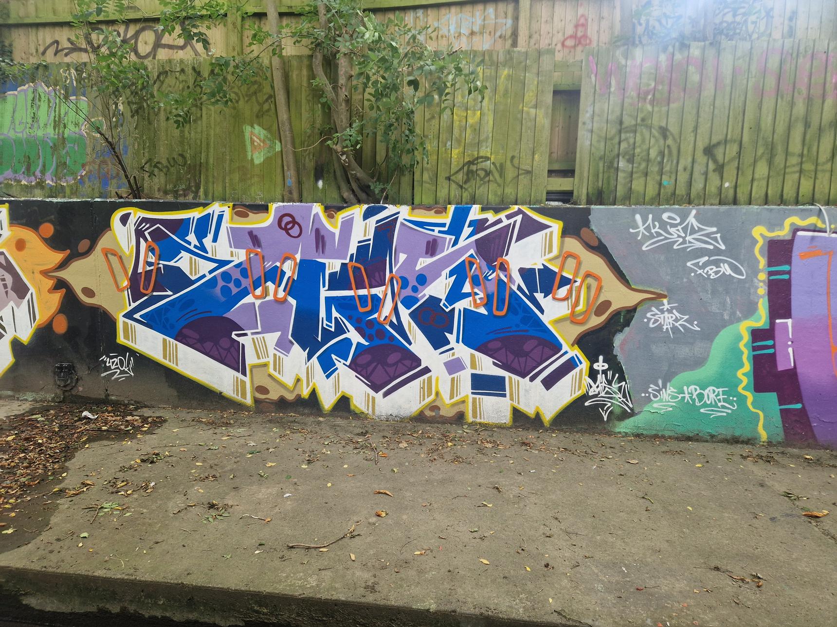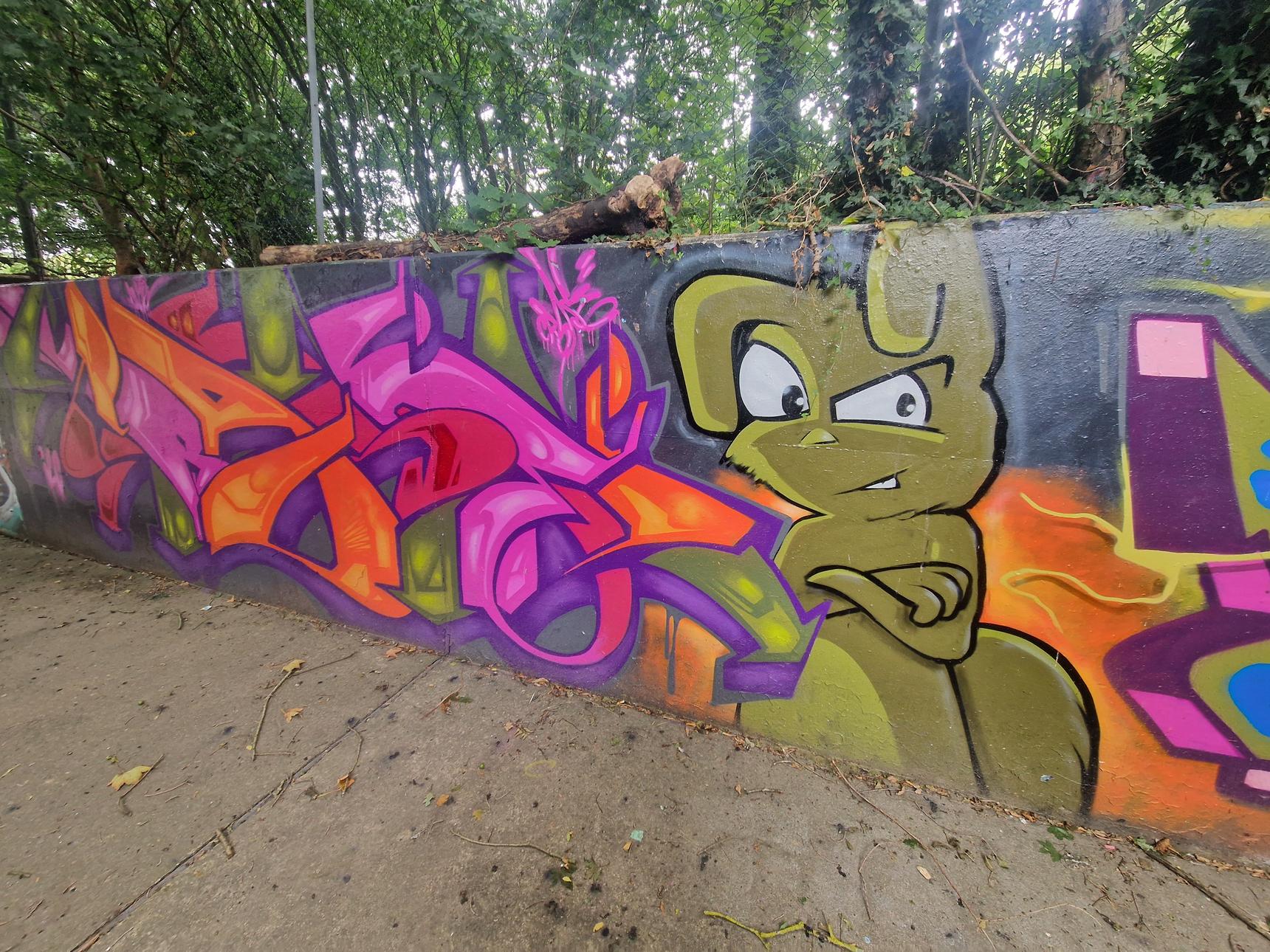 Legal spray paint location on the concrete walls of the storm drain, where Bushby Brook flows into Humberstone Park.