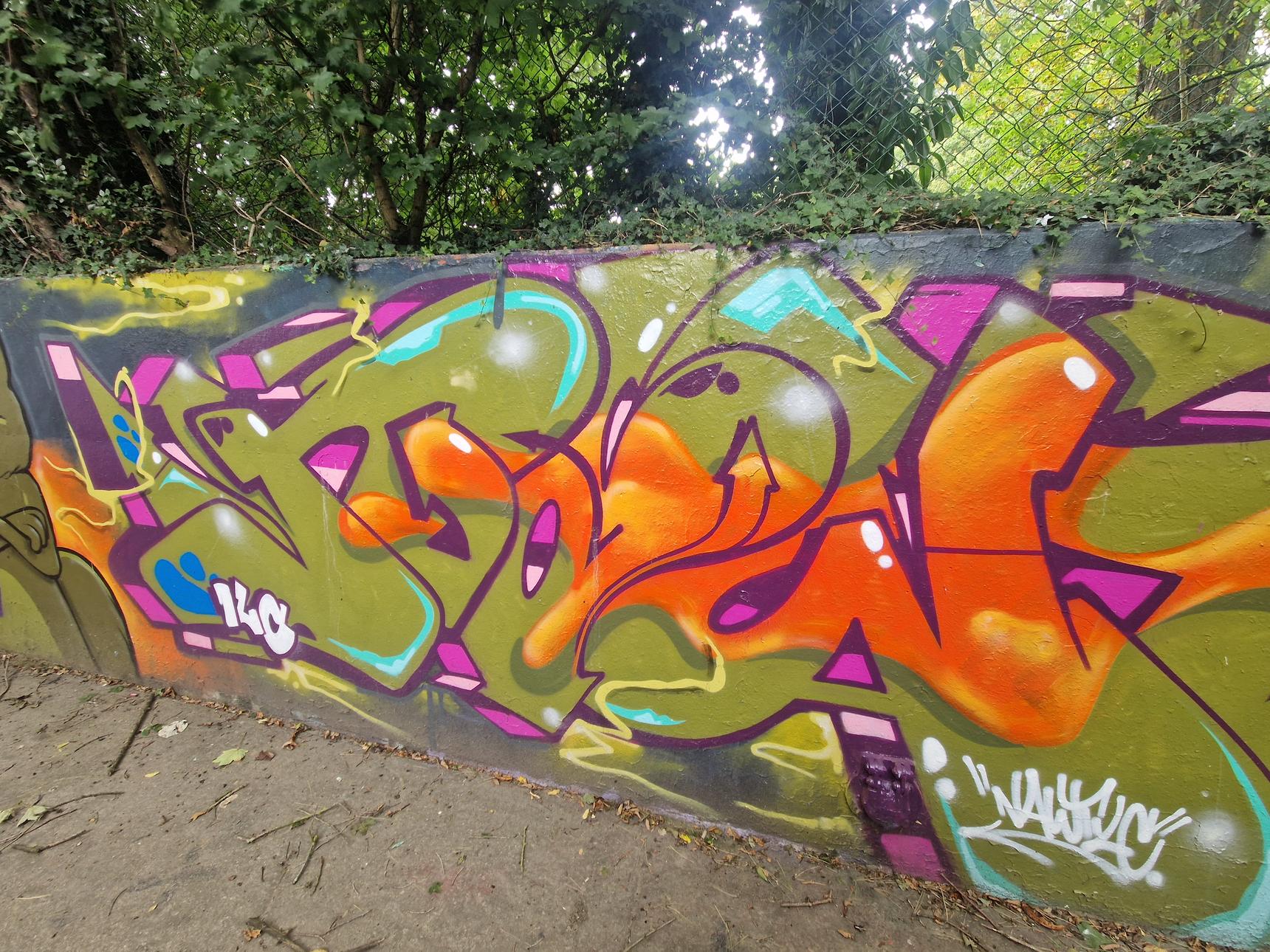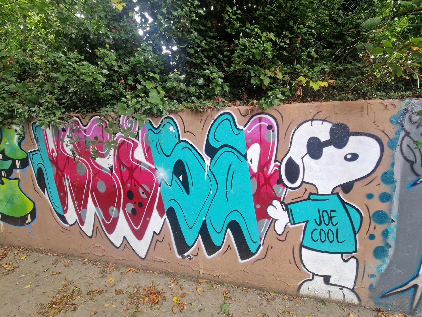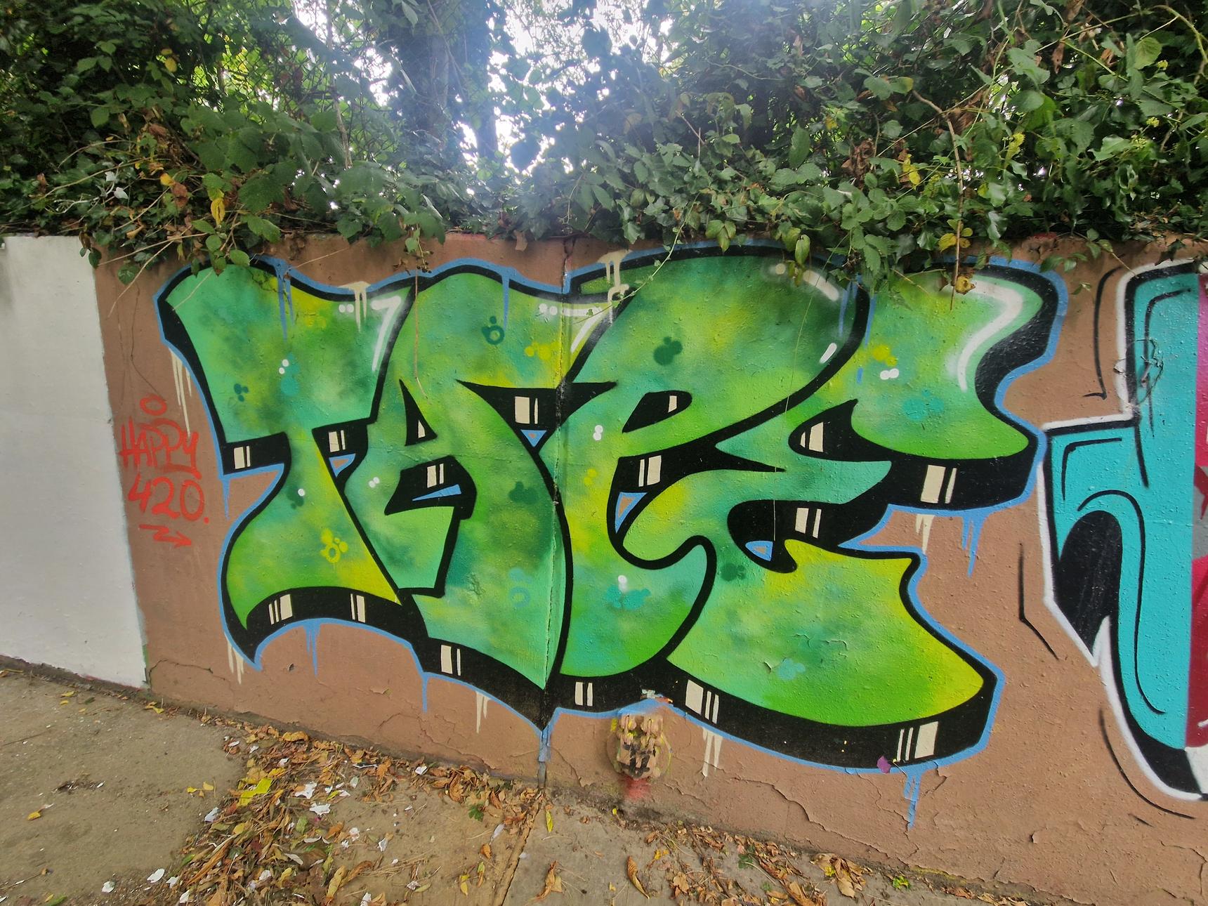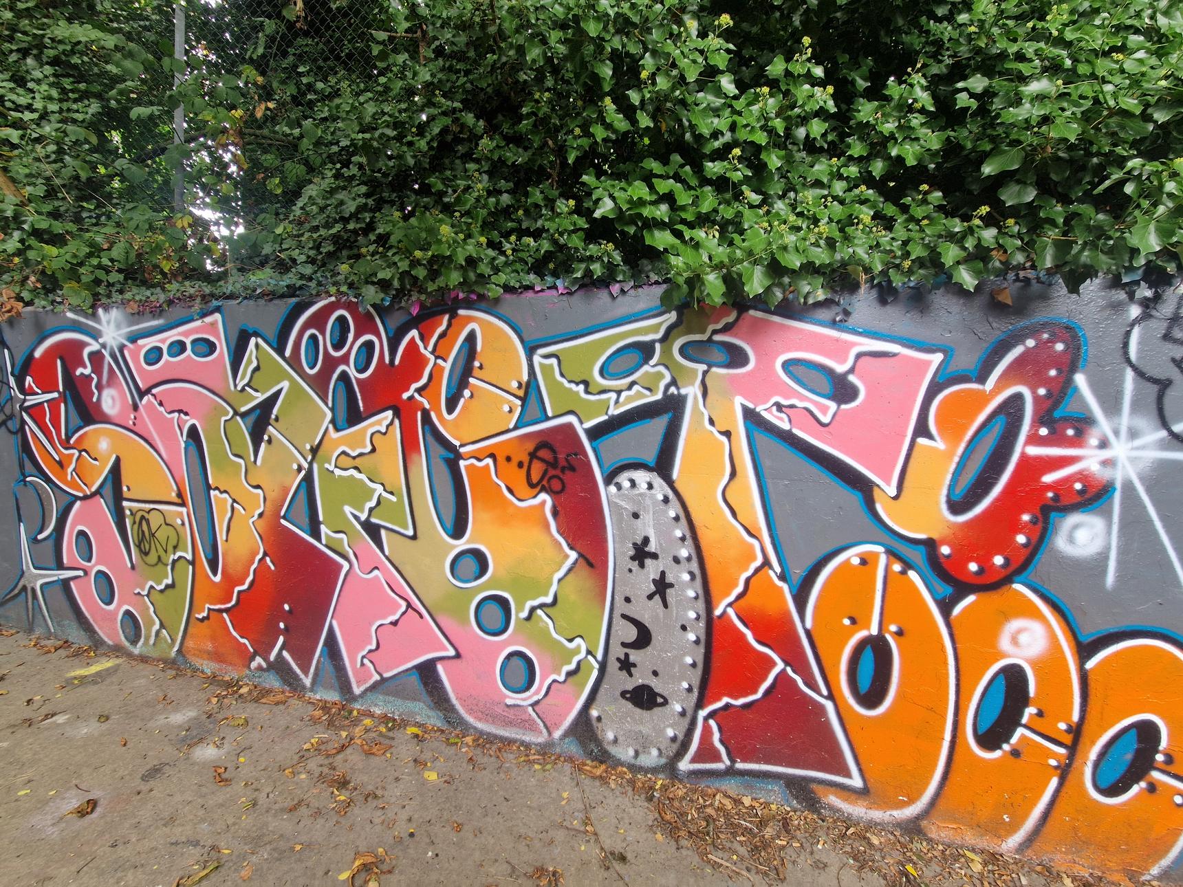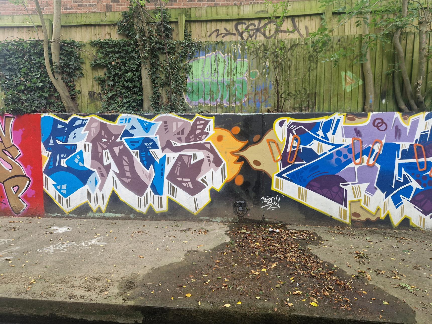 Legal spray paint location on the concrete walls of the storm drain, where Bushby Brook flows into Humberstone Park.