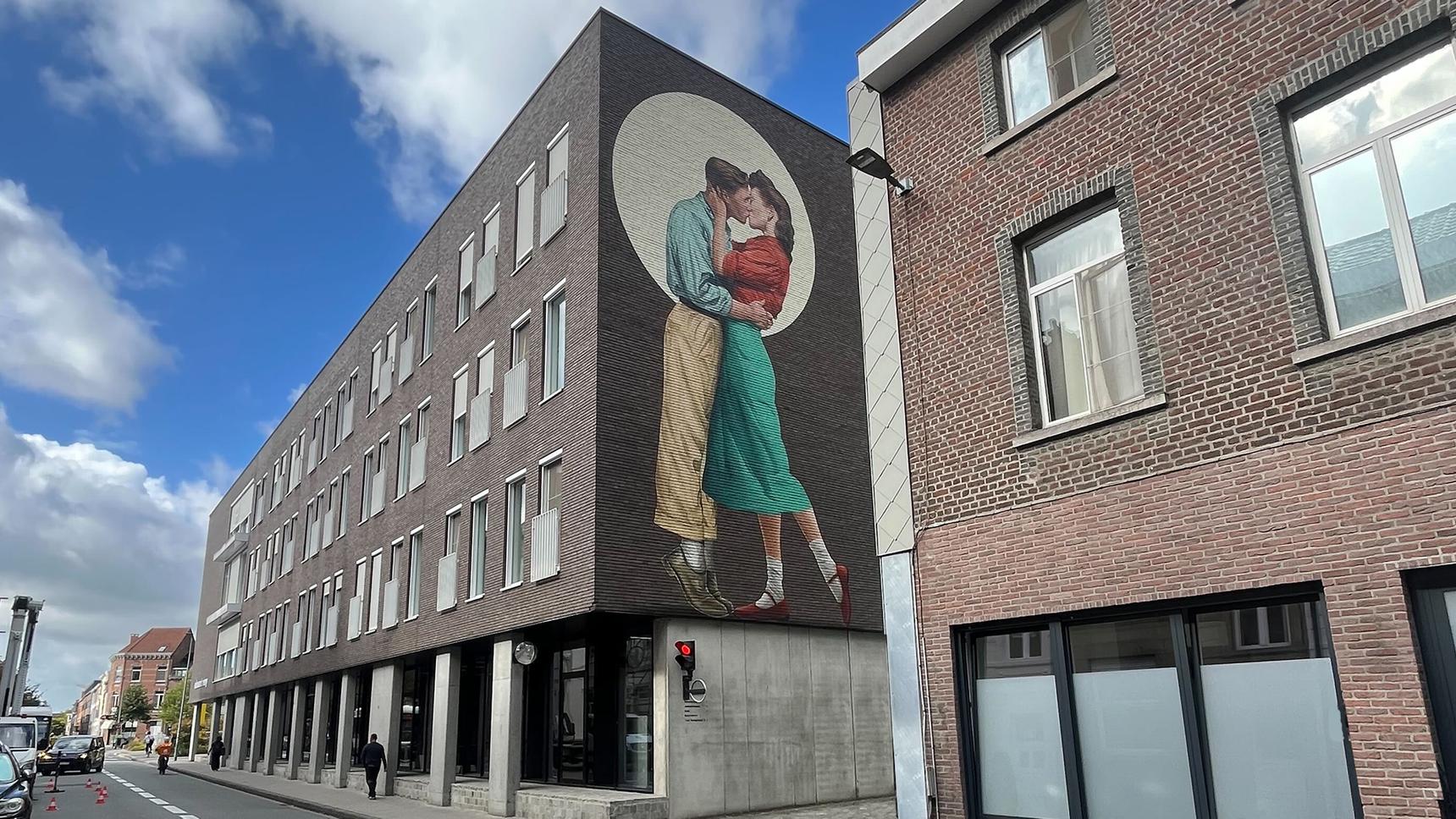 The mural depicts an intimate kiss between a couple, with the woman noticeably taller than the man — a powerful symbol of love, identity, and the breaking of social norms. The artwork refers to a little-known but troubling phenomenon in Belgium: from the 1950s until 2012, some girls were given growth inhibitors, not for medical reasons, but to make them a few centimeters shorter and supposedly more “feminine.”