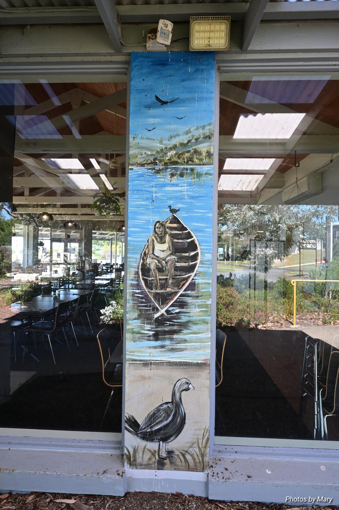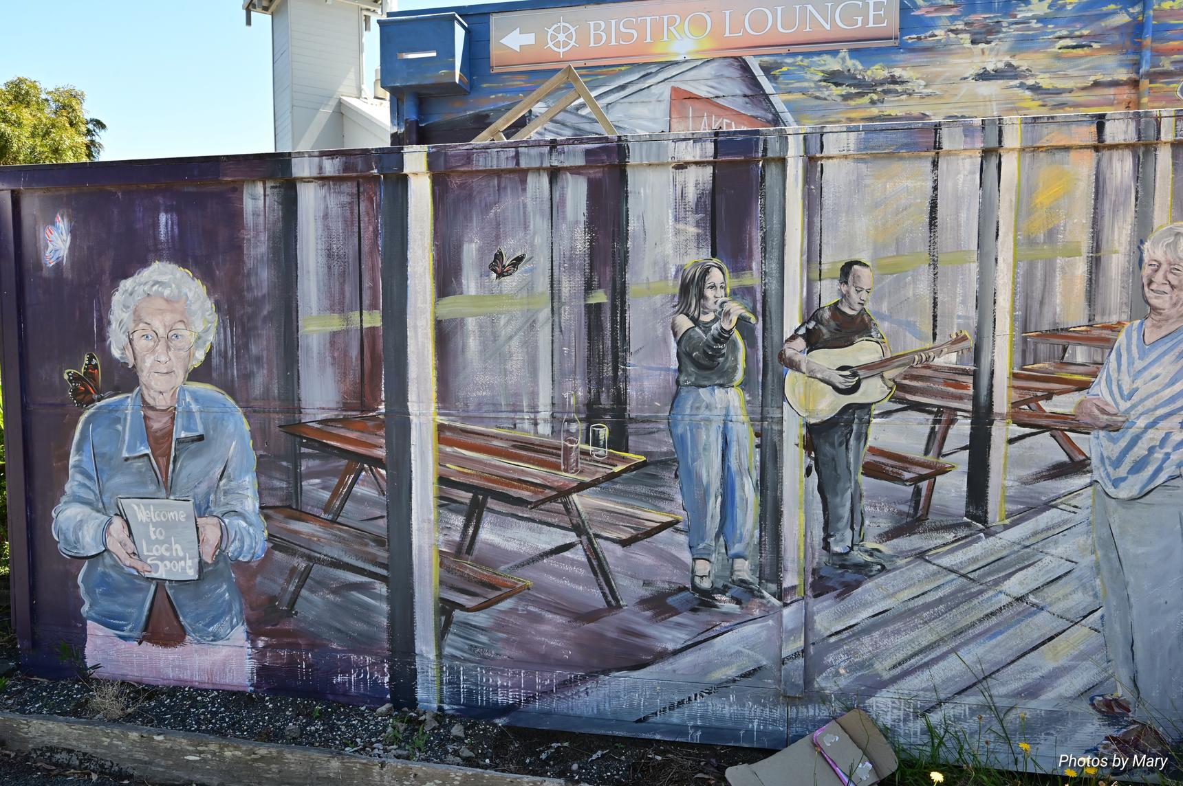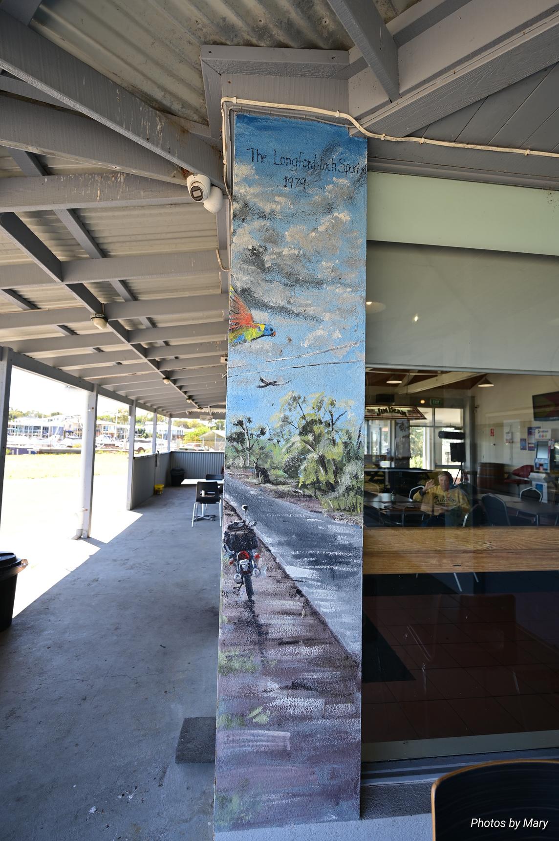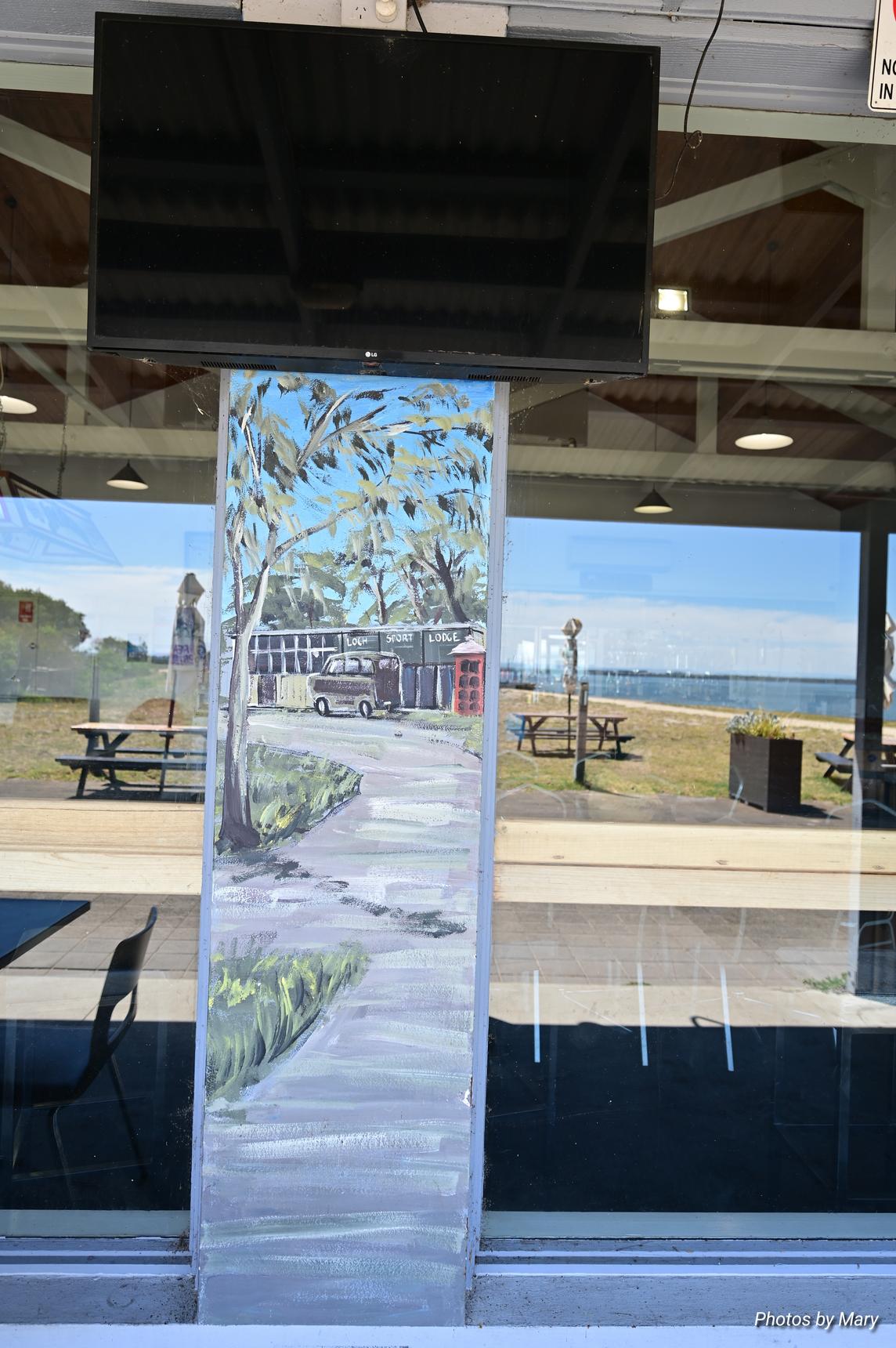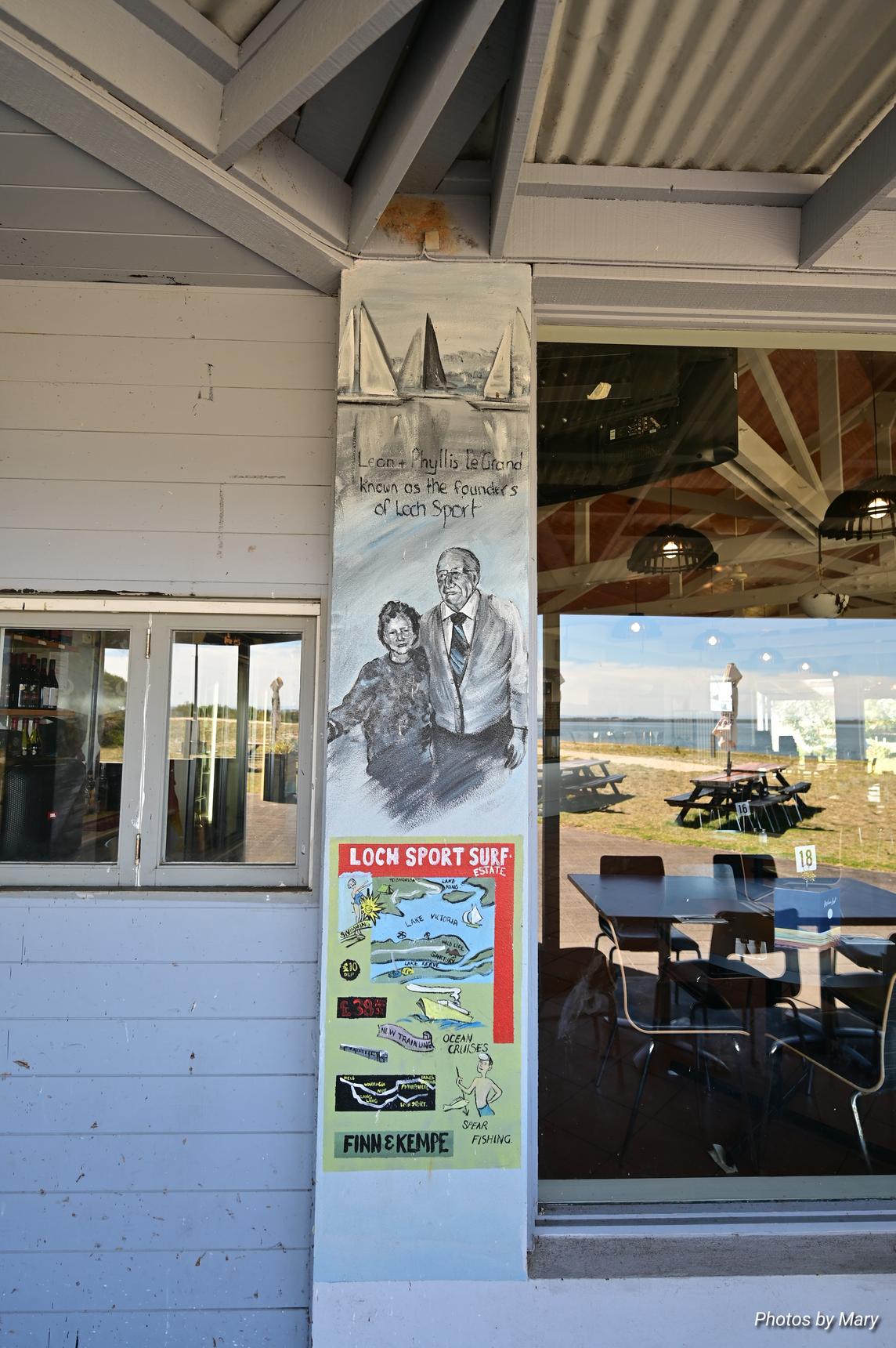 Murals are of various things seen in the Loch Sport area and are located on columns on the outside of the Lakeview Bar and Bistro.