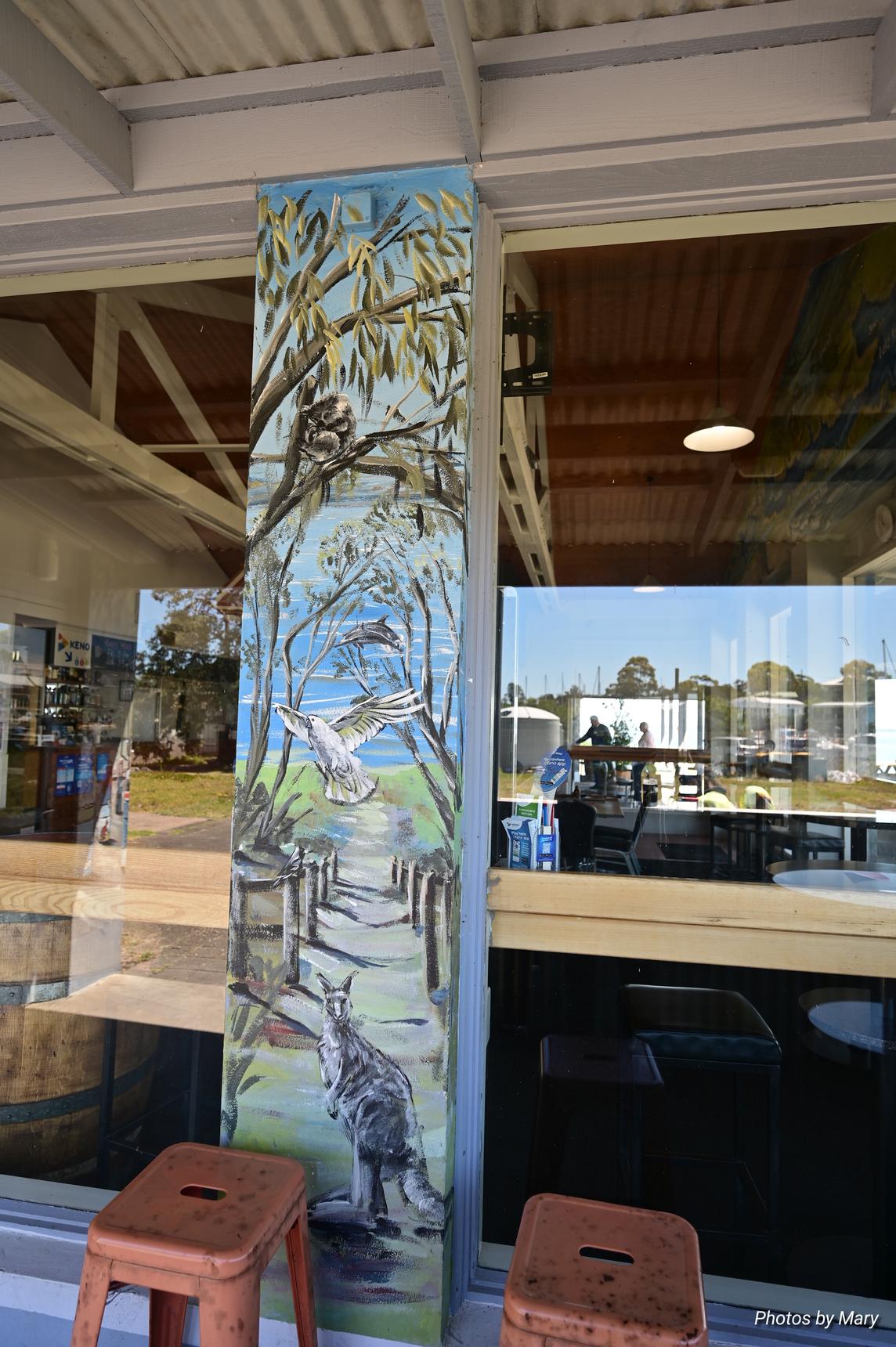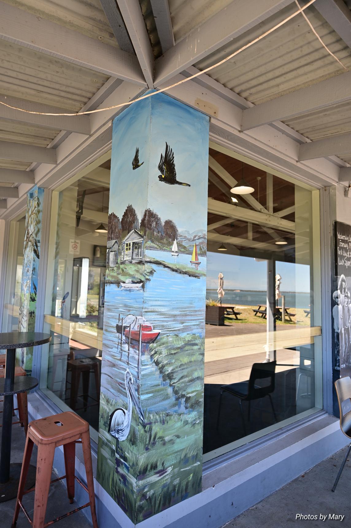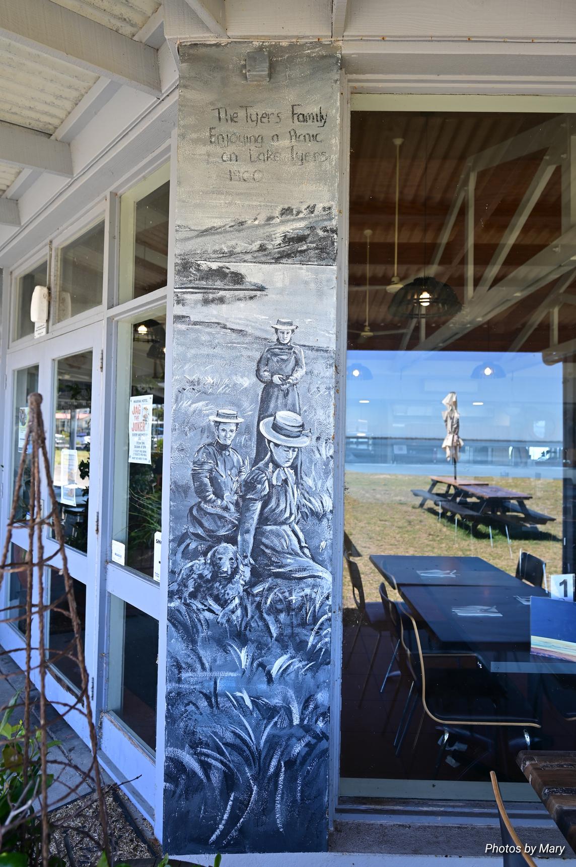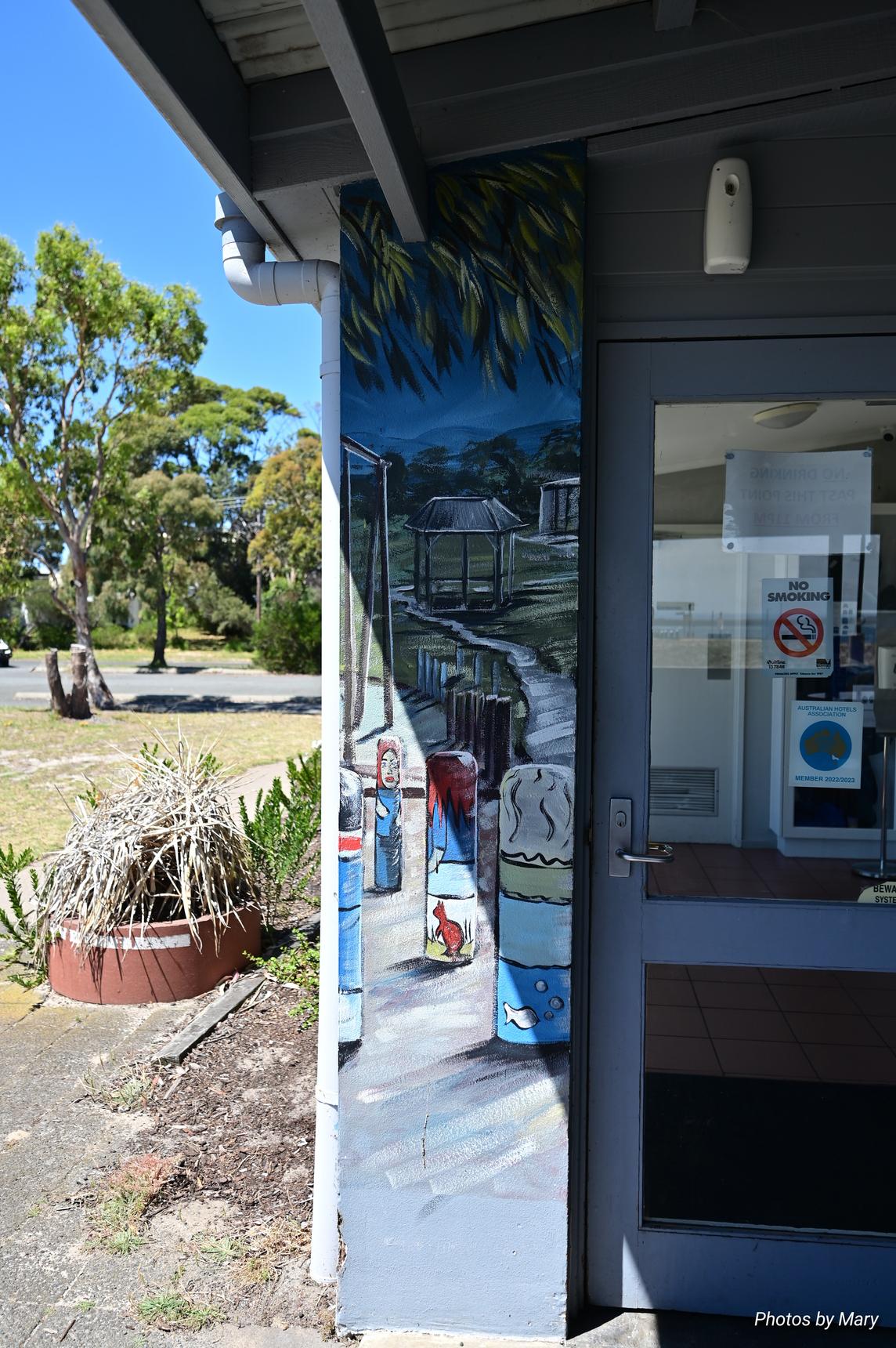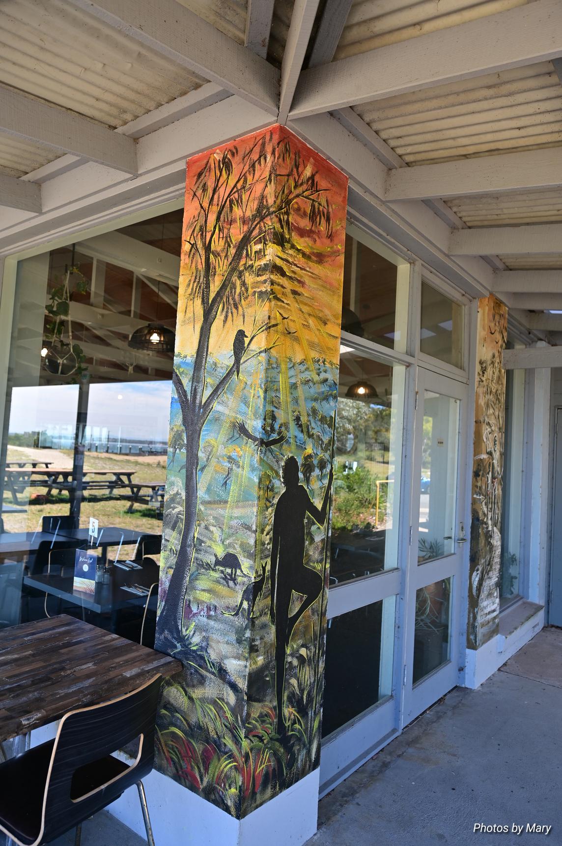 Murals are of various things seen in the Loch Sport area and are located on columns on the outside of the Lakeview Bar and Bistro.
